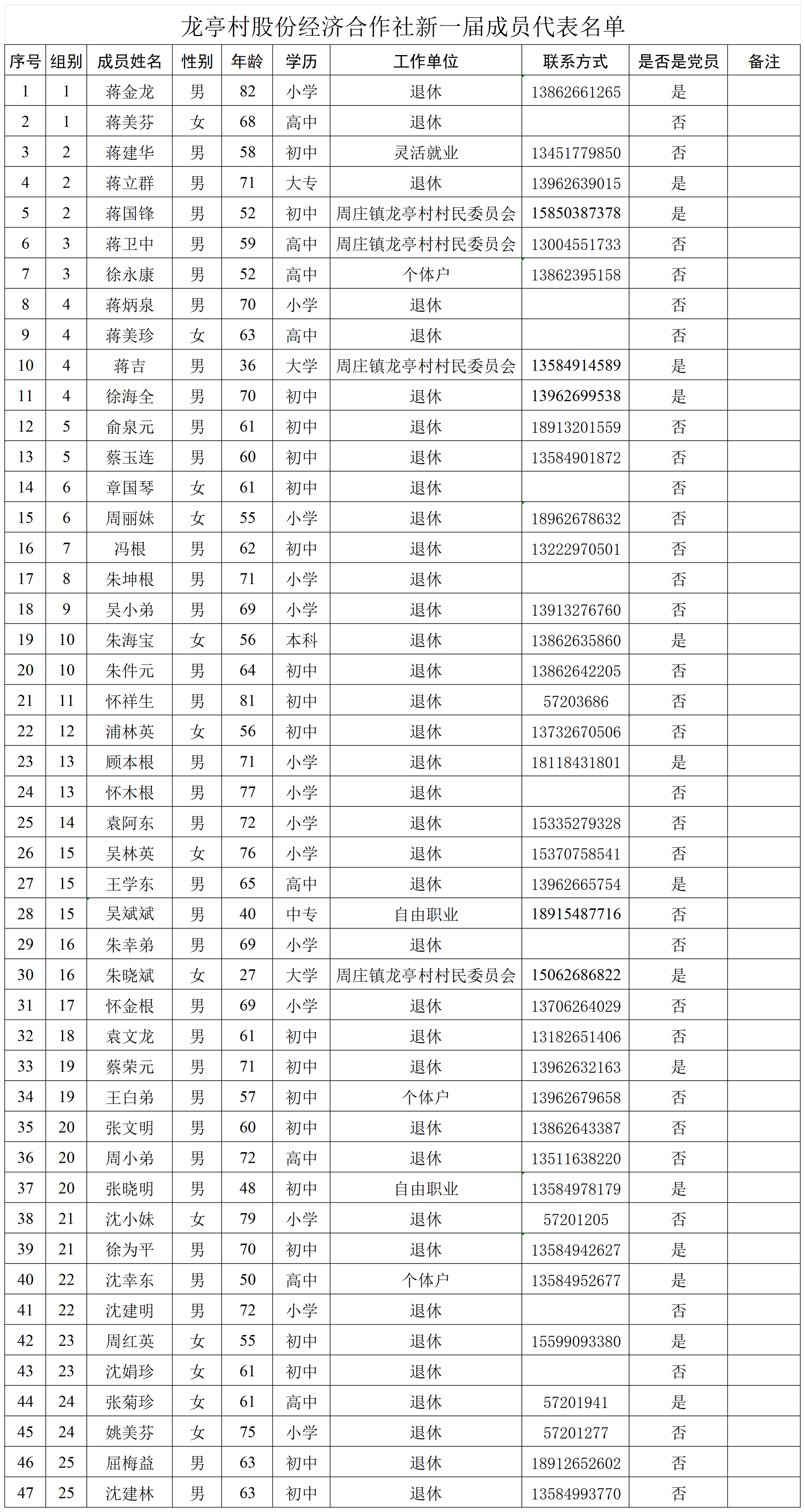 龙亭村股份经济合作社成员代表名单