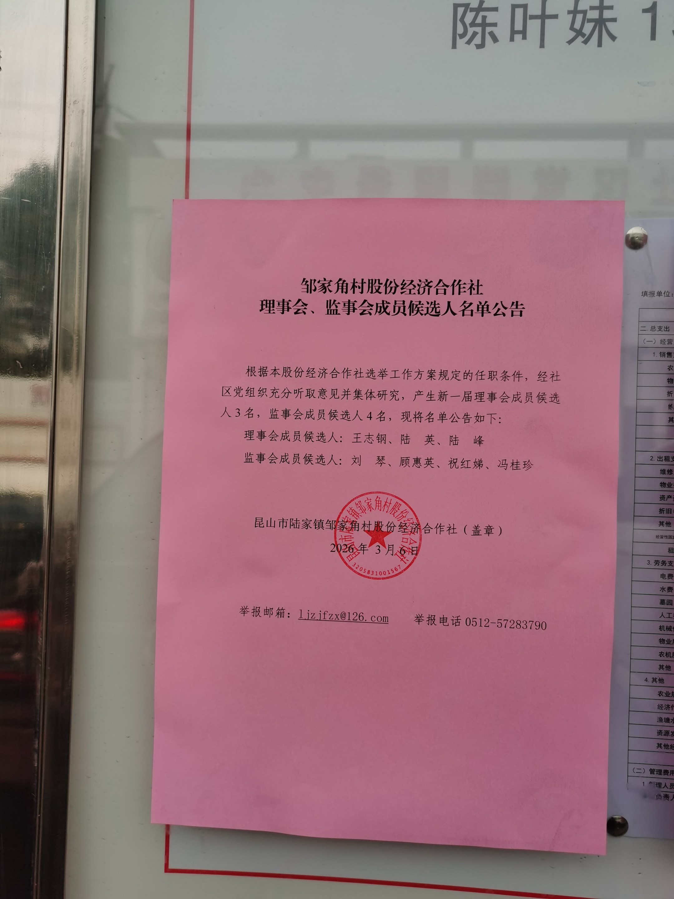 邹家角村股份经济合作社理事会、监事会成员候选人名单公告
