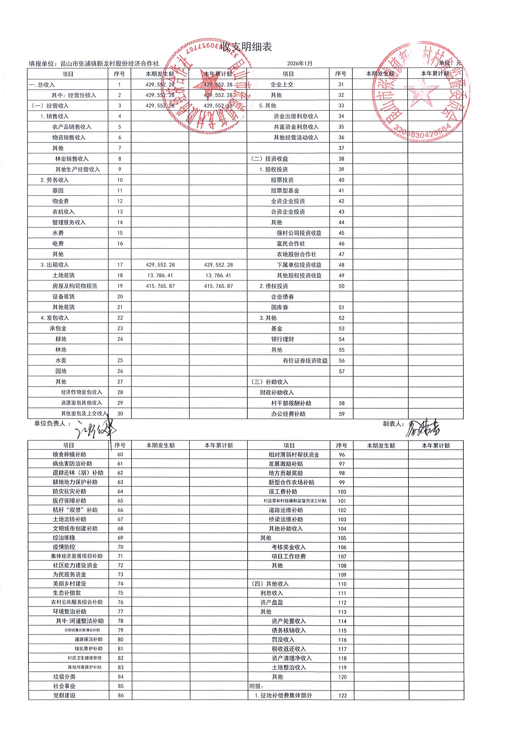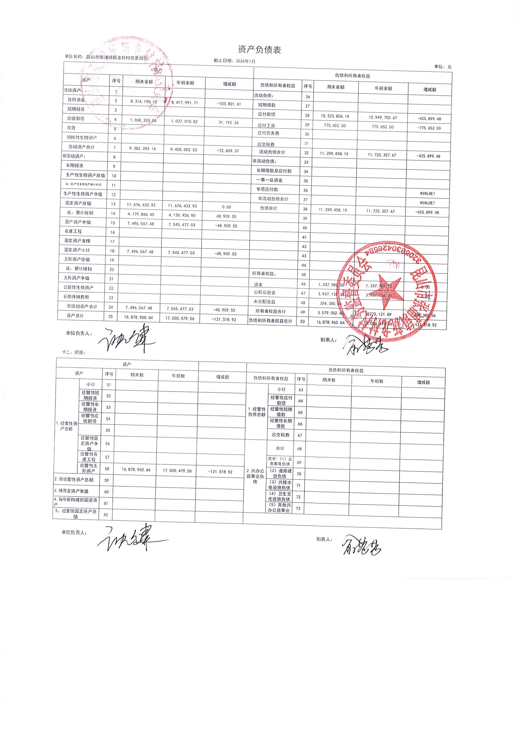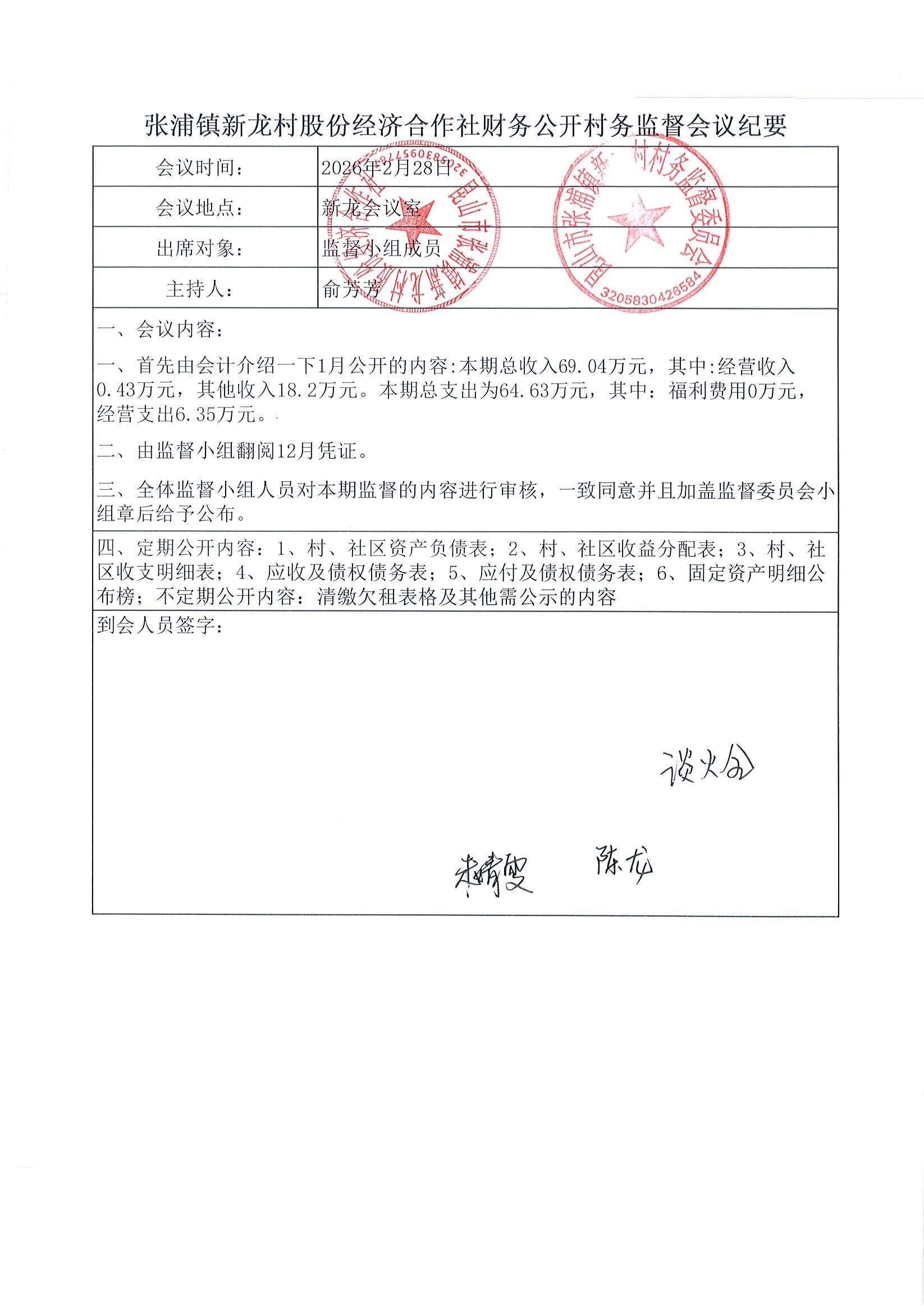 2026年张浦镇新龙村股份经济合作社1月财务公开