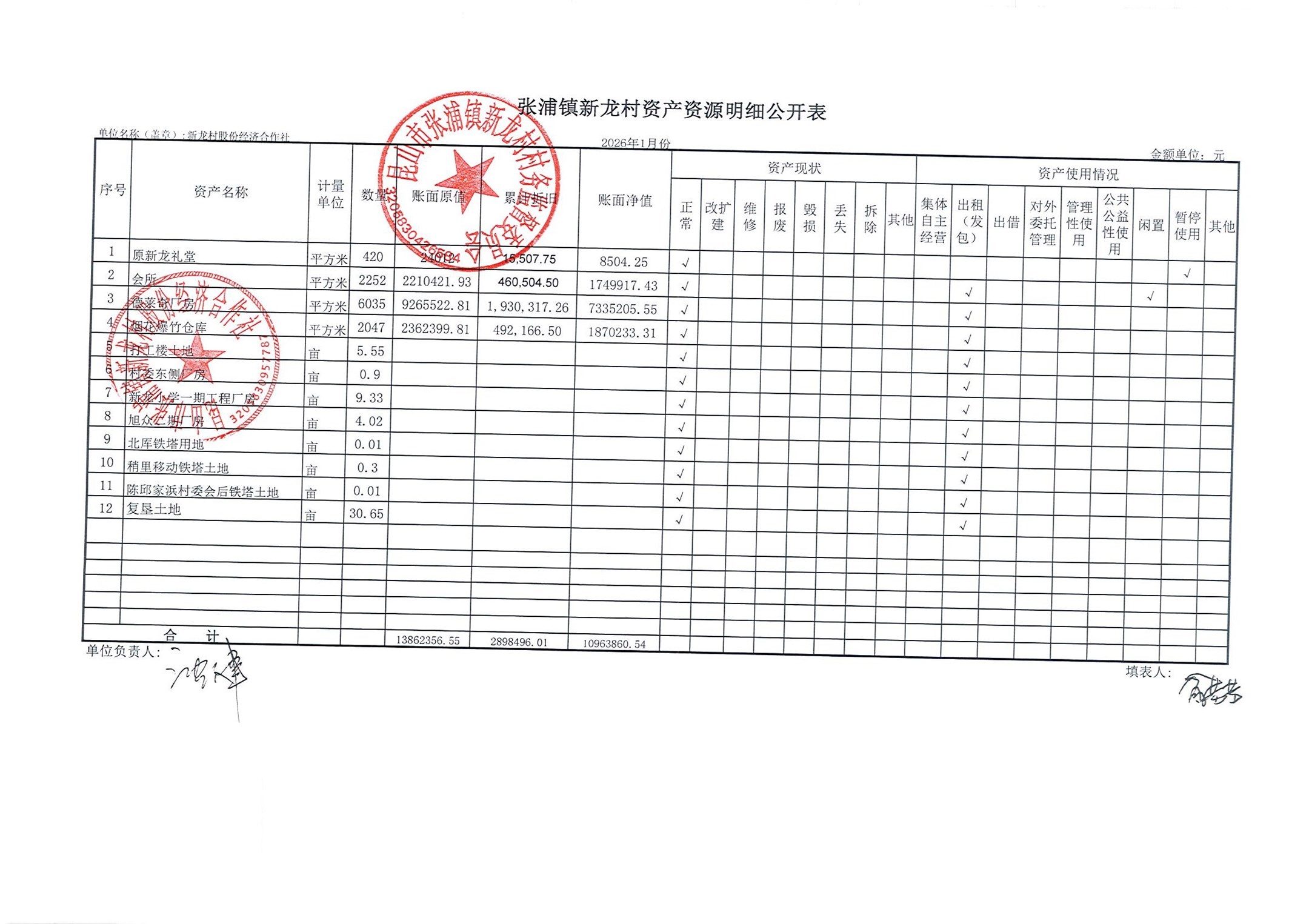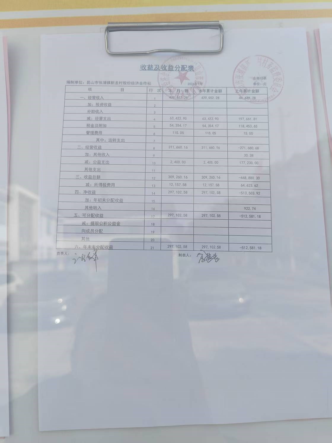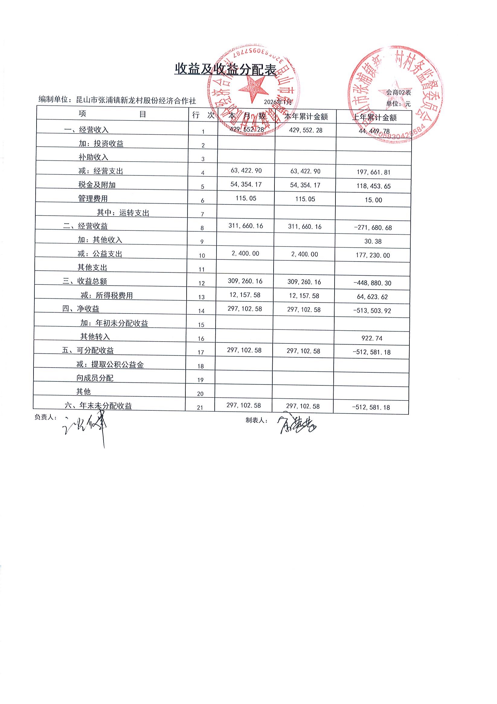 2026年张浦镇新龙村股份经济合作社1月财务公开