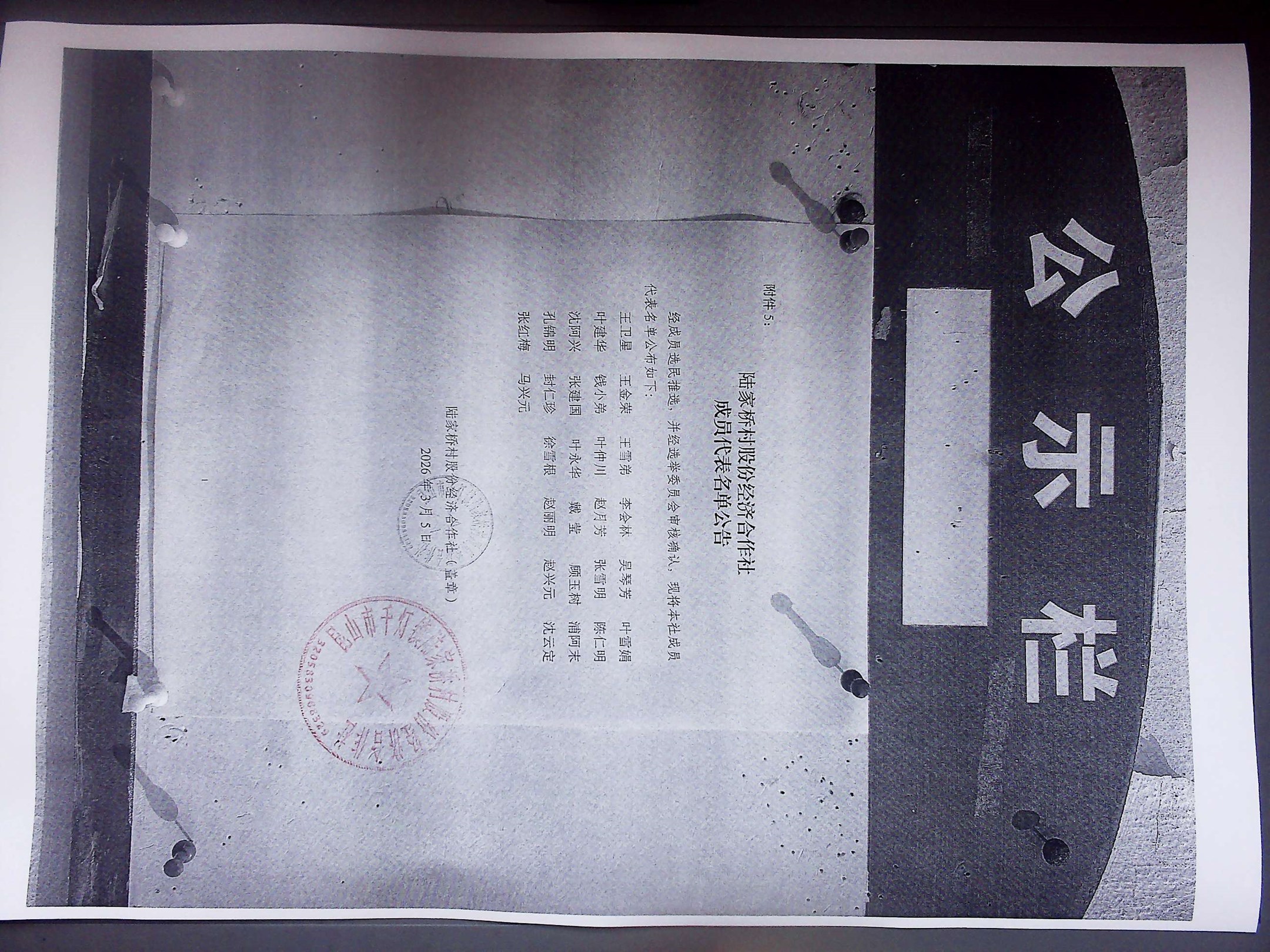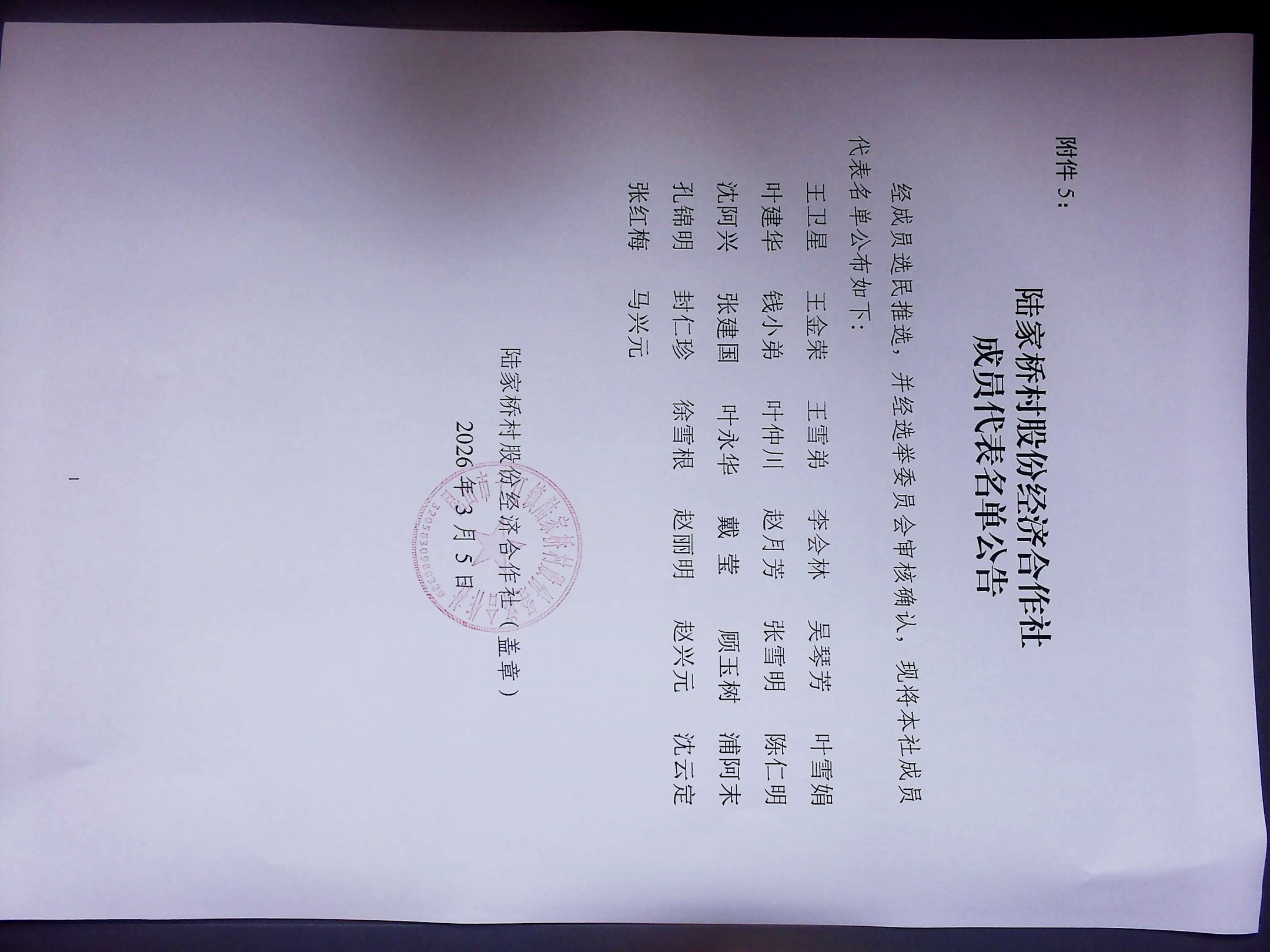 2026年陆家桥村股份经济合作社换届选举成员代表公示