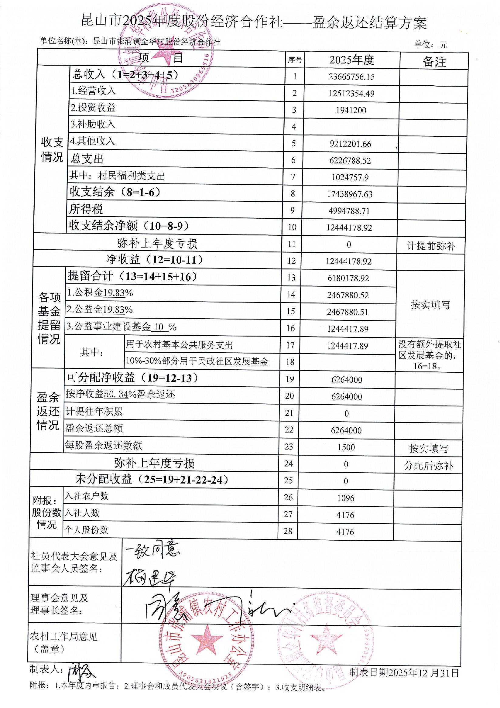 2025年股份经济合作社盈余返还结算方案