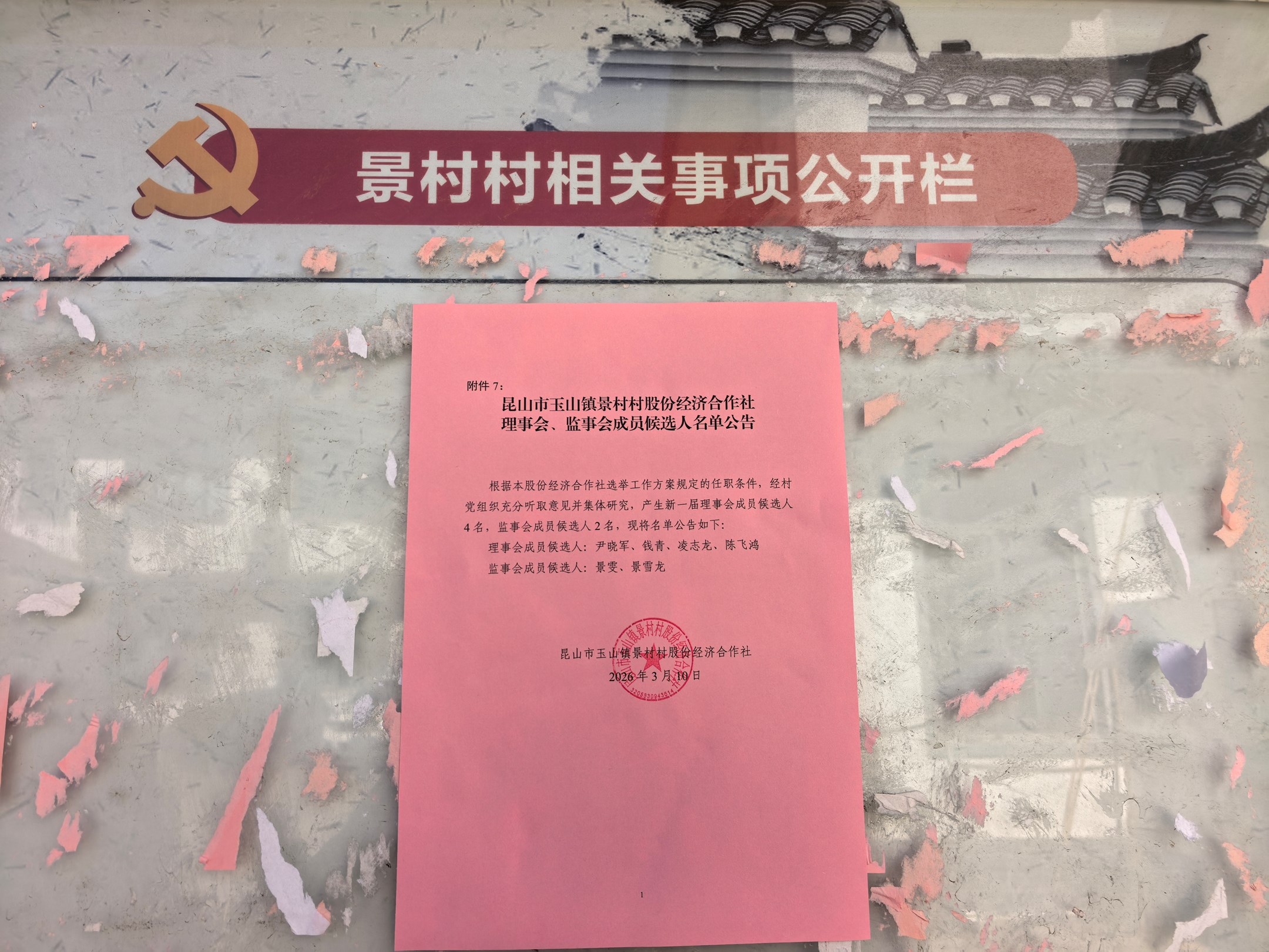 昆山市玉山镇景村村股份经济合作社理事会、监事会成员候选人名单公告