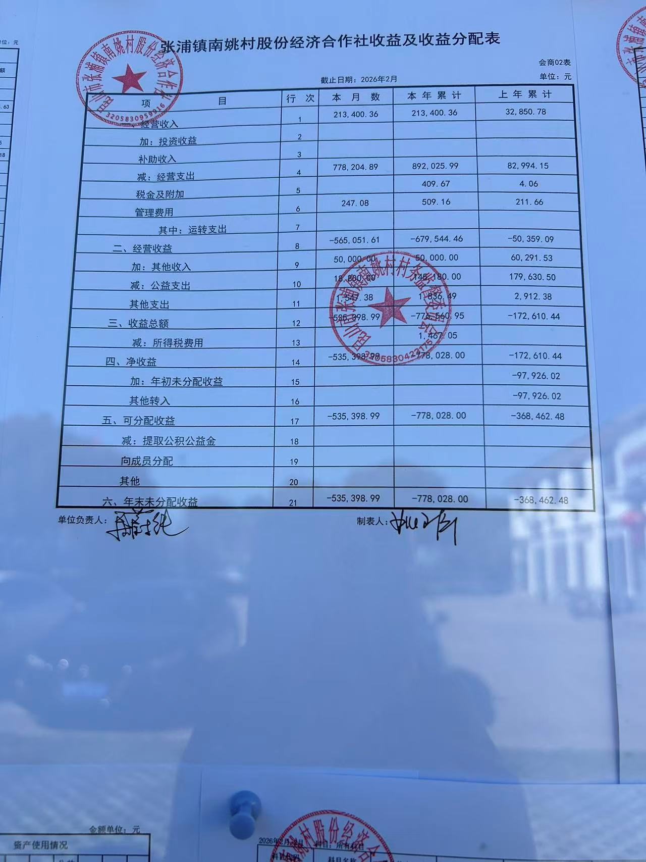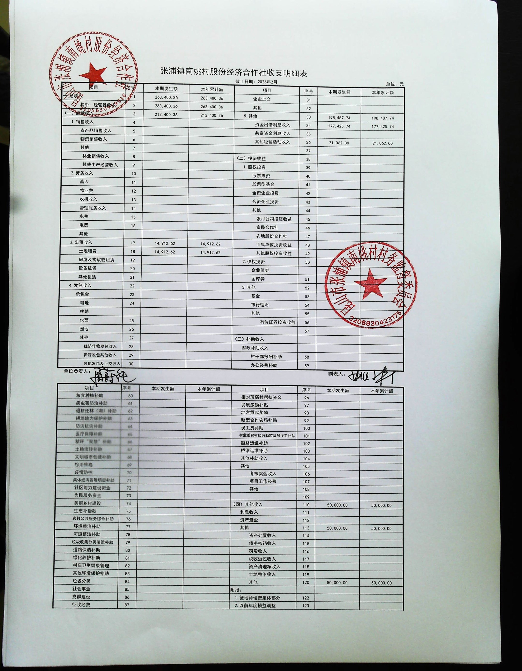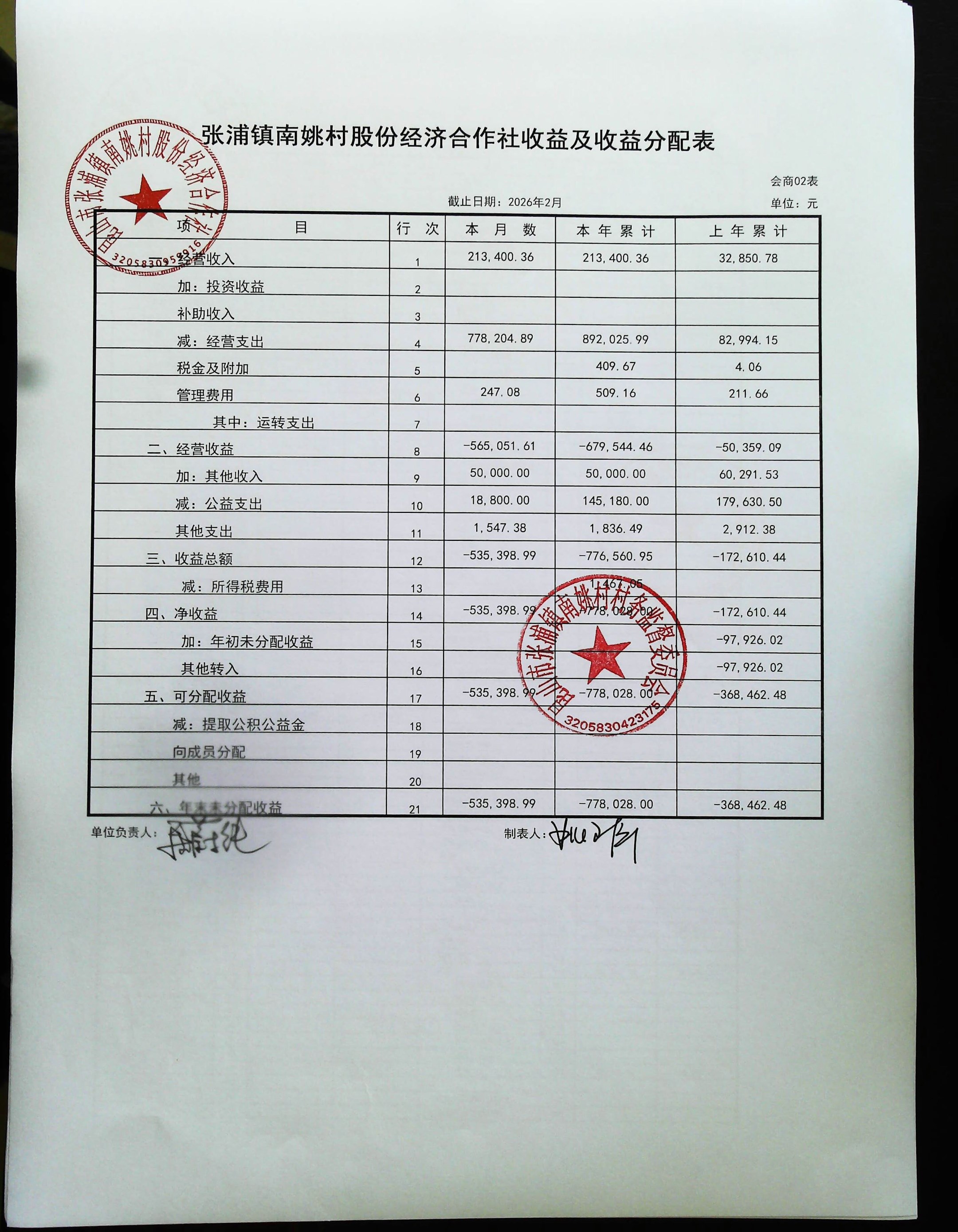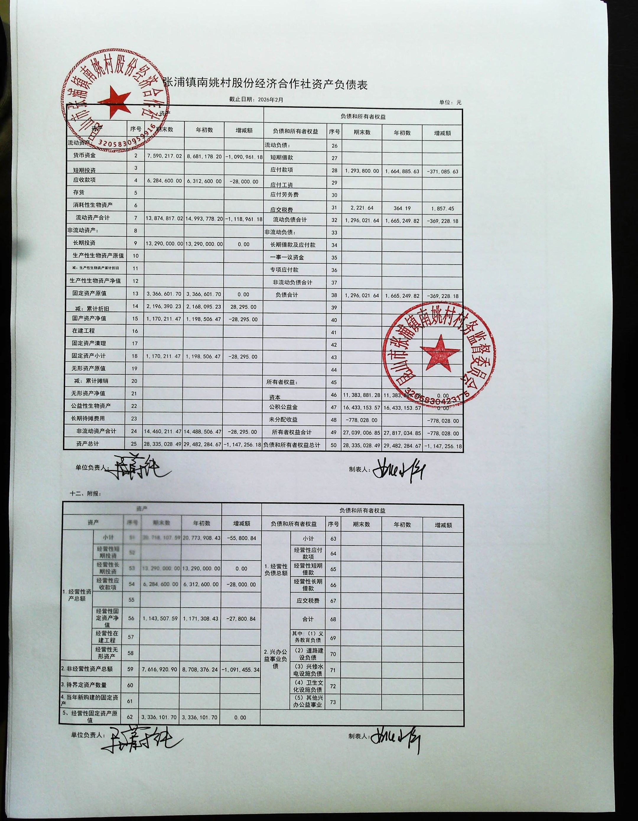 2026年2月南姚村股份经济财务公开