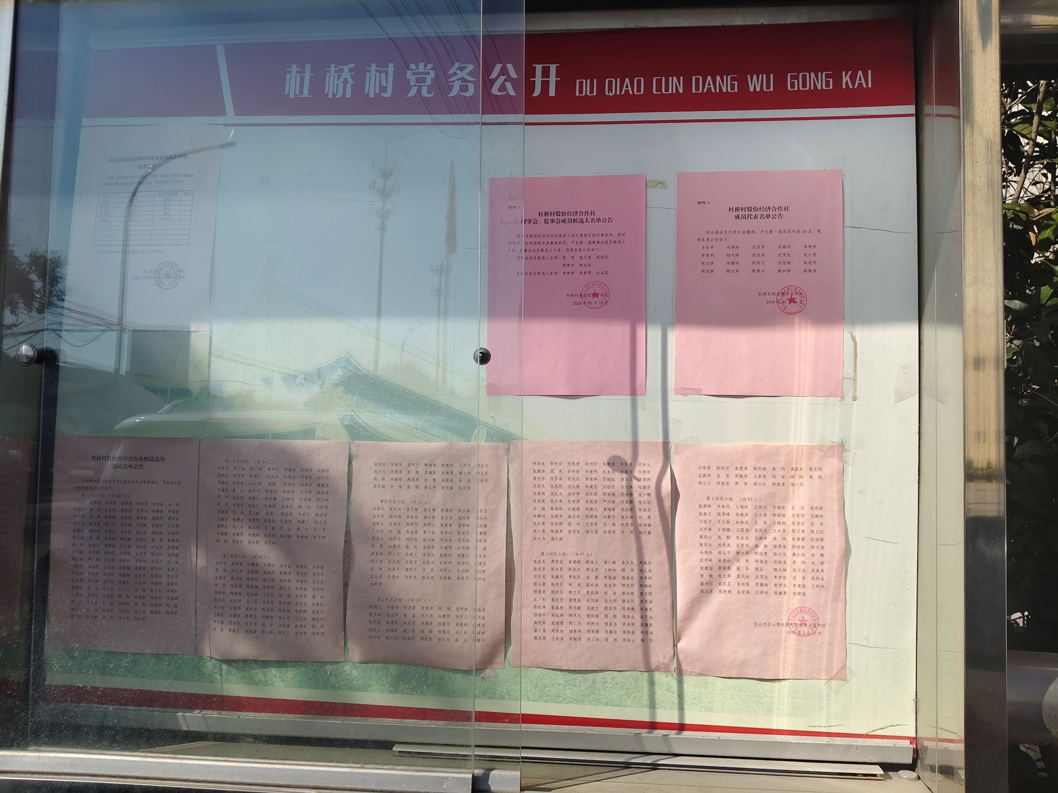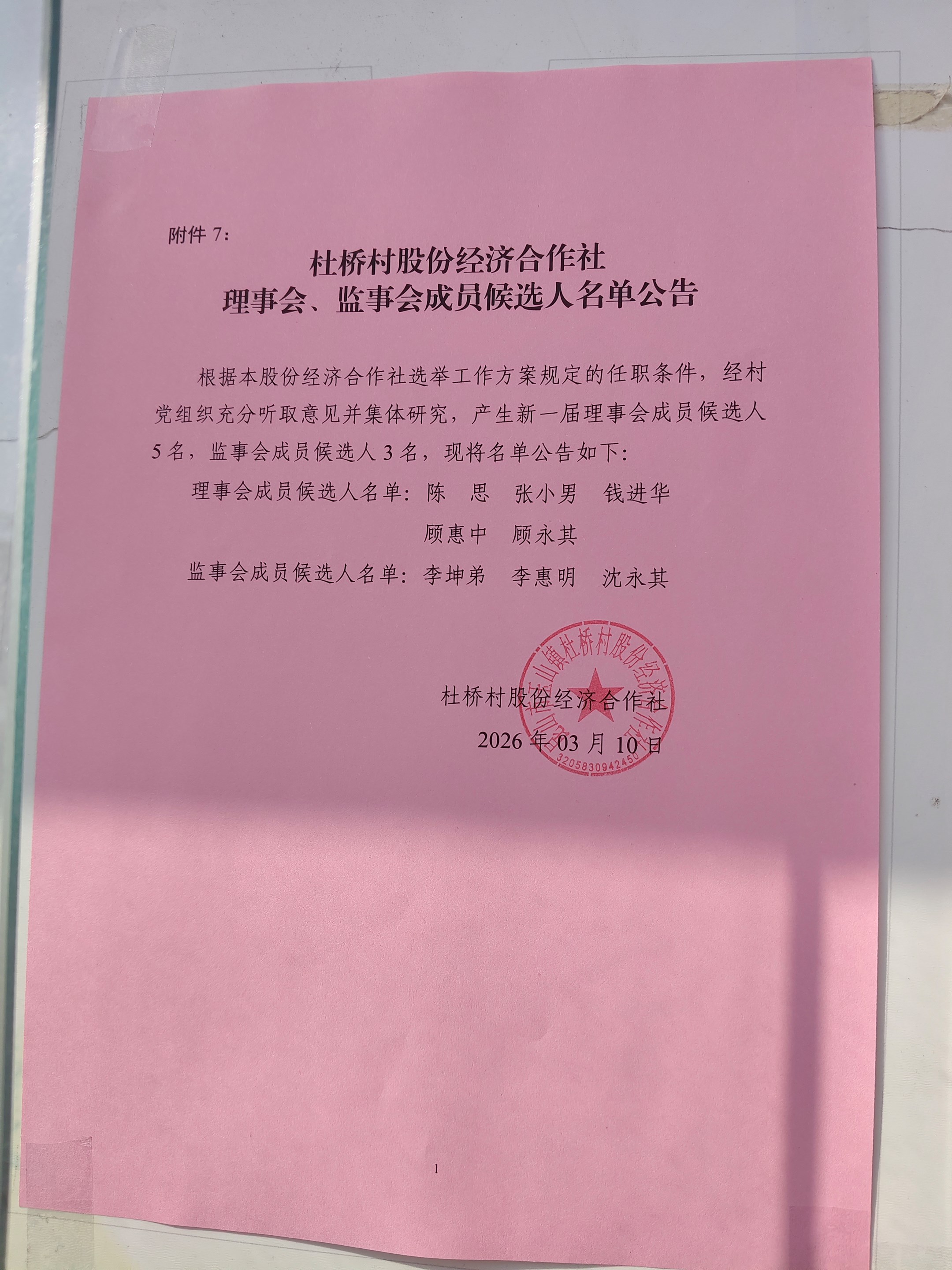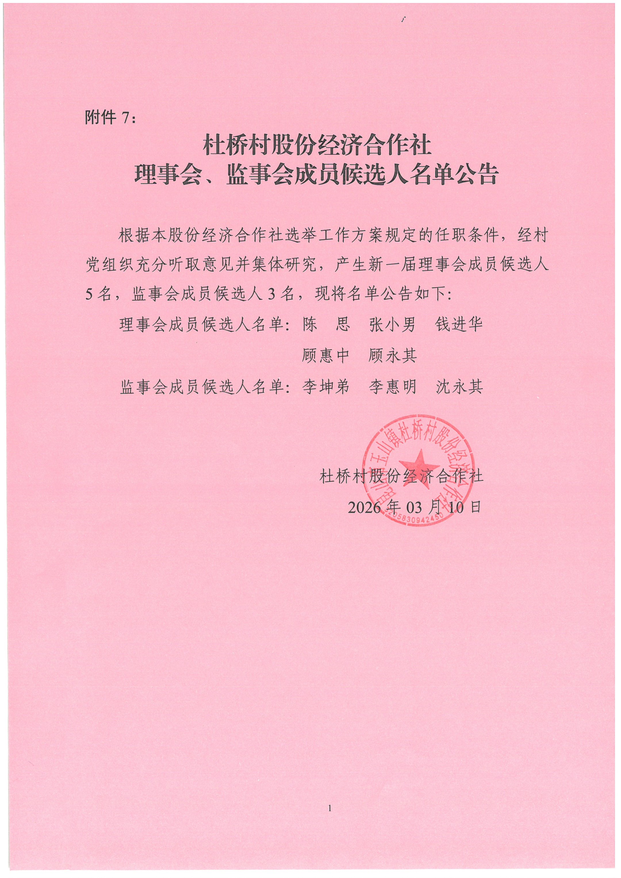 杜桥村股份经济合作社理事会、监事会成员候选人名单公告