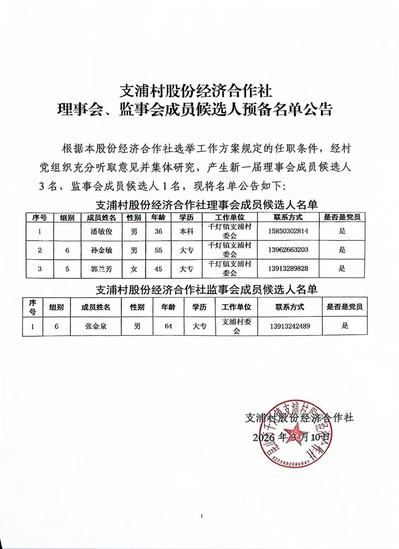 支浦村股份经济合作社 理事会、监事会成员候选人预备名单公告