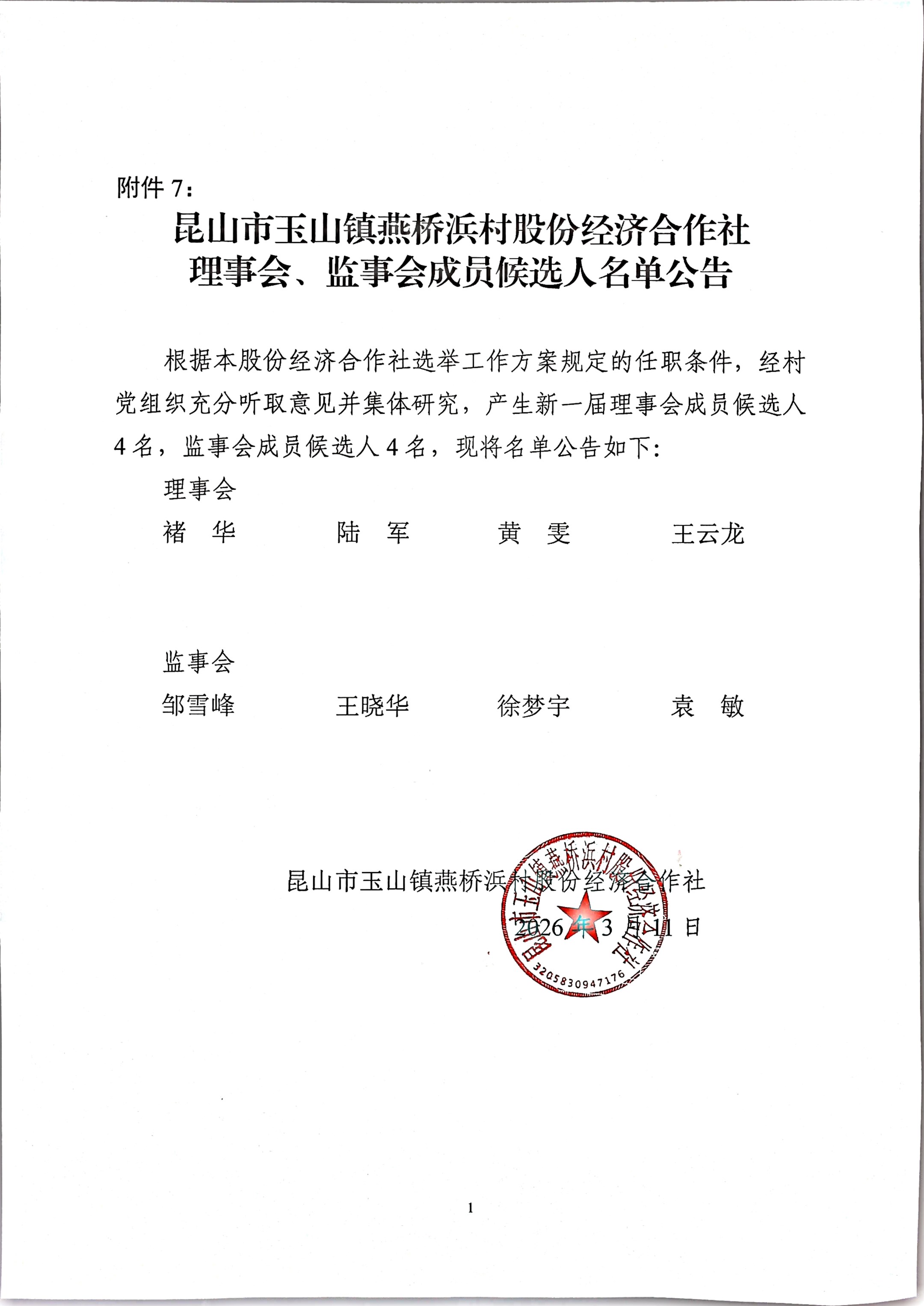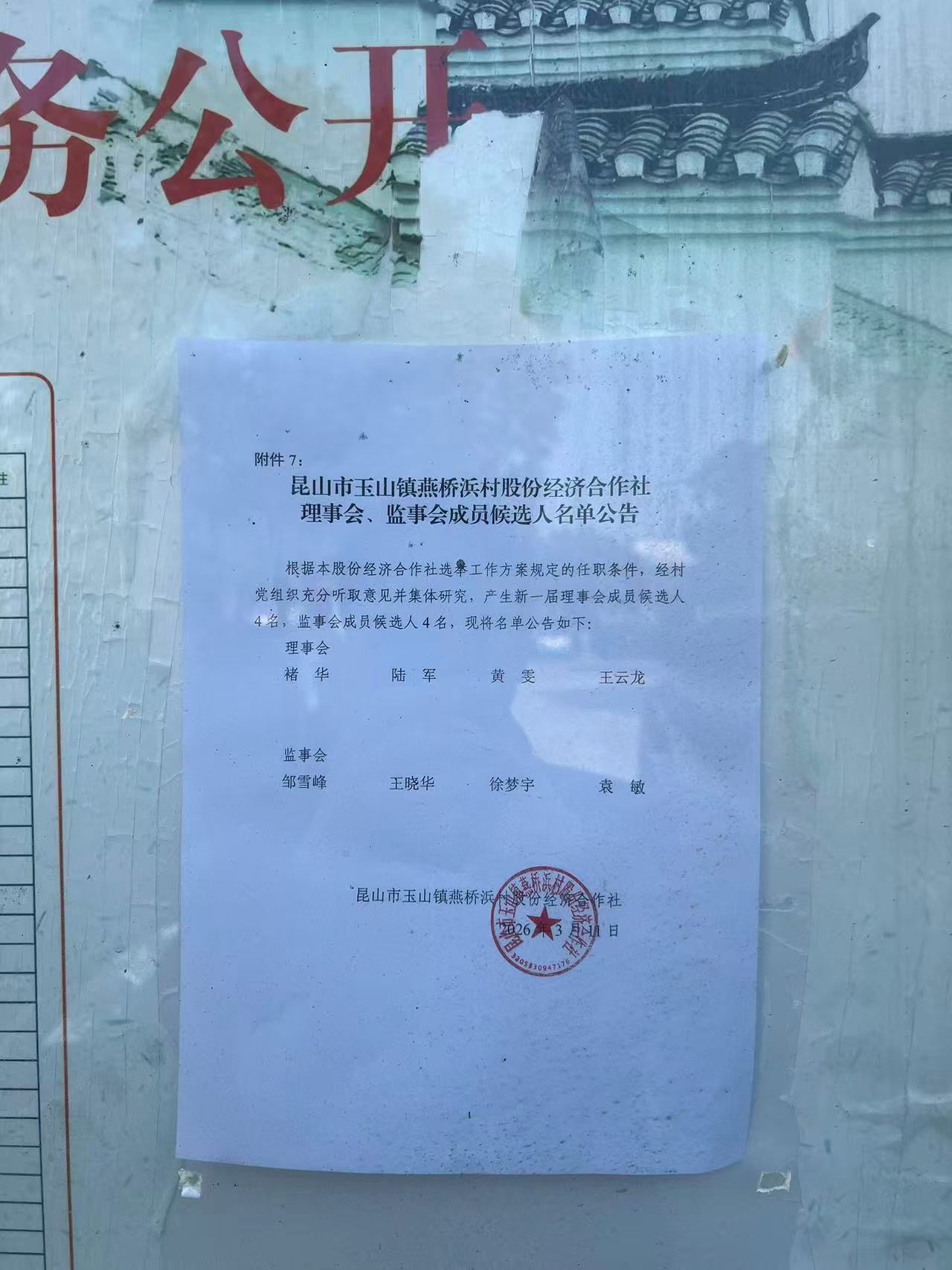 昆山市玉山镇燕桥浜村股份经济合作社选举理事会、监事会成员候选人名单公告