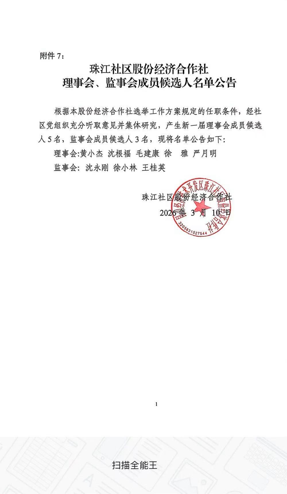 珠江经济合作社理事会、监事会成员候选人名单公告