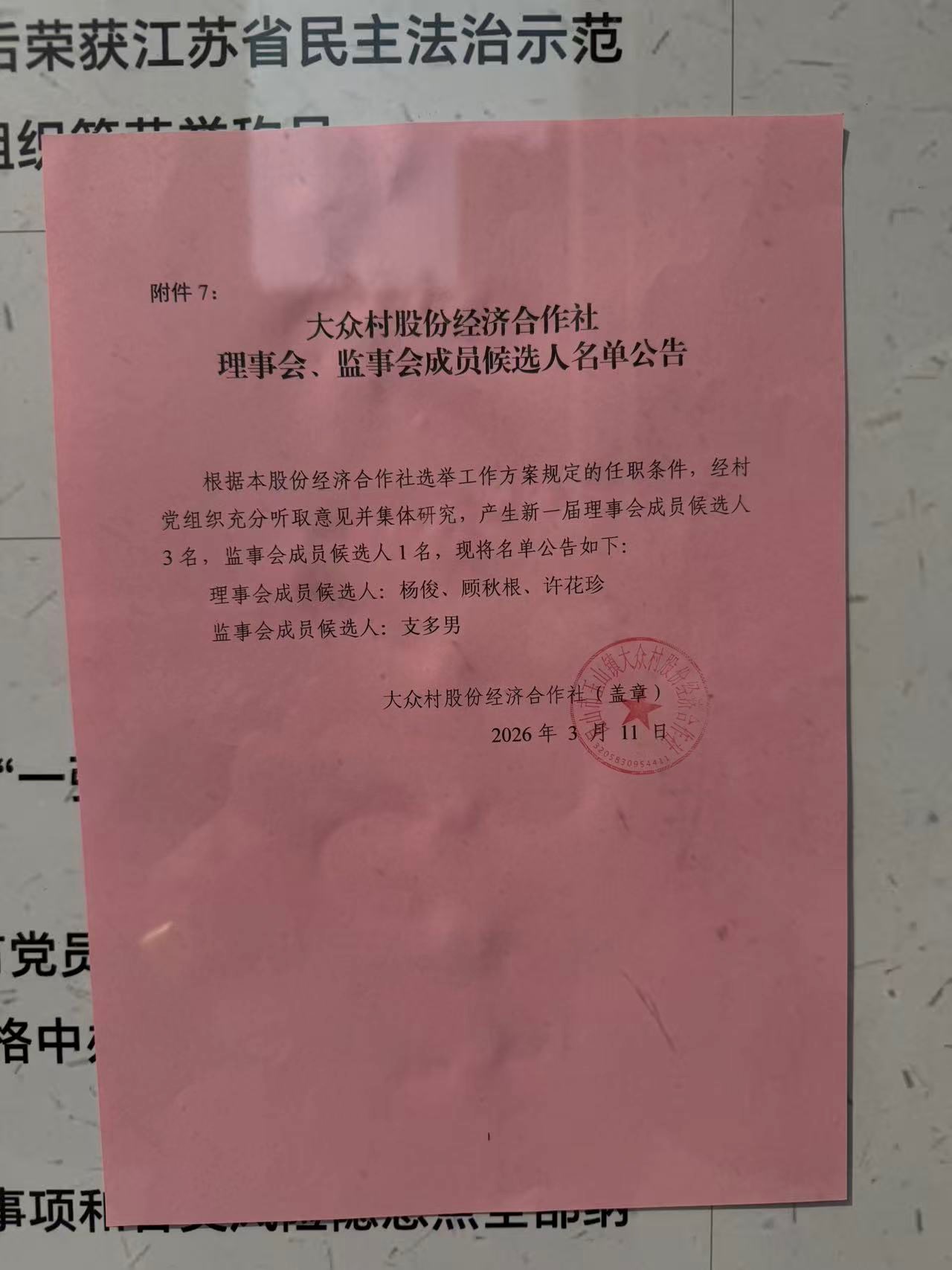 大众村股份经济合作社 理事会、监事会成员候选人名单公告