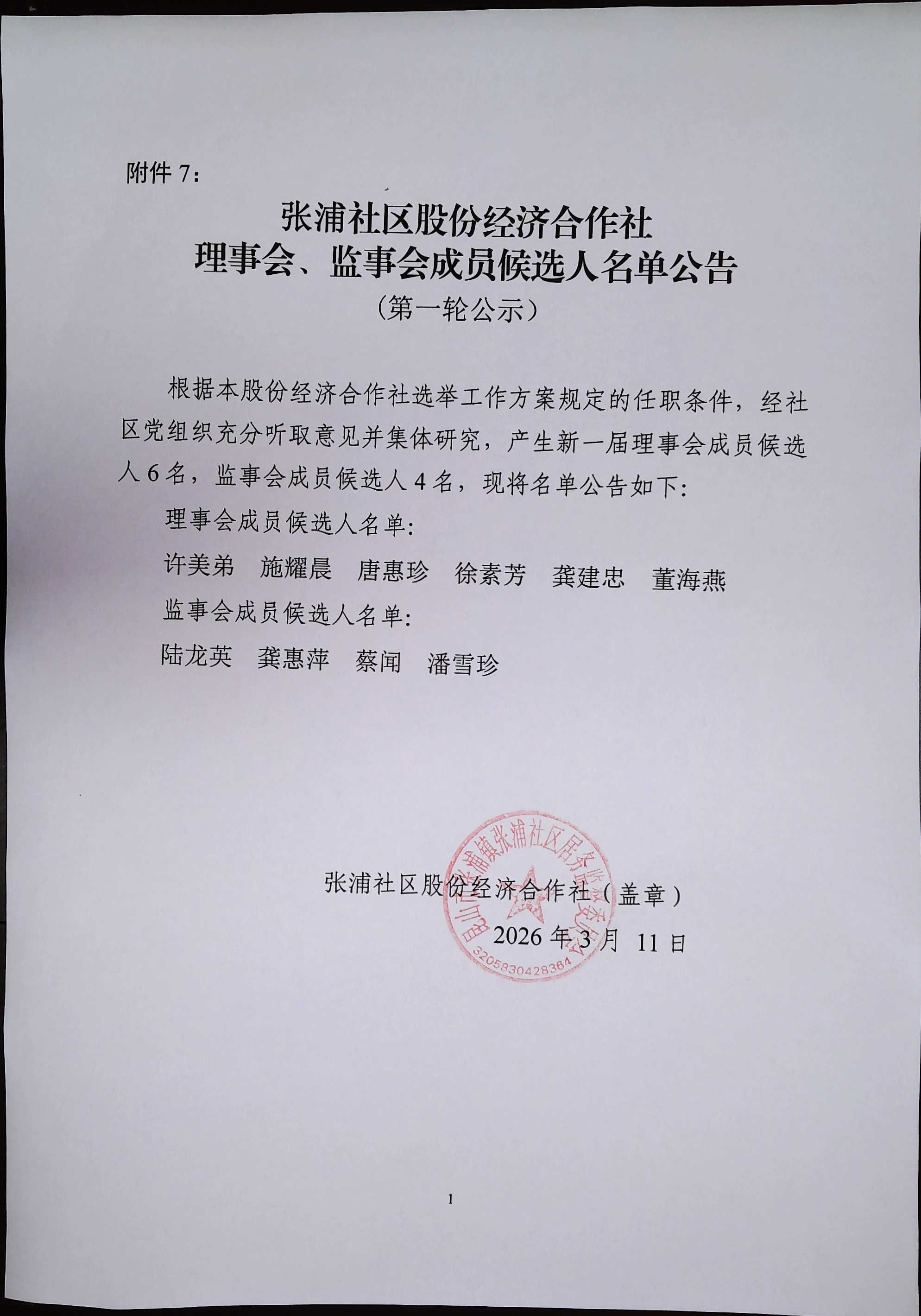 张浦社区股份经济合作社理事会、监事会成员候选人名单公告(第一轮公示)
