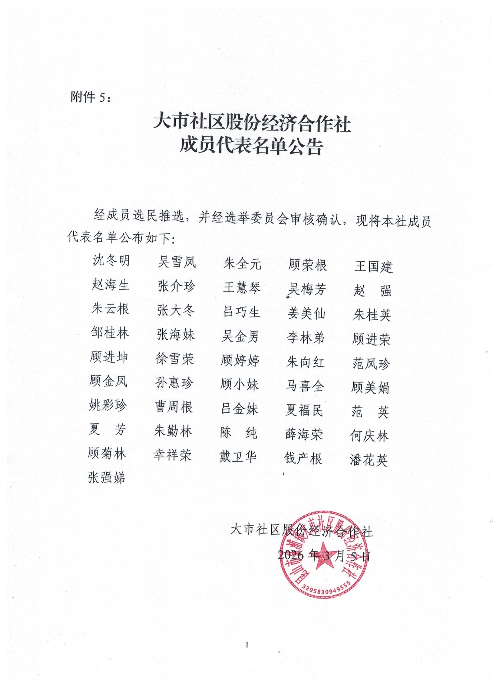 大市社区股份经济合作社换届选举成员代表名单