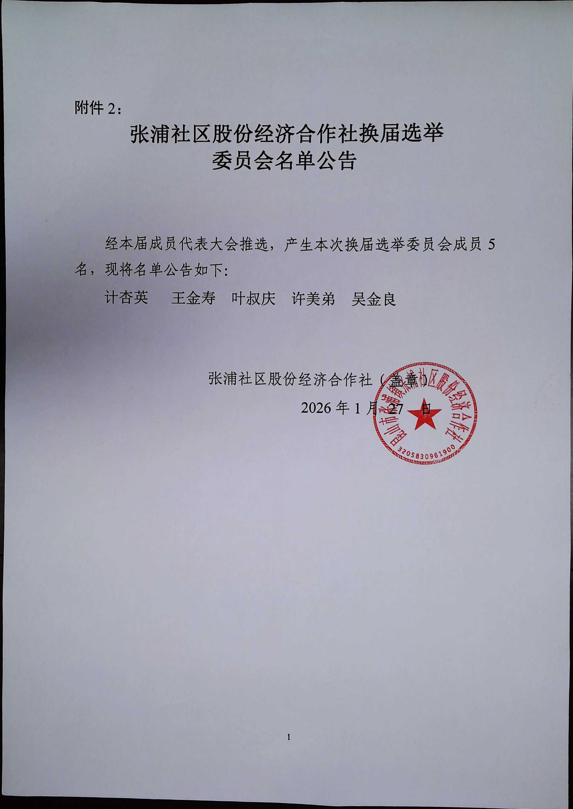 张浦社区股份经济合作社换届选举委员会名单公告