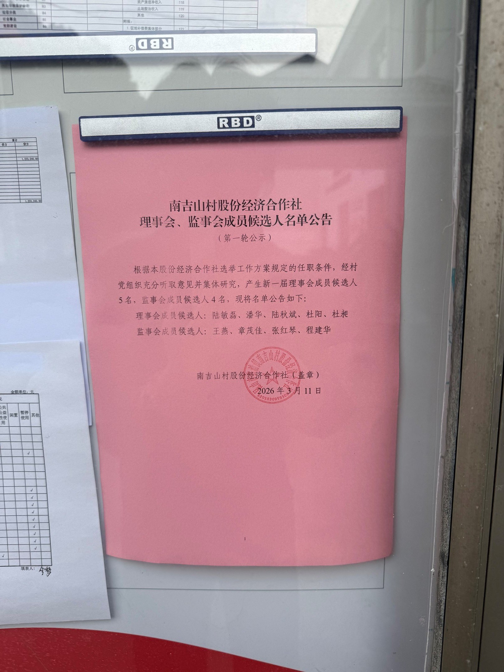 南吉山村股份经济合作社理事会、监事会成员候选人名单公告(第一轮公示)