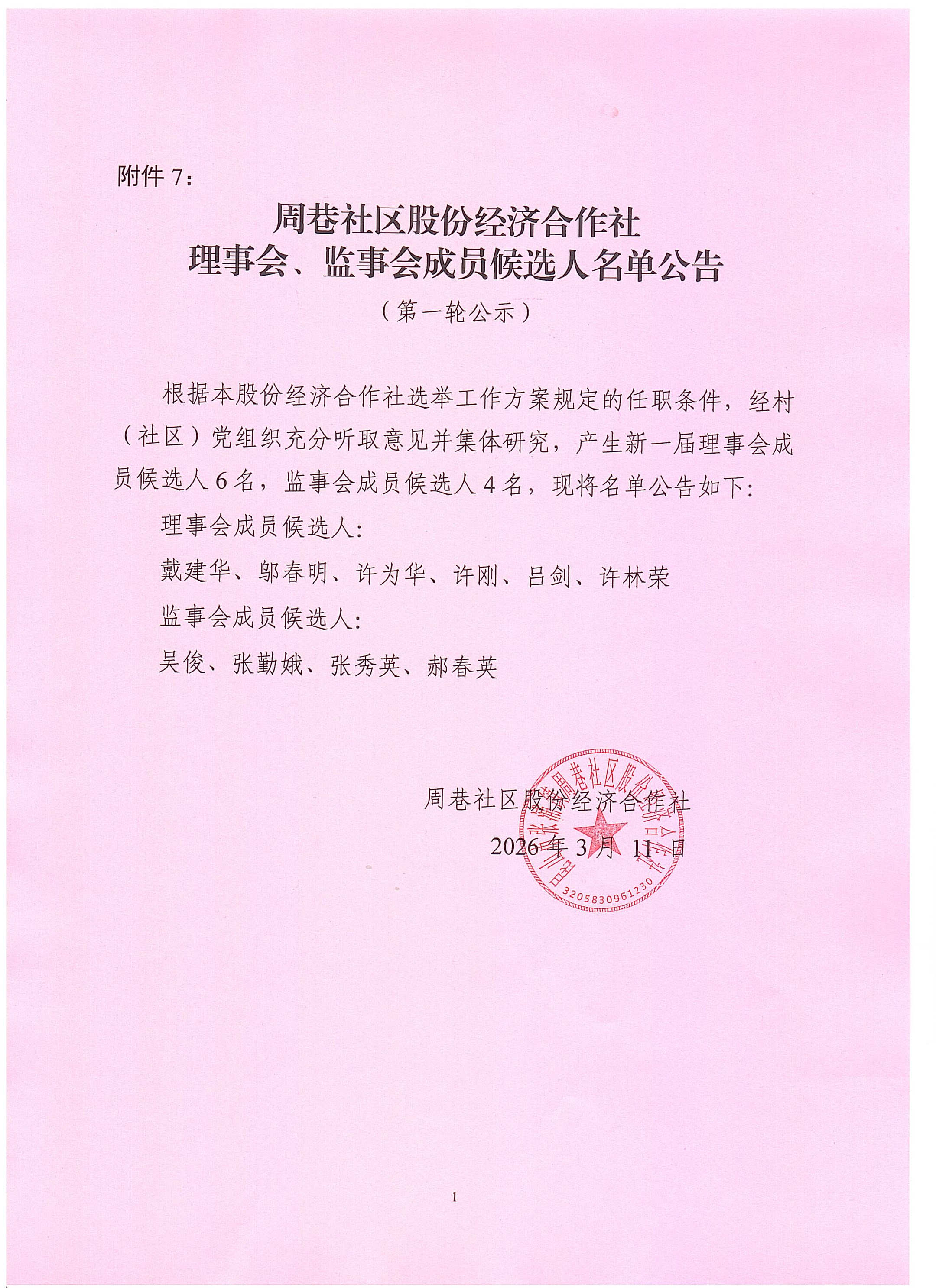 股份合作社换届选举理事会、监事会成员候选人名单第一轮公示