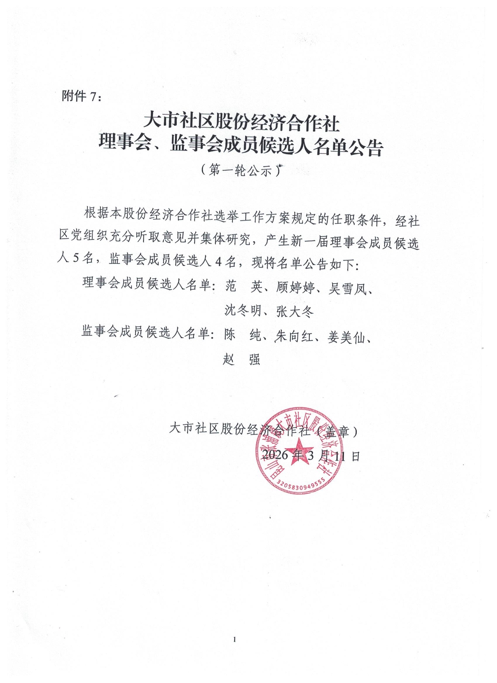 大市社区股份经济合作社换届选举理事会、监事会成员候选人名单第一次公示