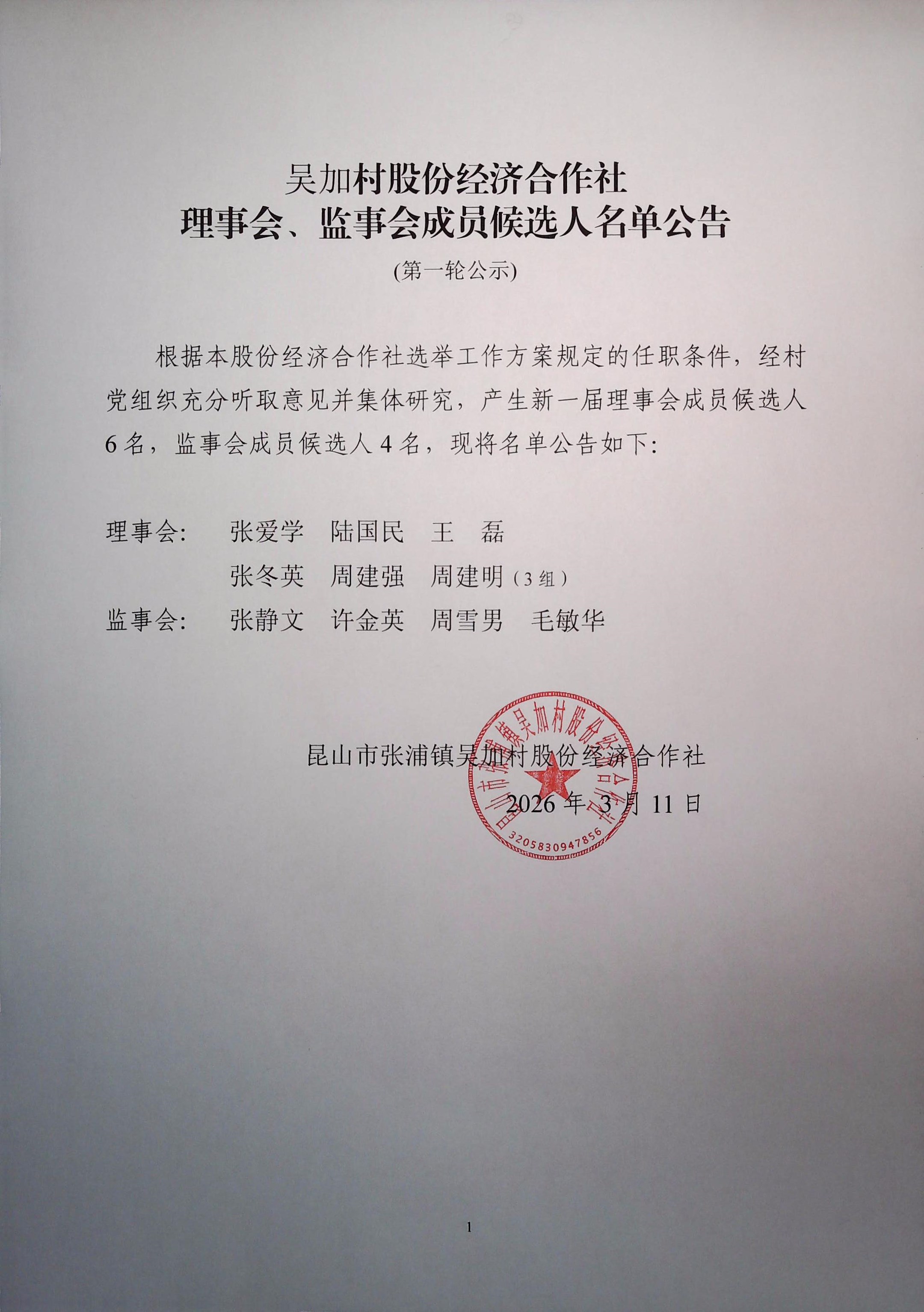 吴加村股份经济合作社理事会、监事会成员候选人名单公告(第一轮公示)