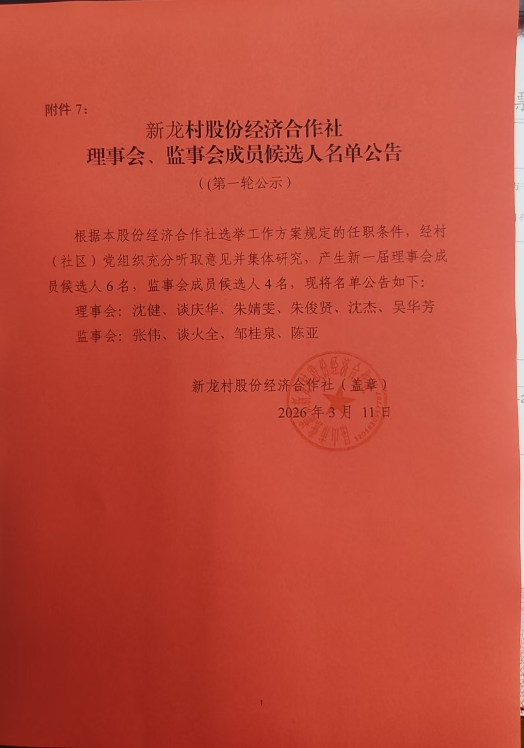新龙村股份经济合作社理事会、监事会候选人公示