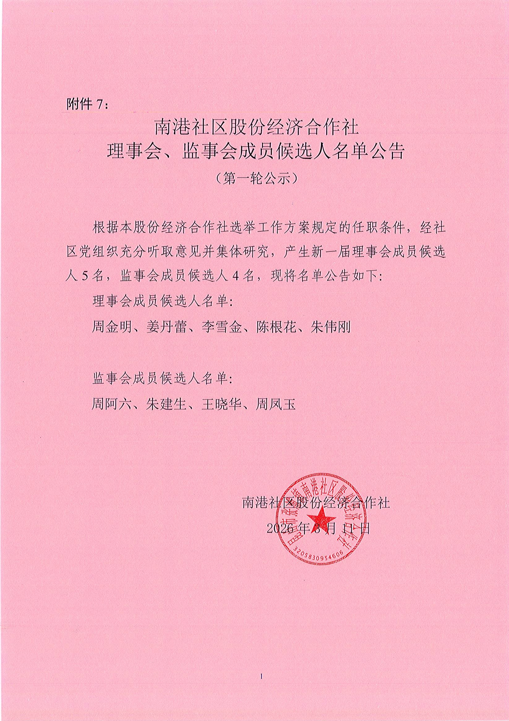 2026年南港社区股份经济合作社 理事会、监事会成员候选人名单公告