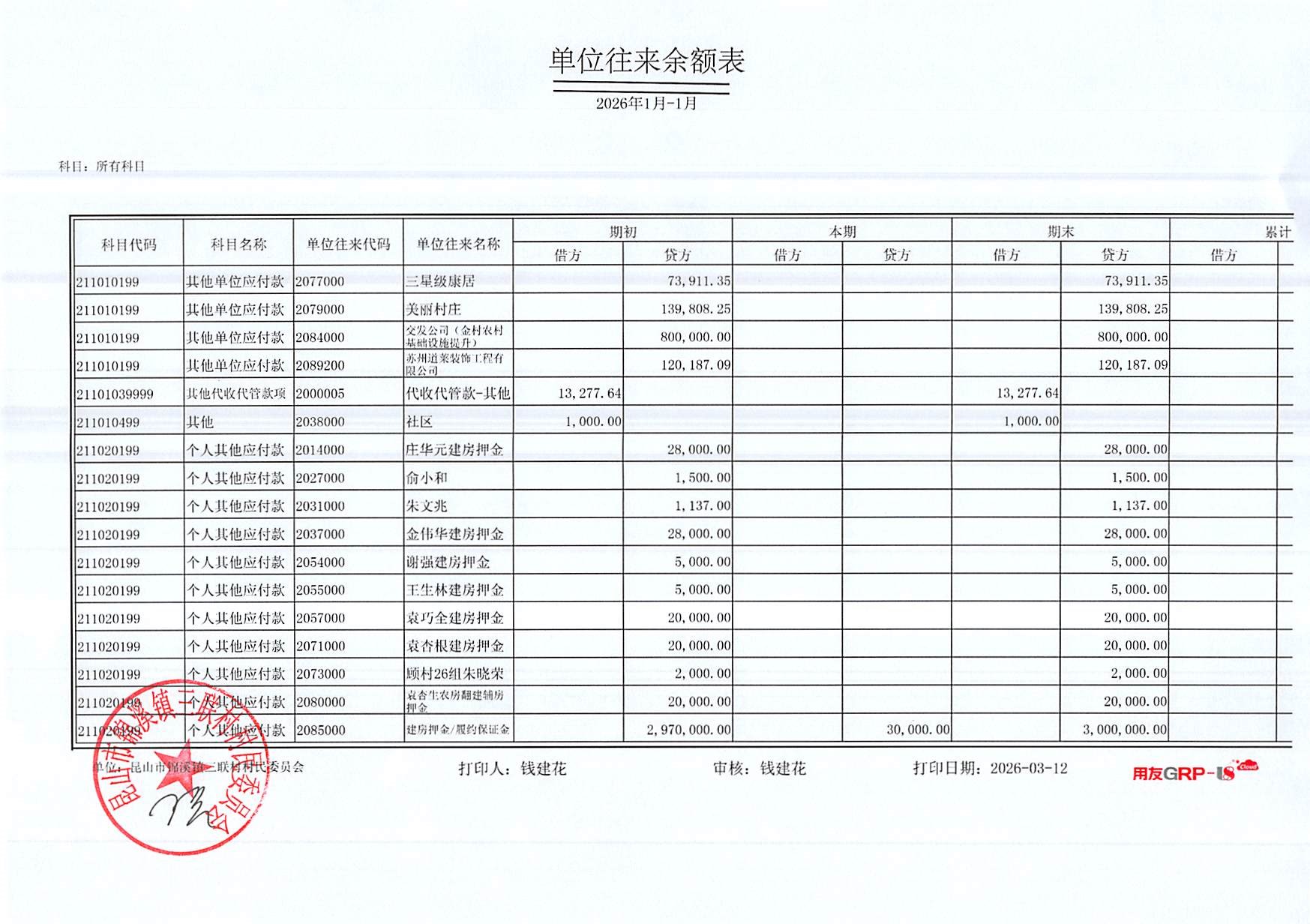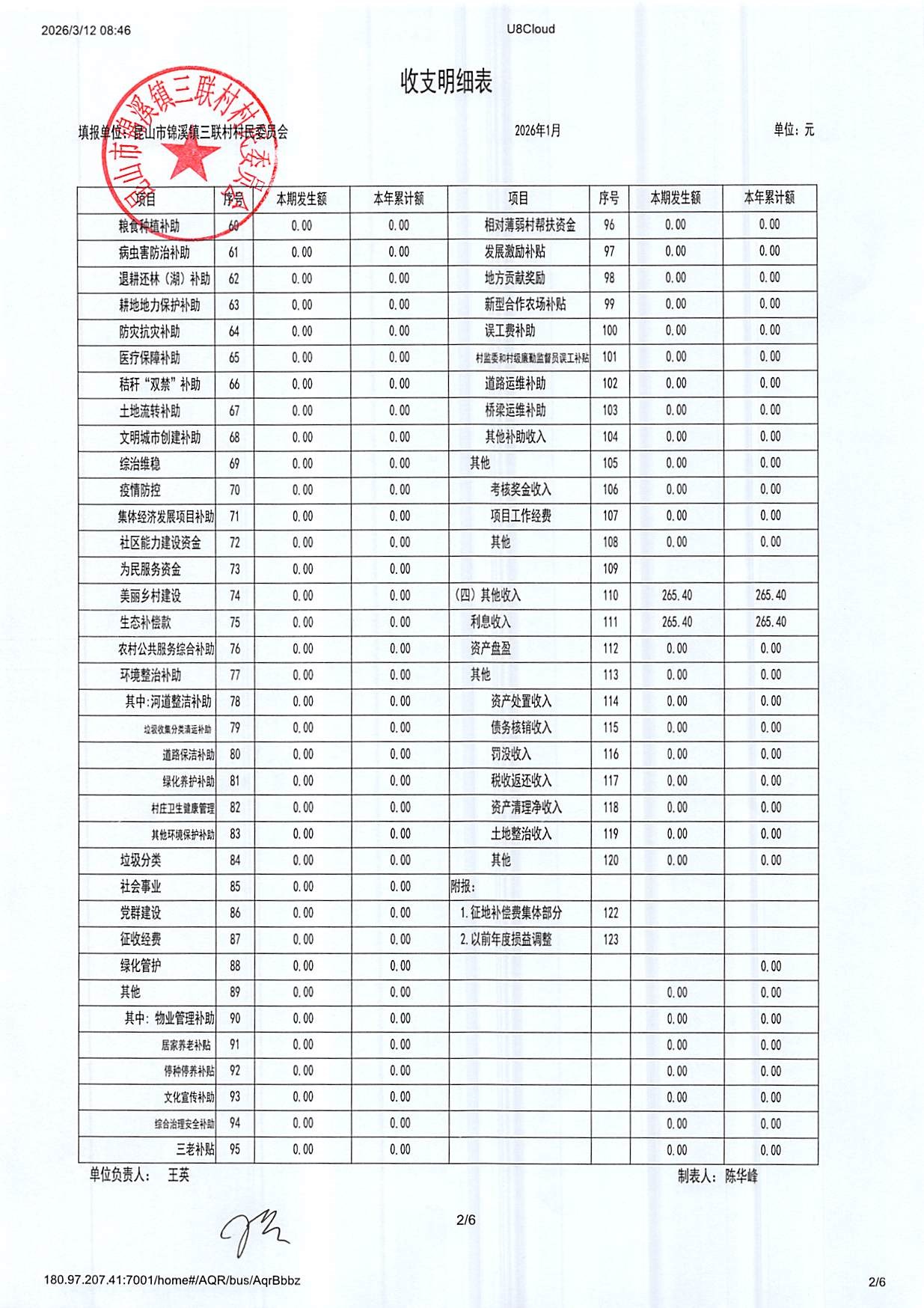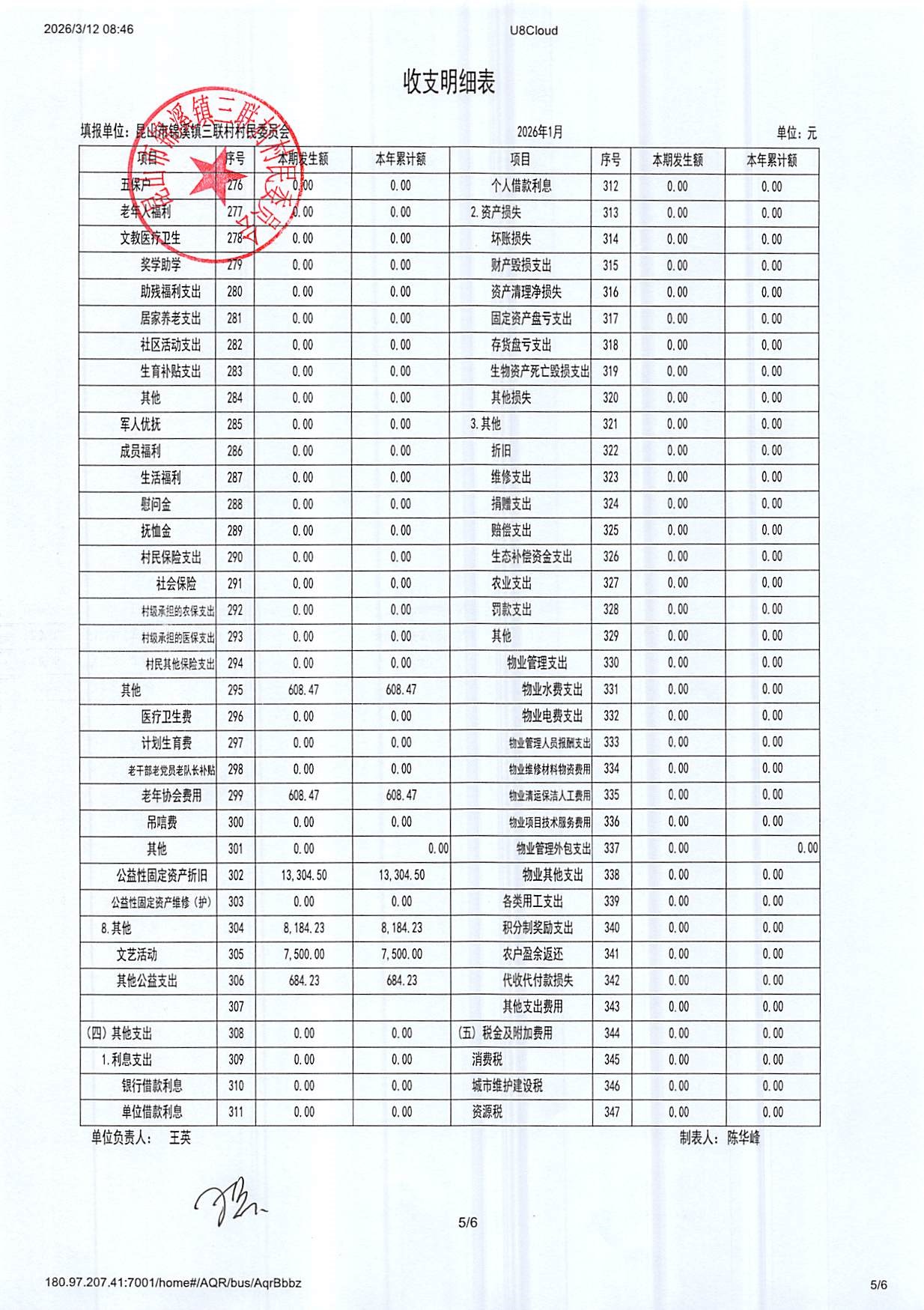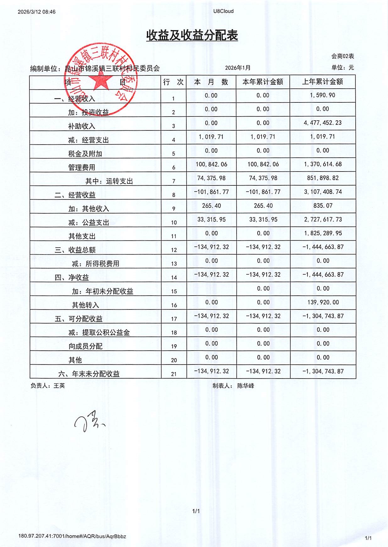 2026年三联村村委会1月份财务公开