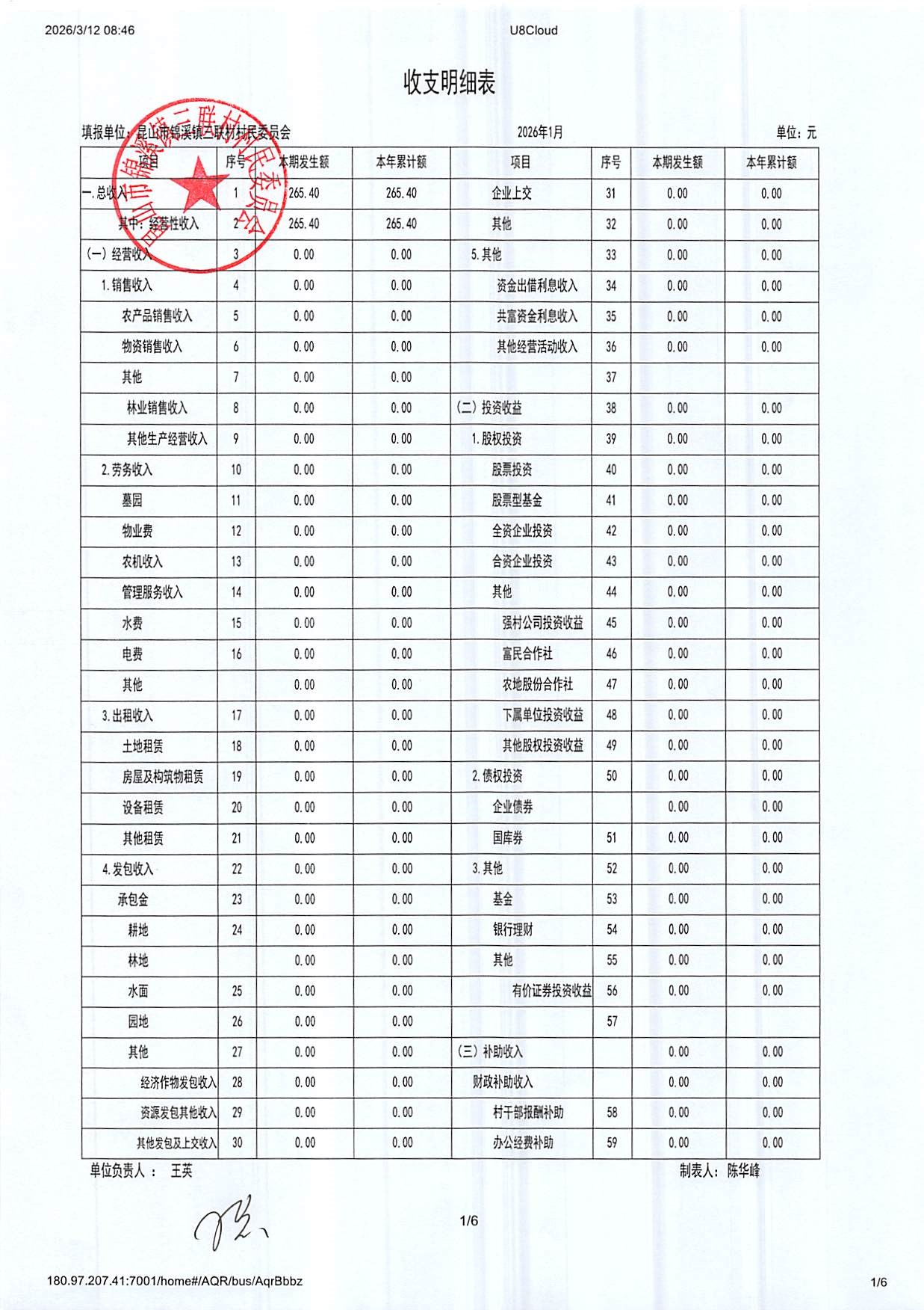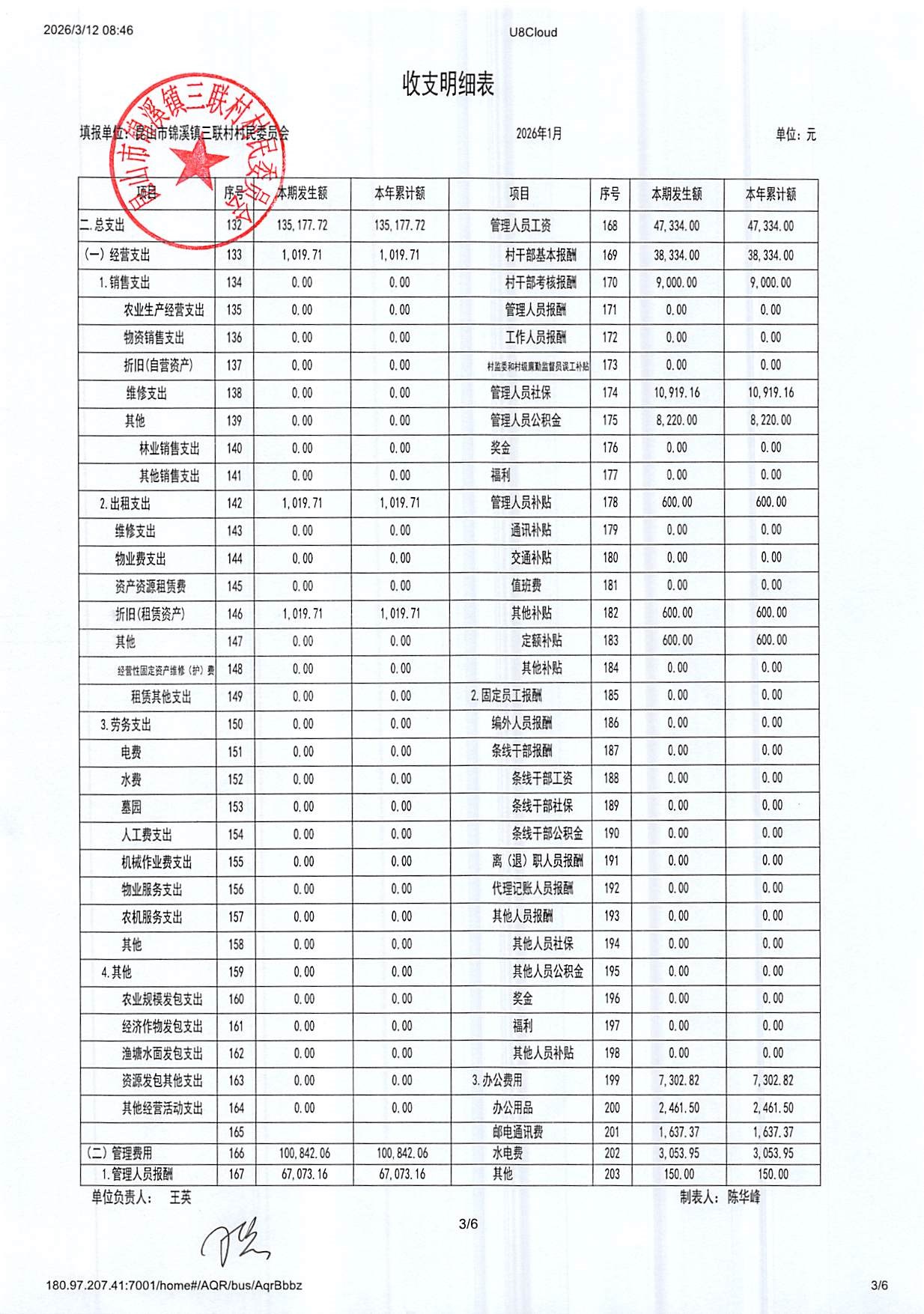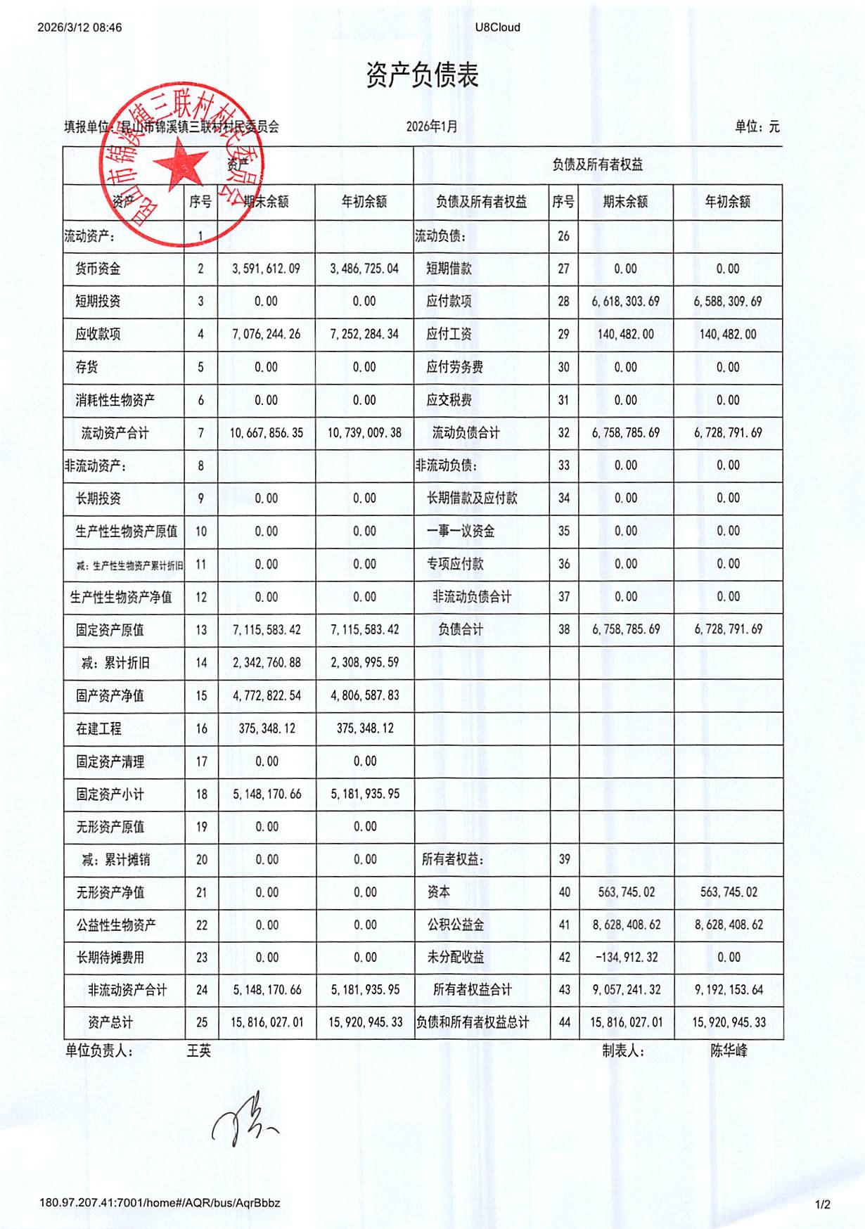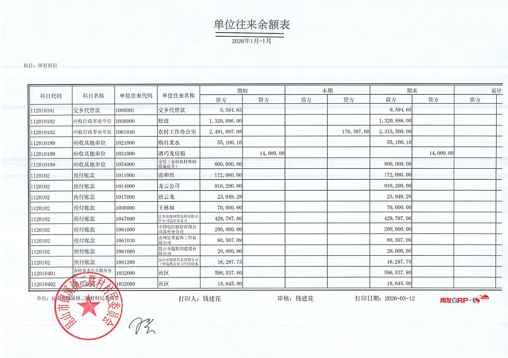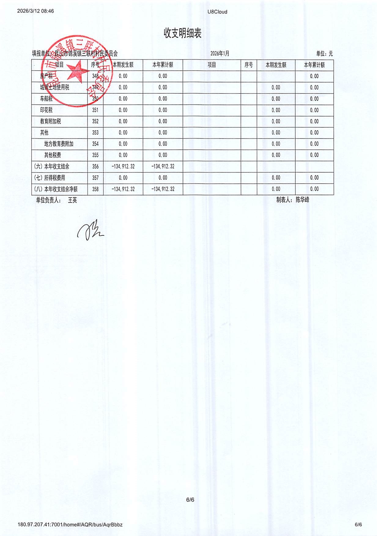 2026年三联村村委会1月份财务公开