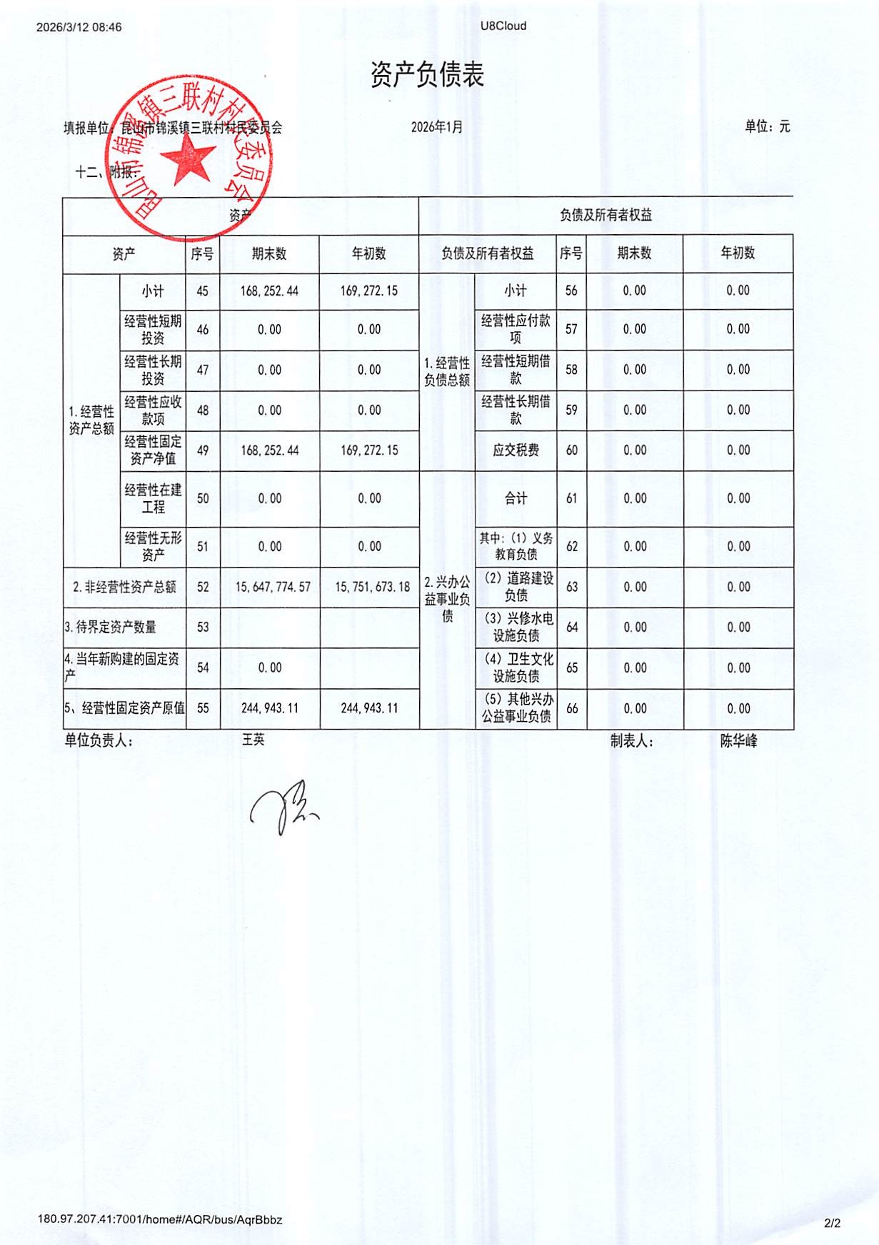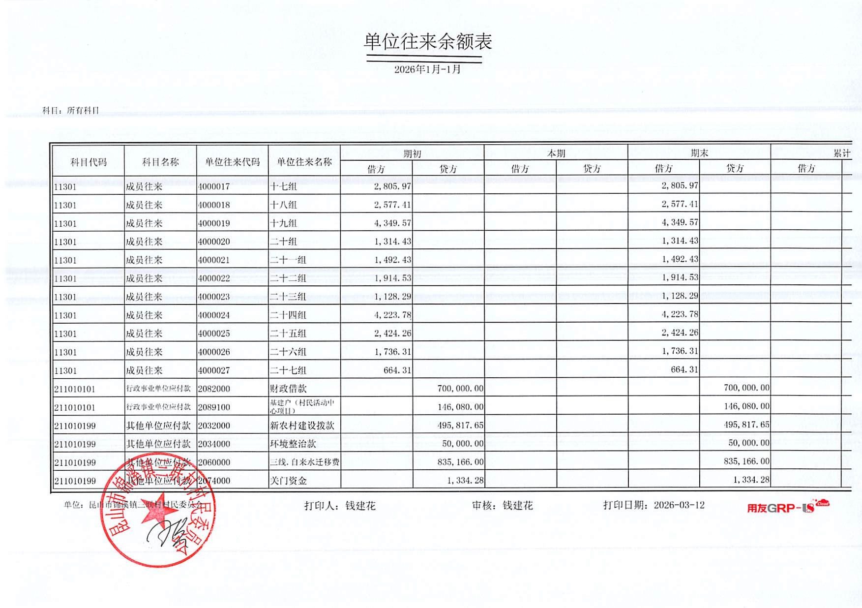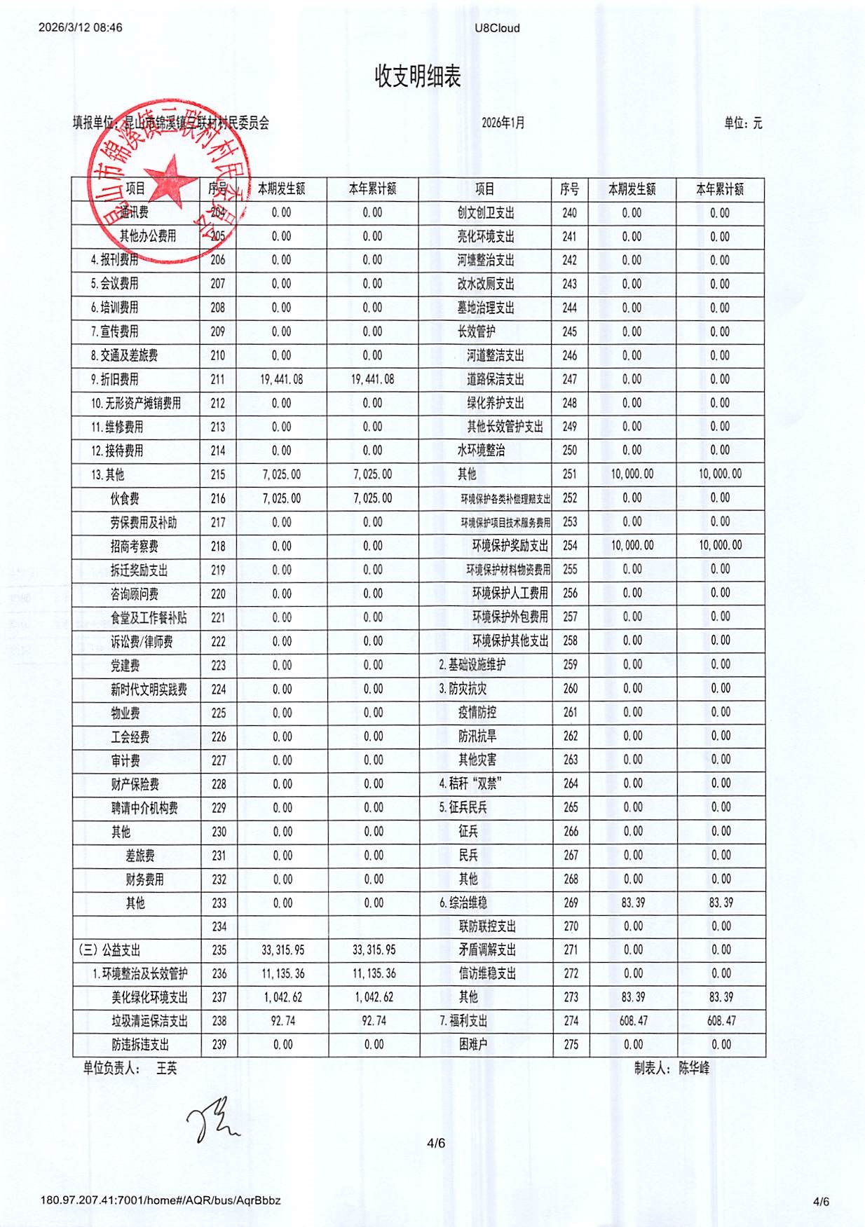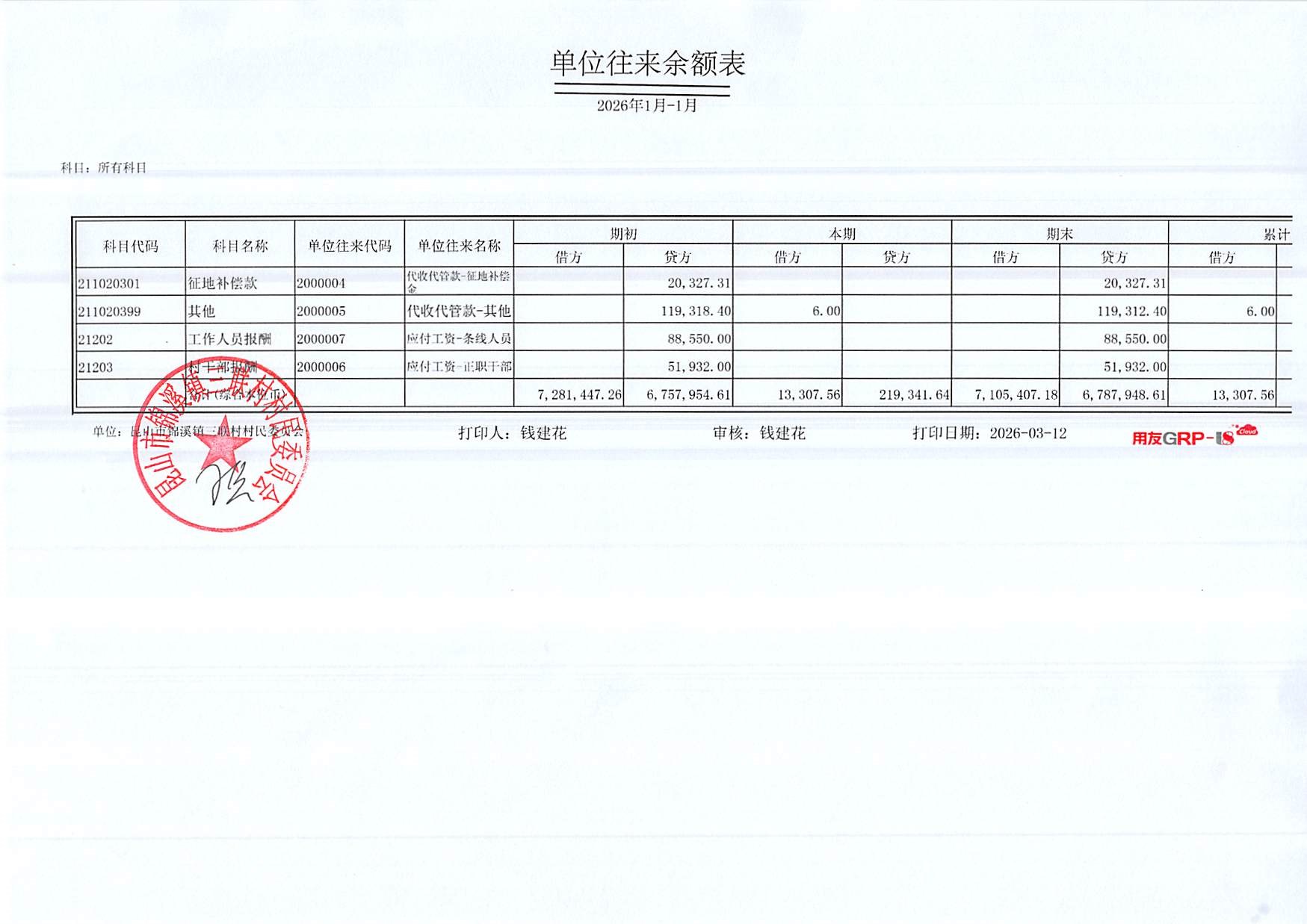 2026年三联村村委会1月份财务公开
