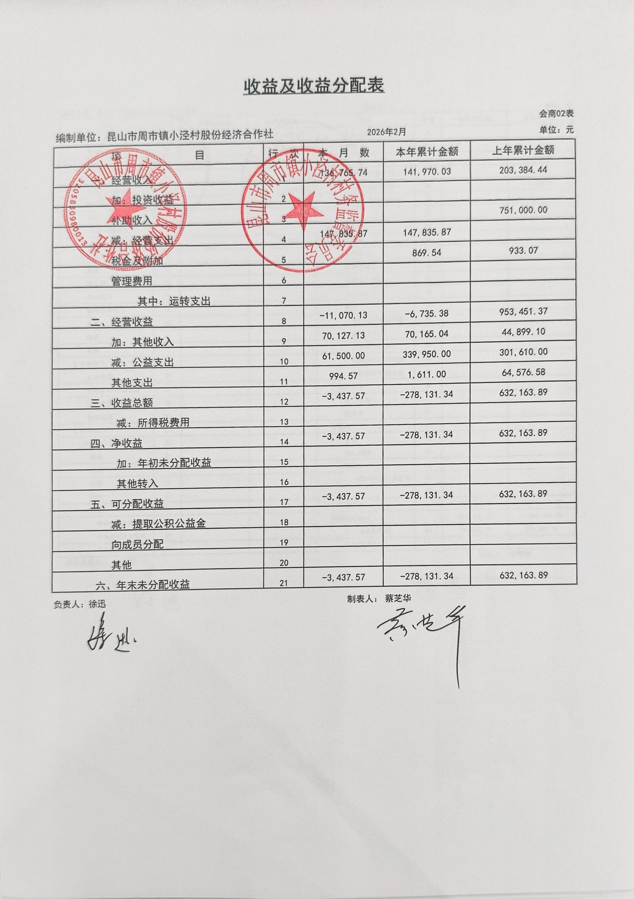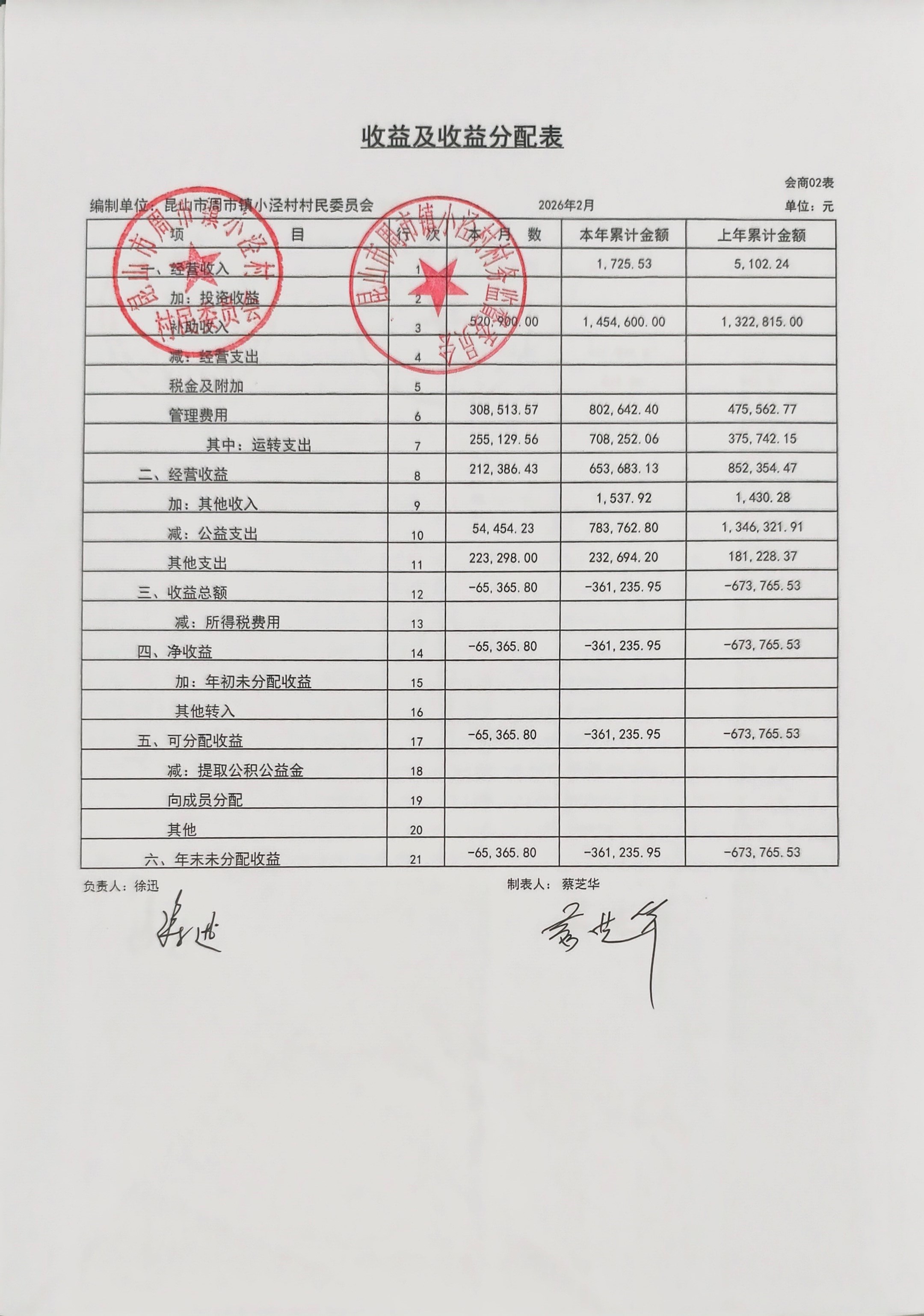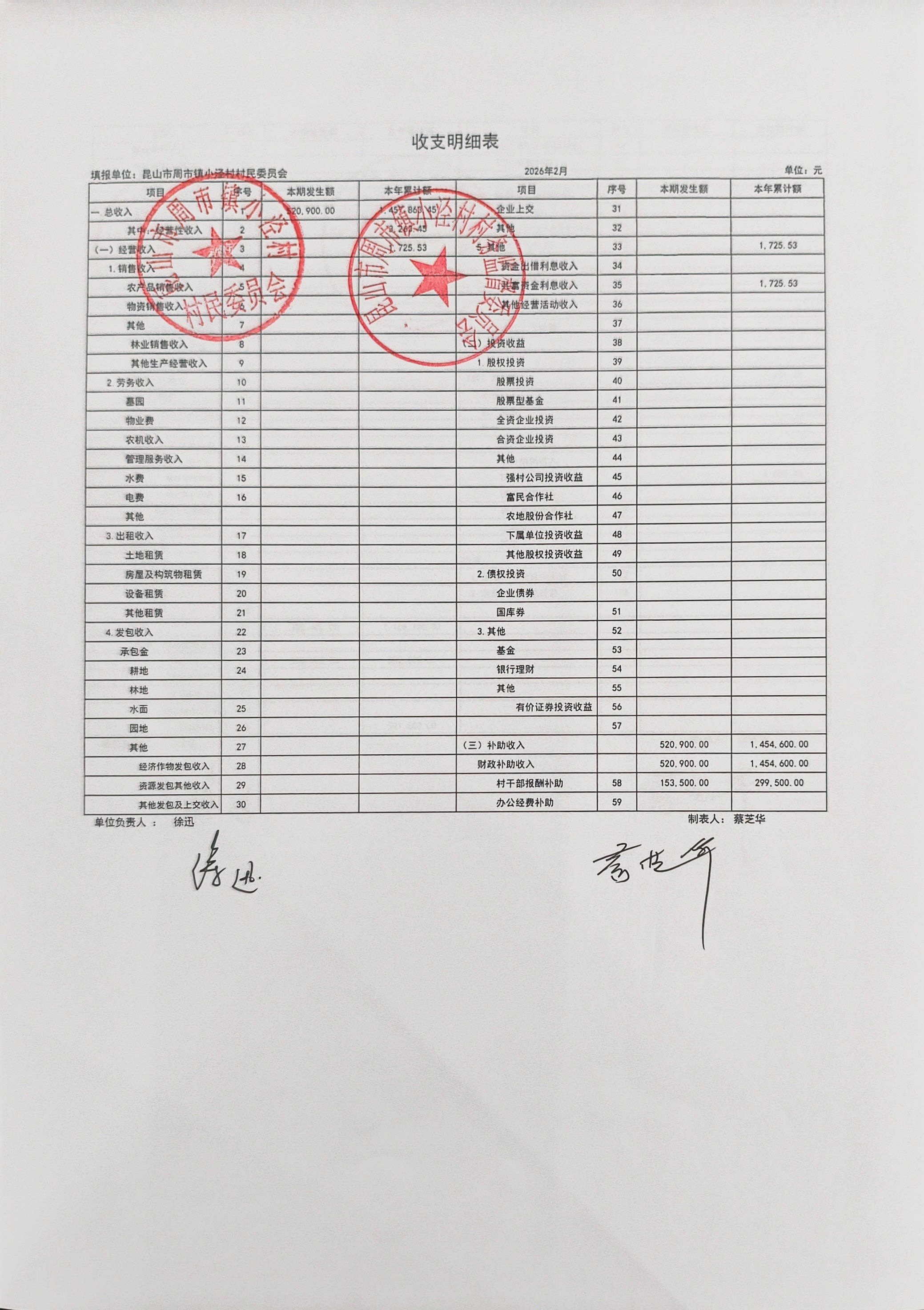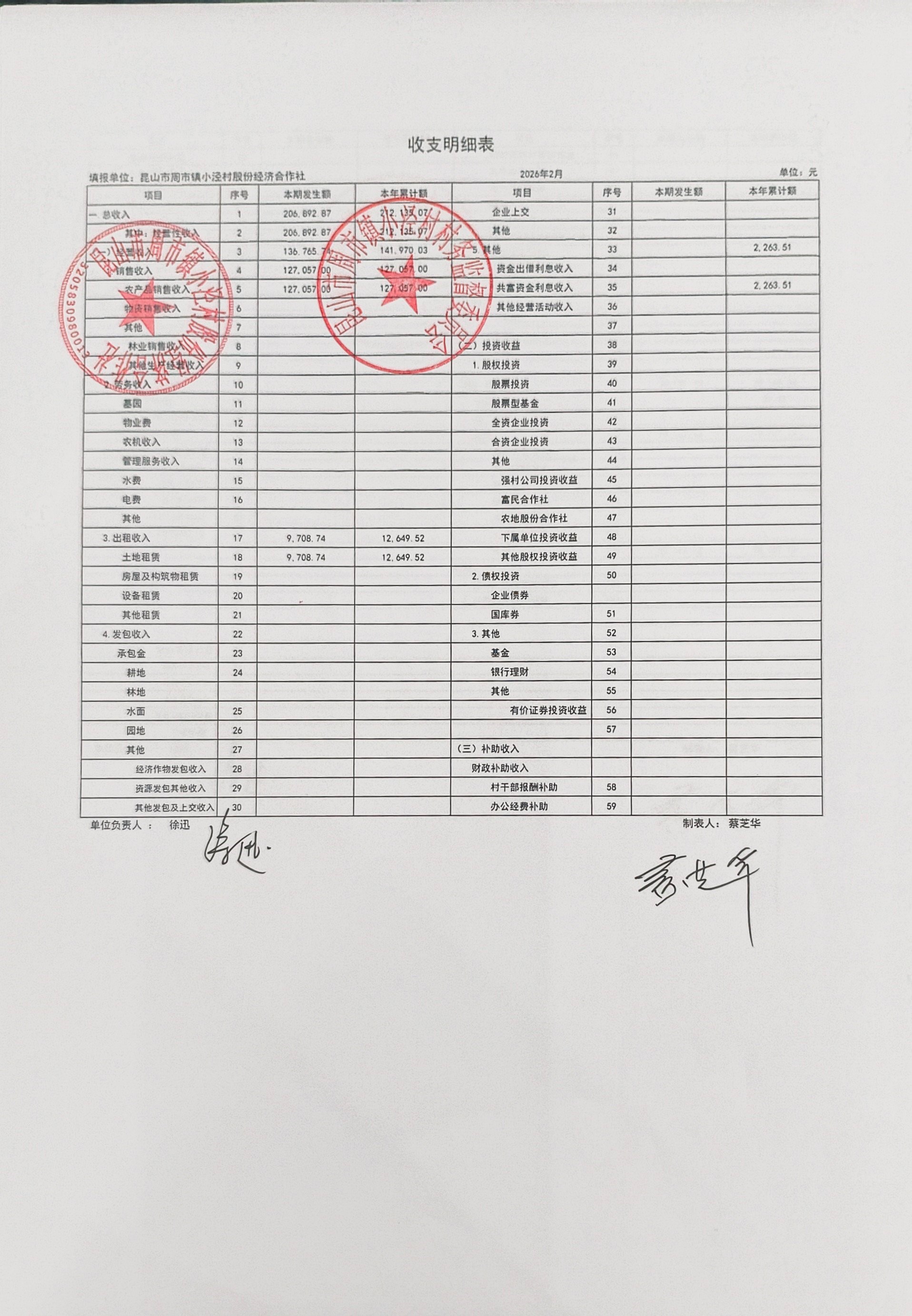 小泾村2026年2月财务公开