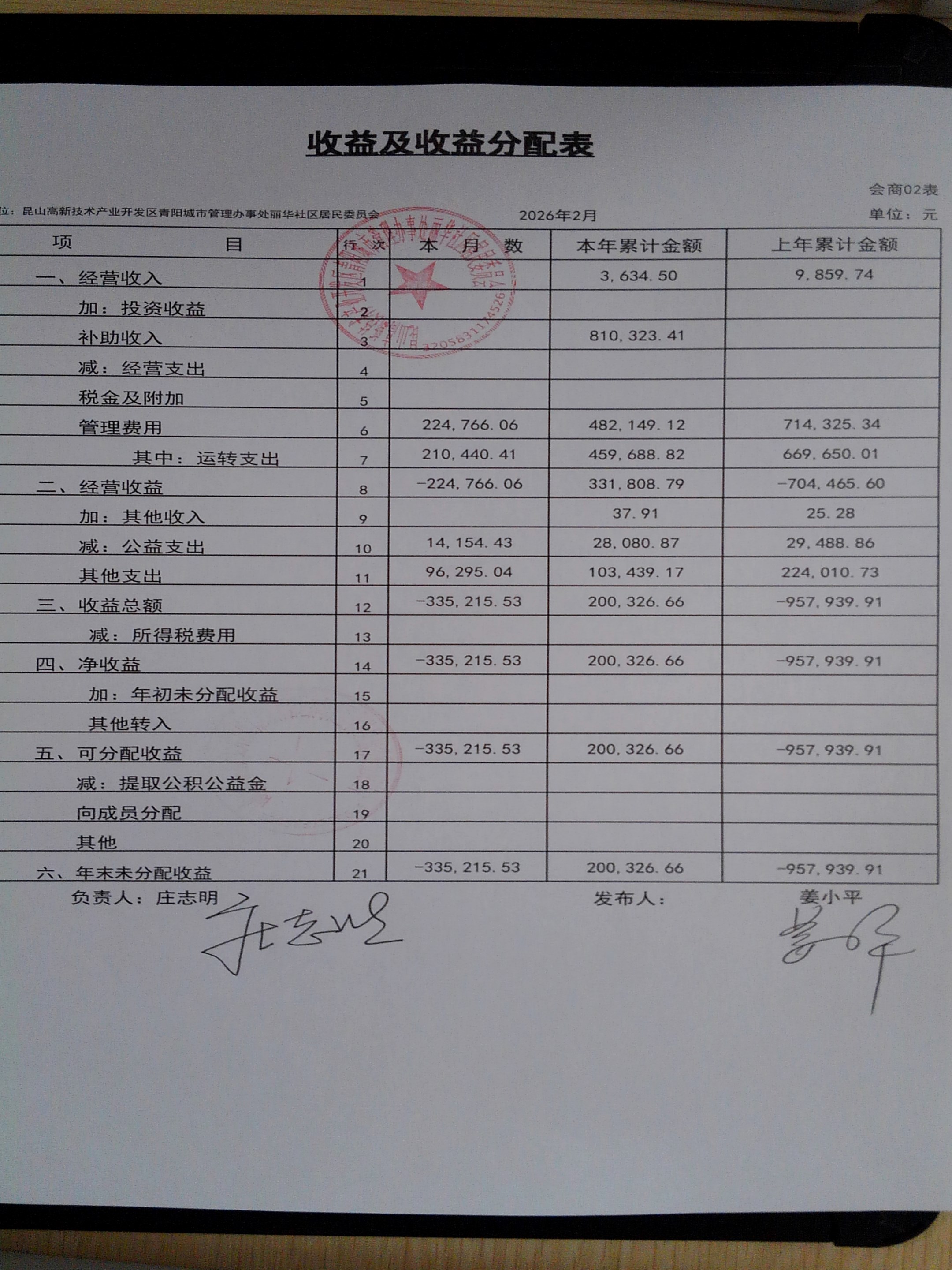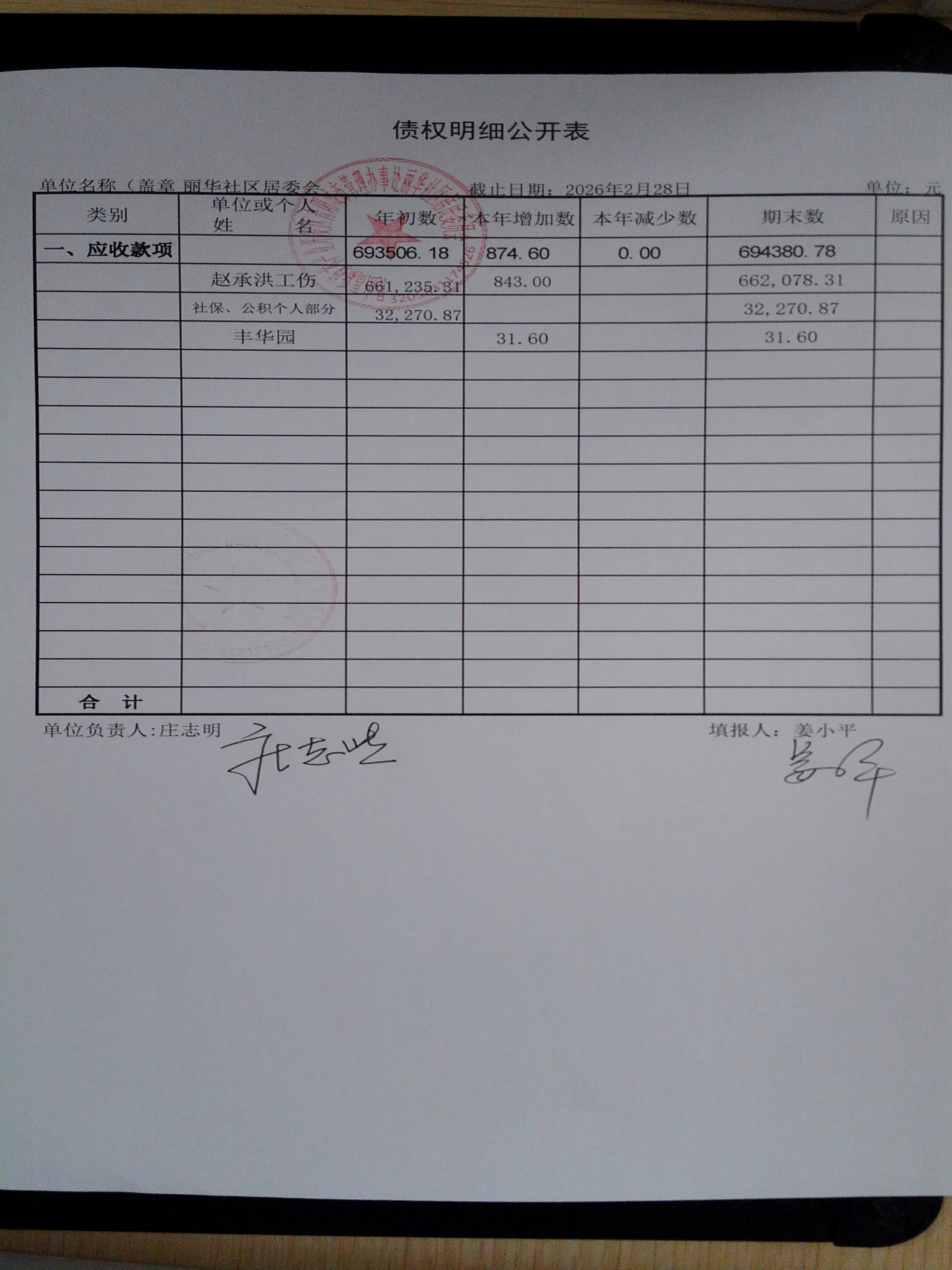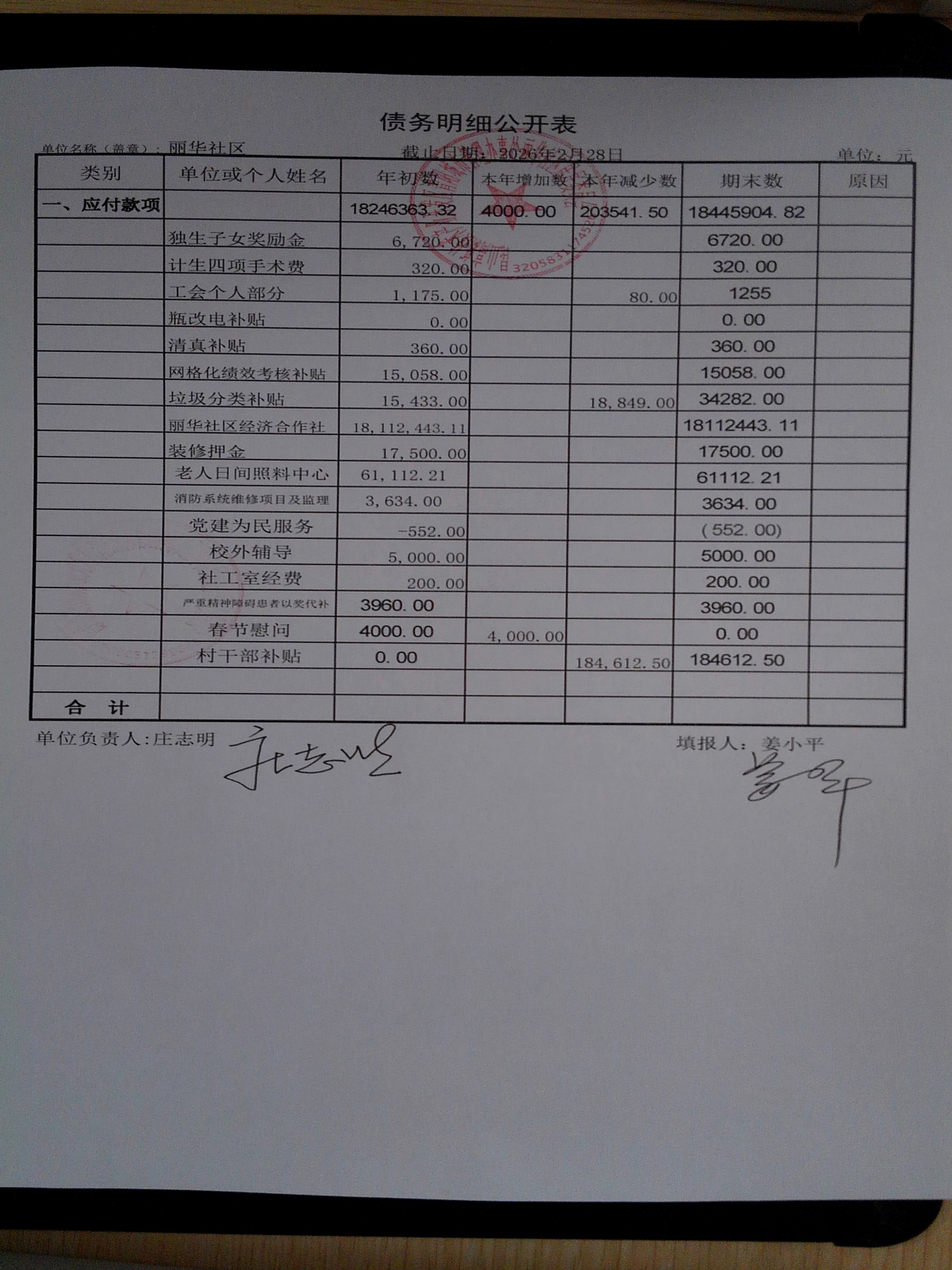 2026年2月份丽华社区居委会财务公开