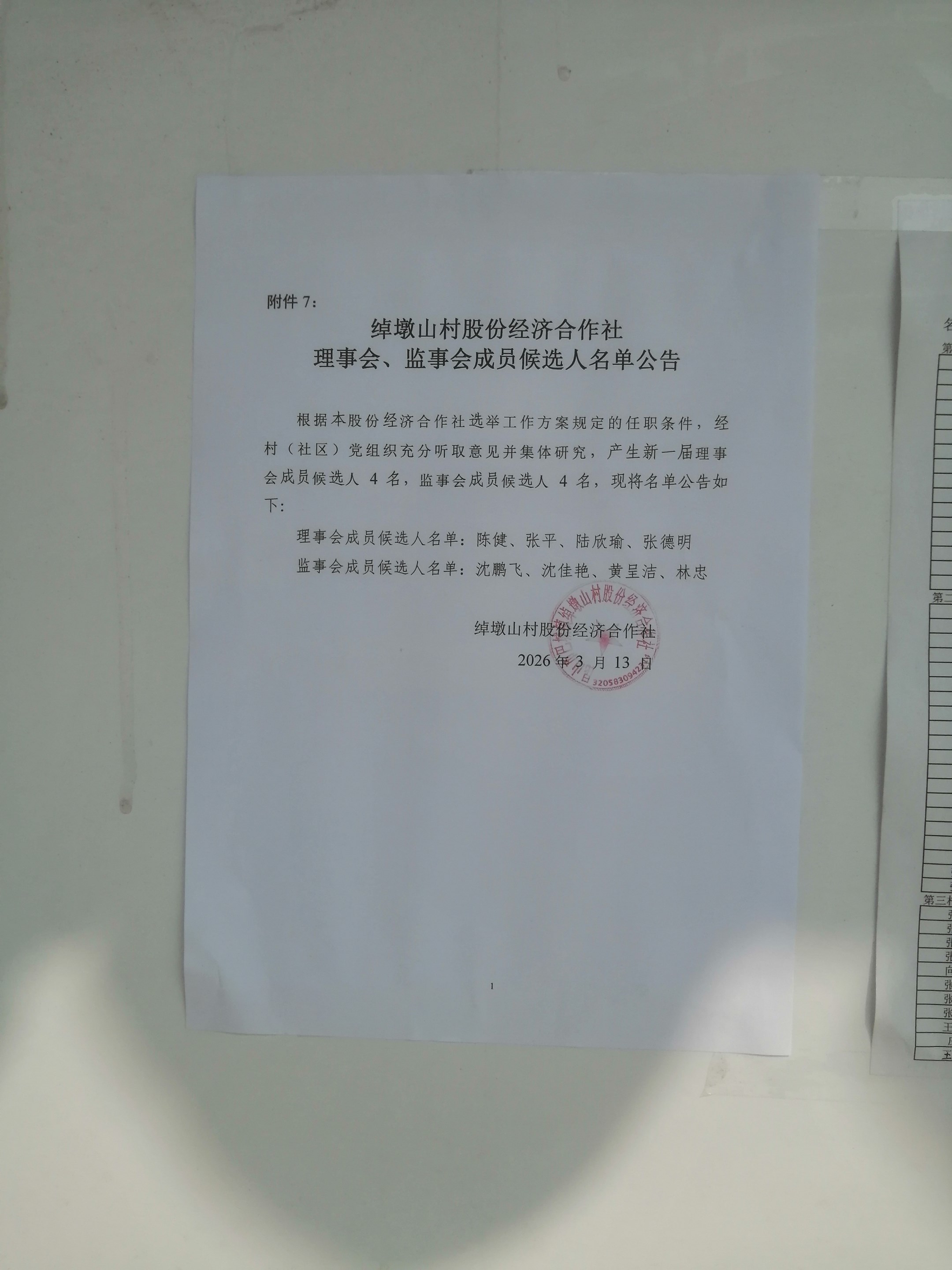 2026年昆山市巴城镇绰墩山村股份经济合作社换届理事会、监事会成员候选人名单公告