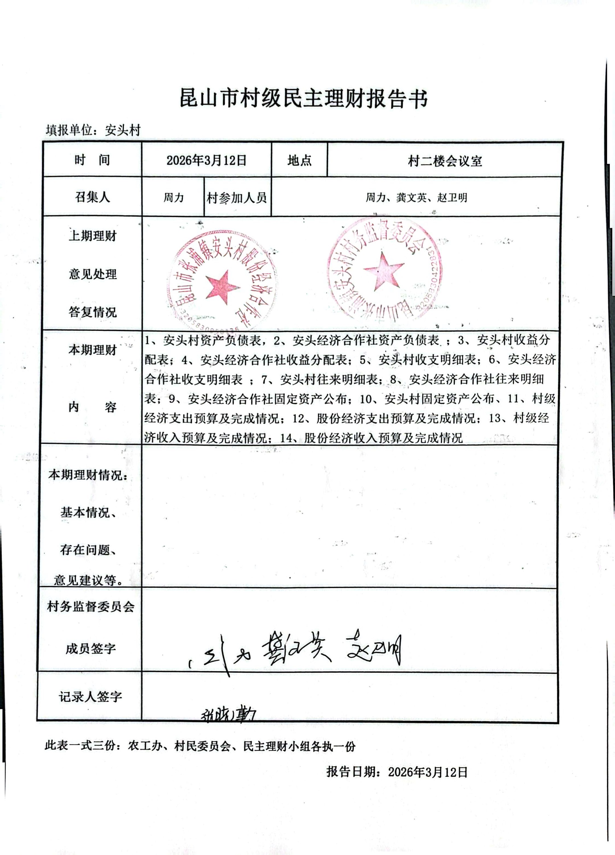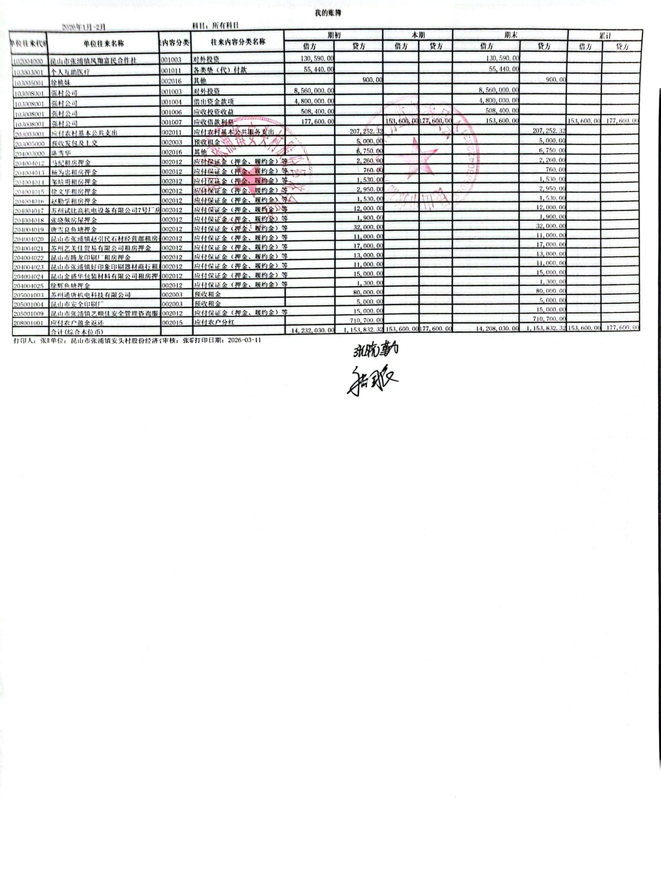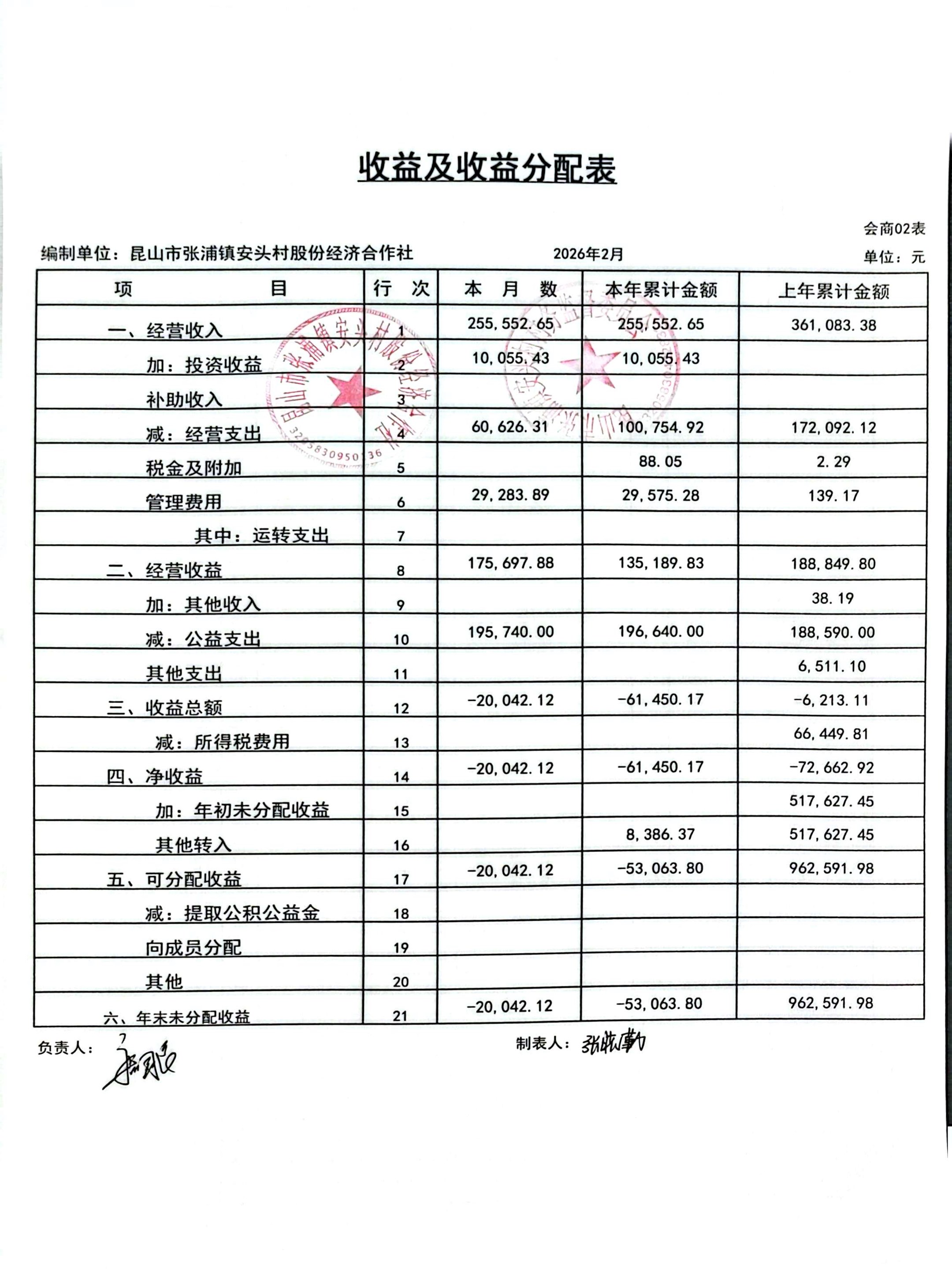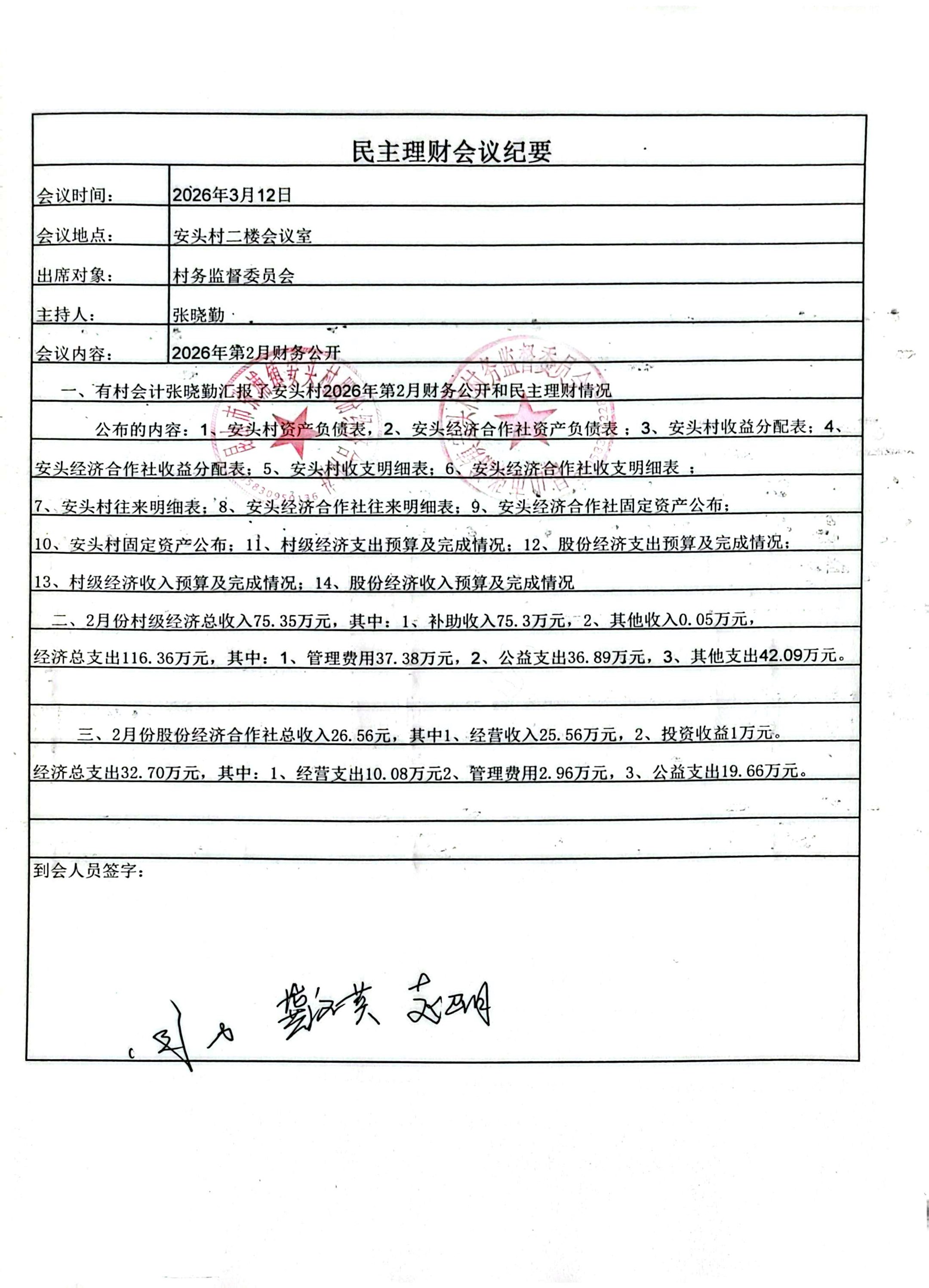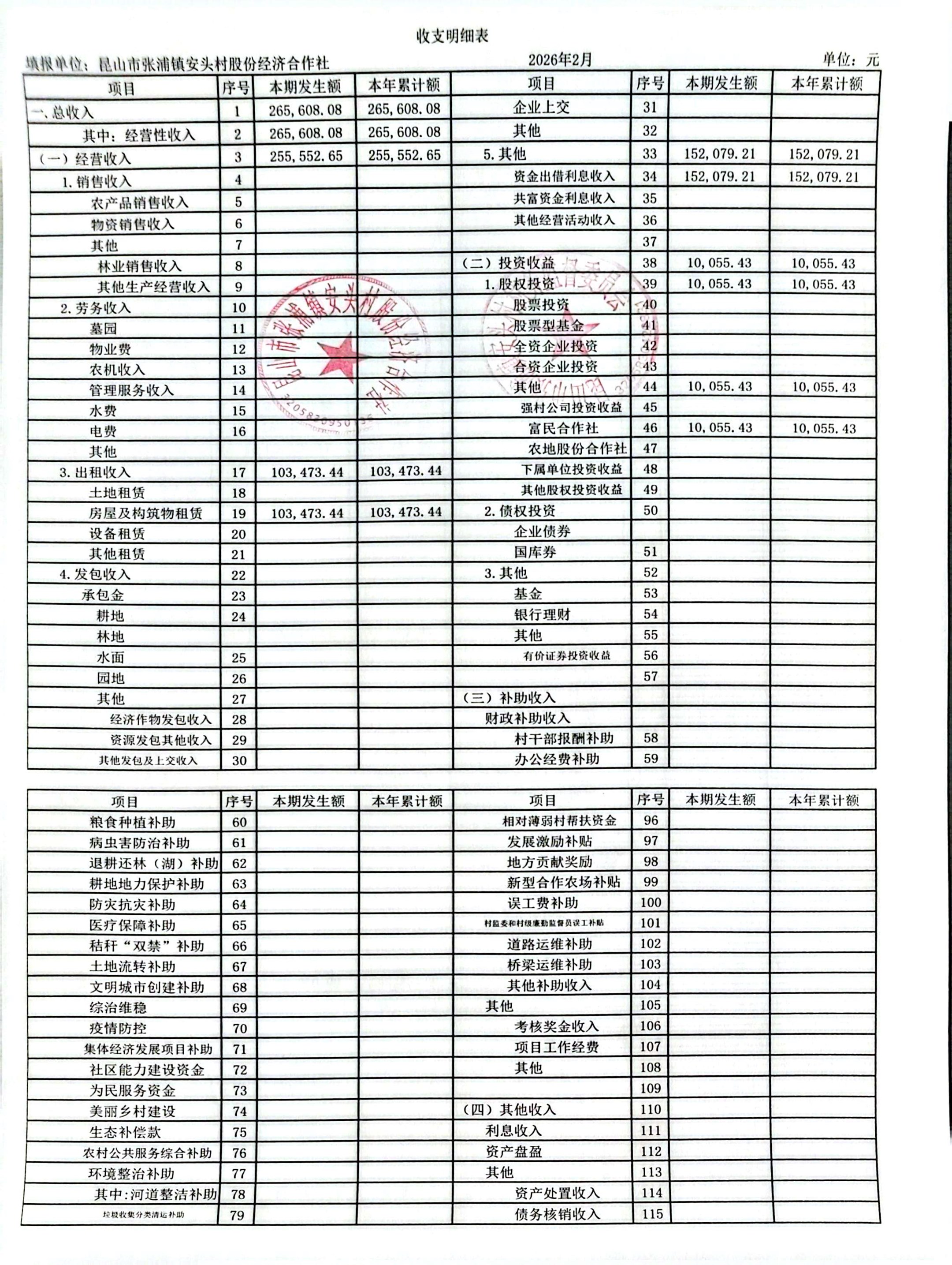 安头股份经济合作社2026年2月财务公开