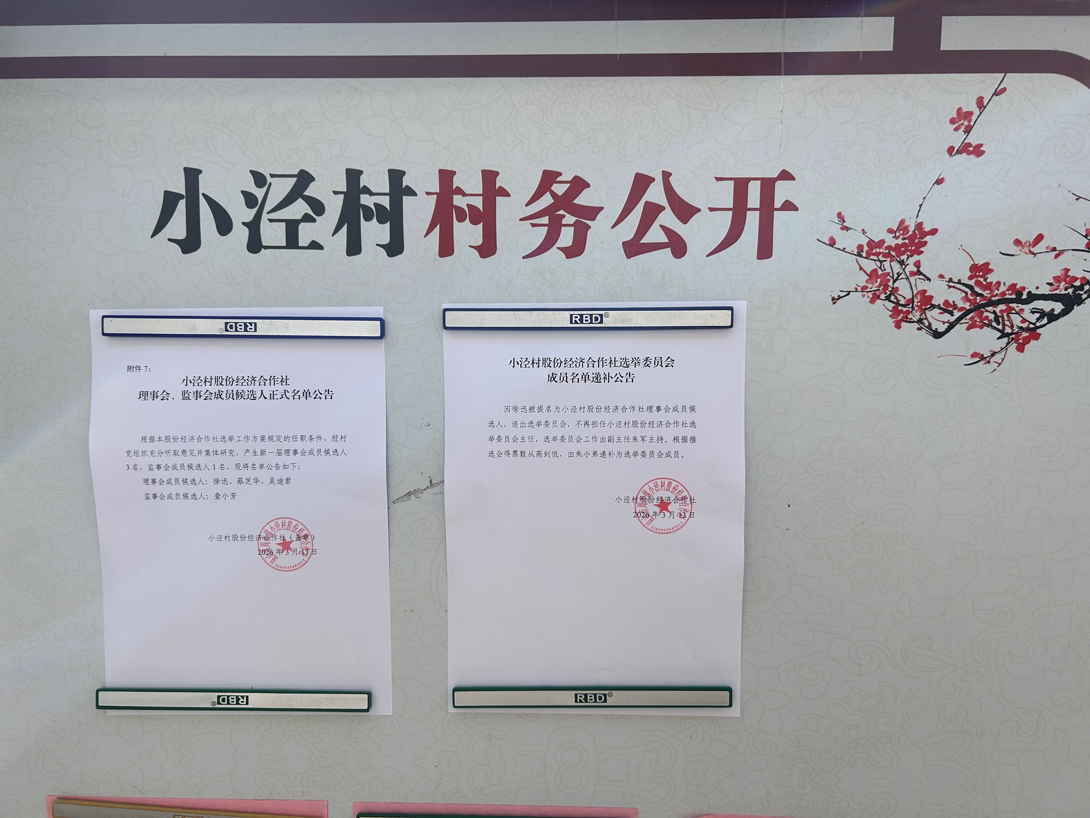 小泾村股份经济合作社理事会、监事会候选人名单公示