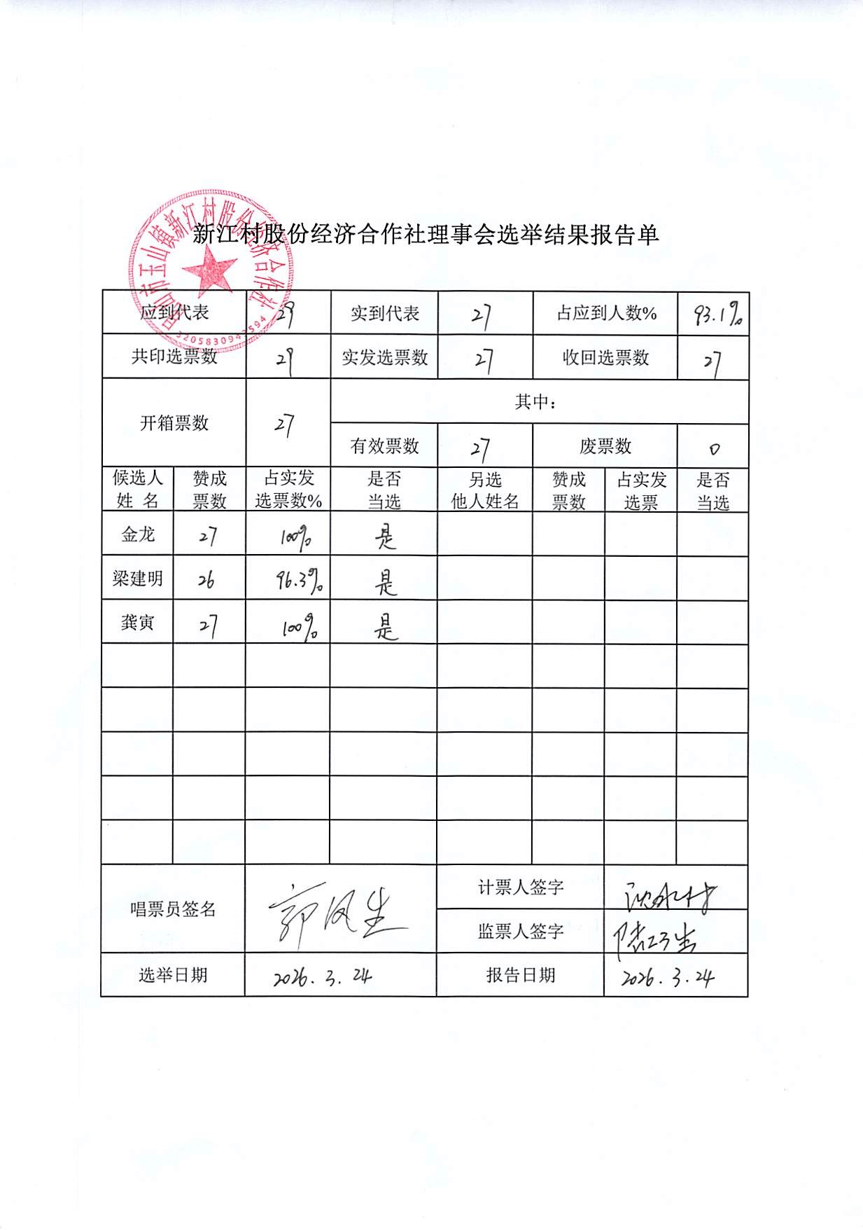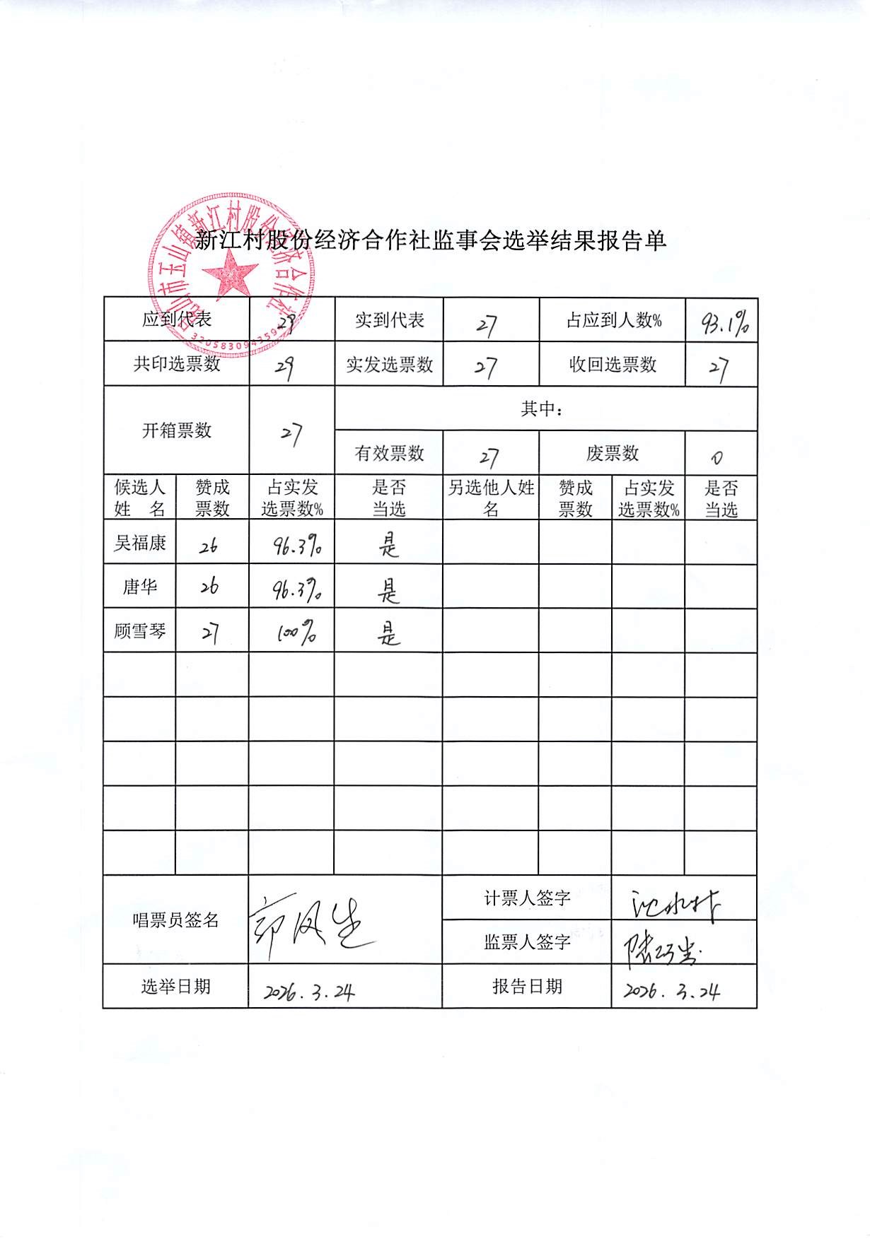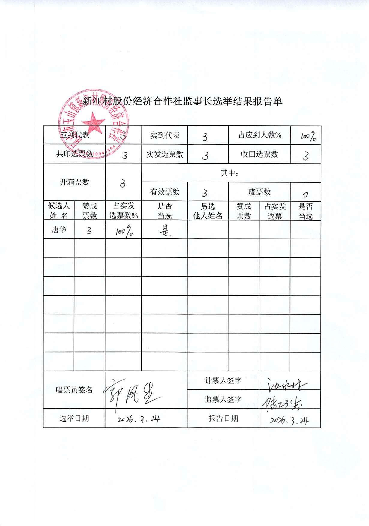 新江村股份经济合作社理事会监事会监事长选举报告单