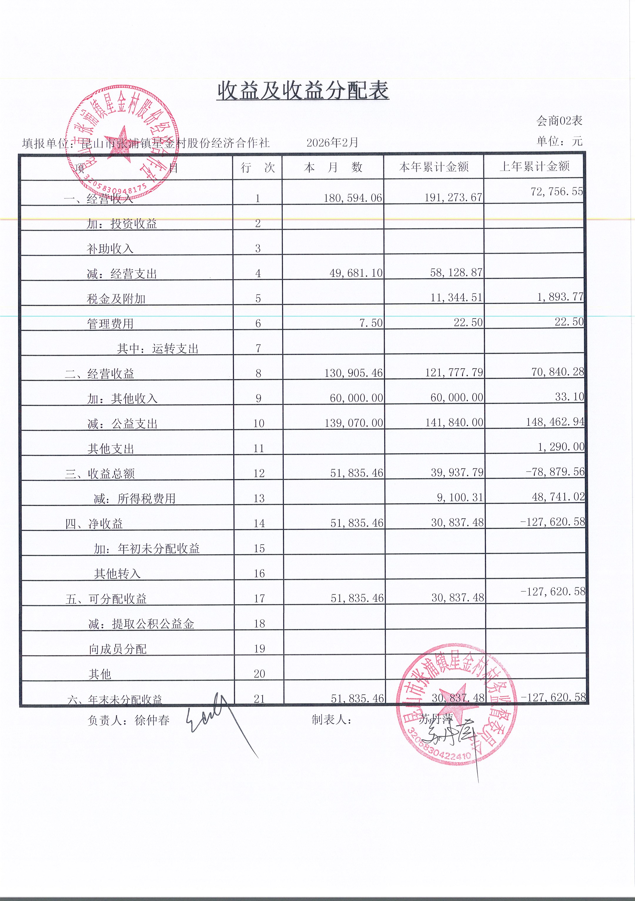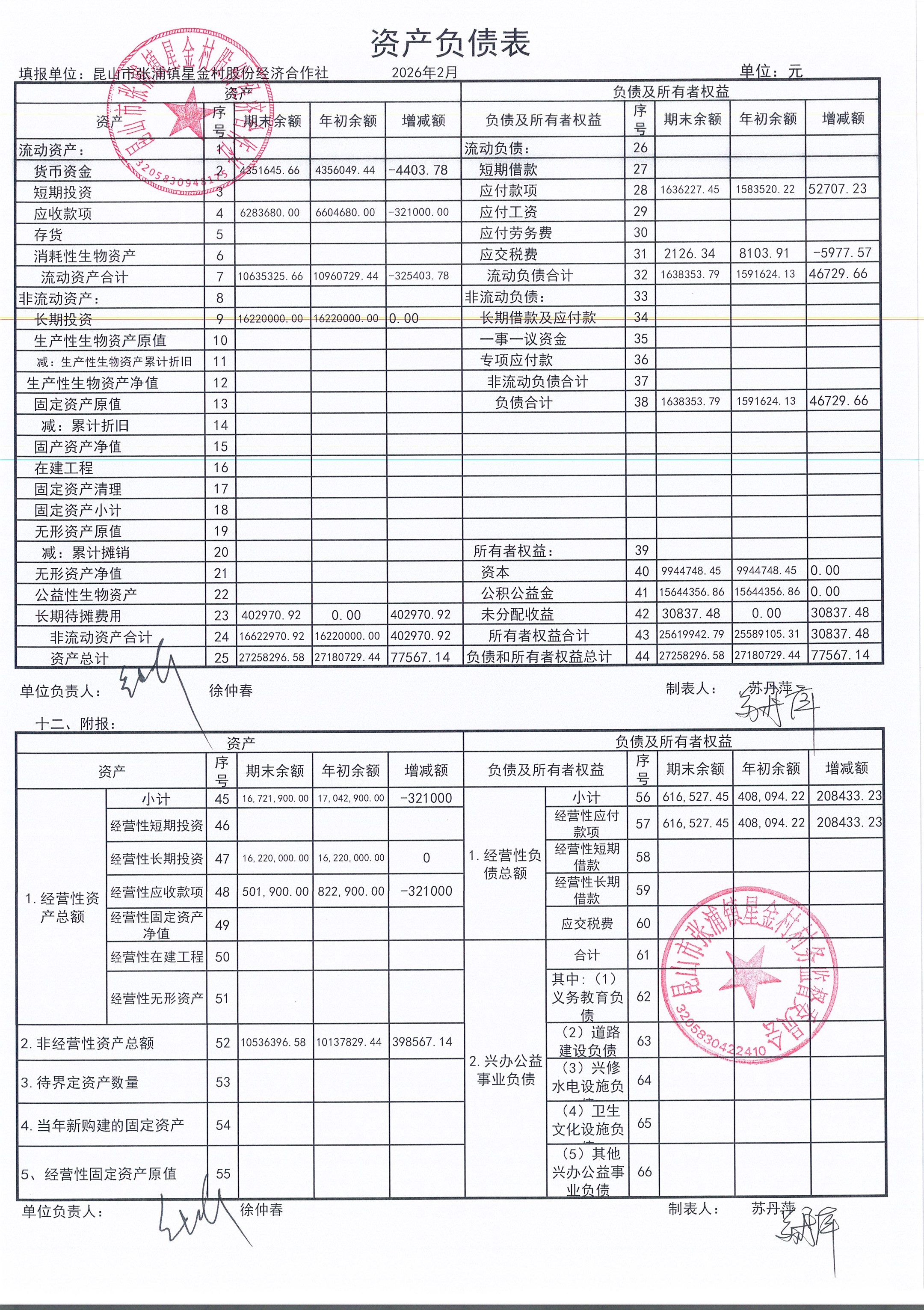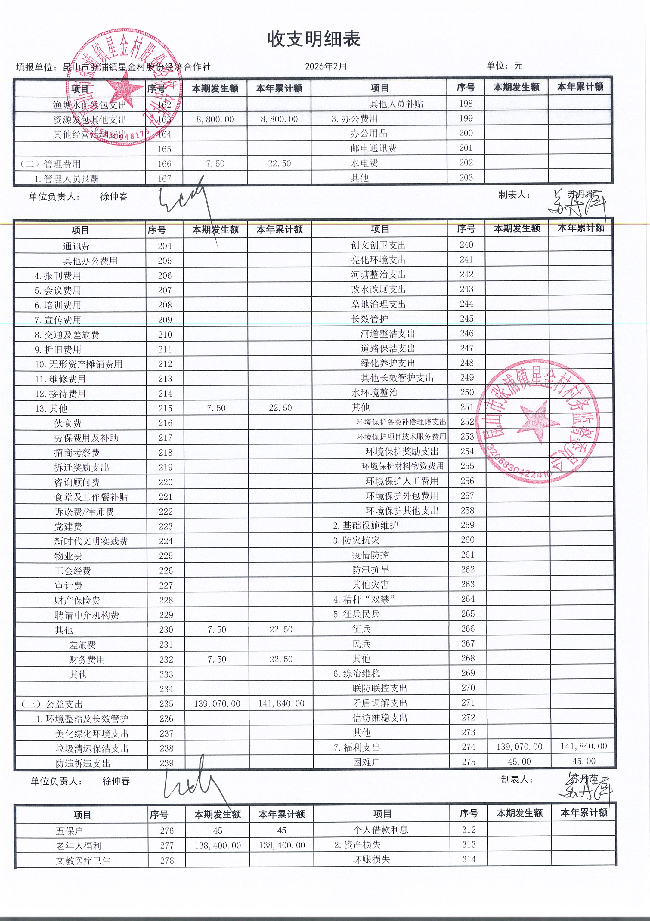 星金村股份经济合作社2026年02月财务公开