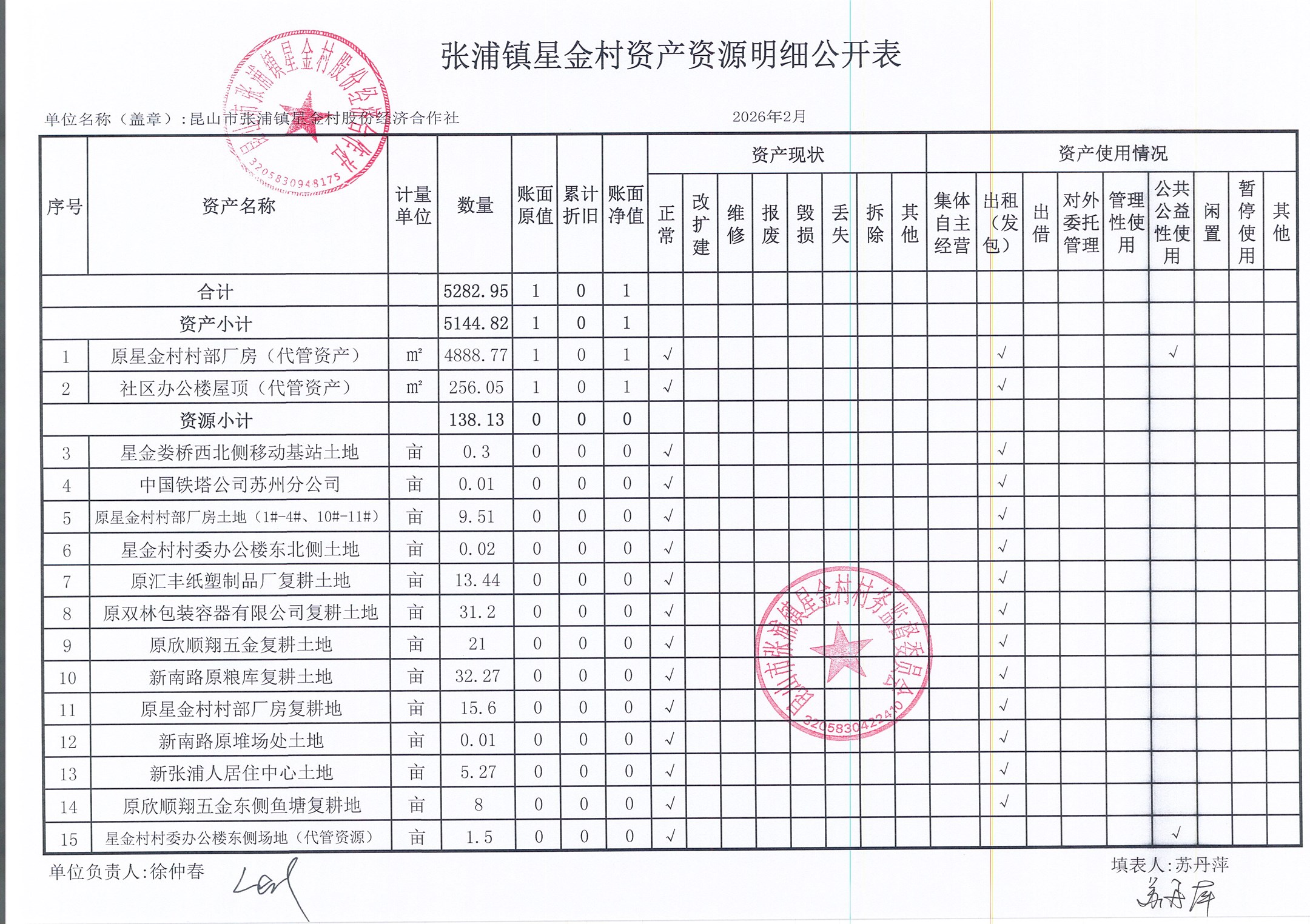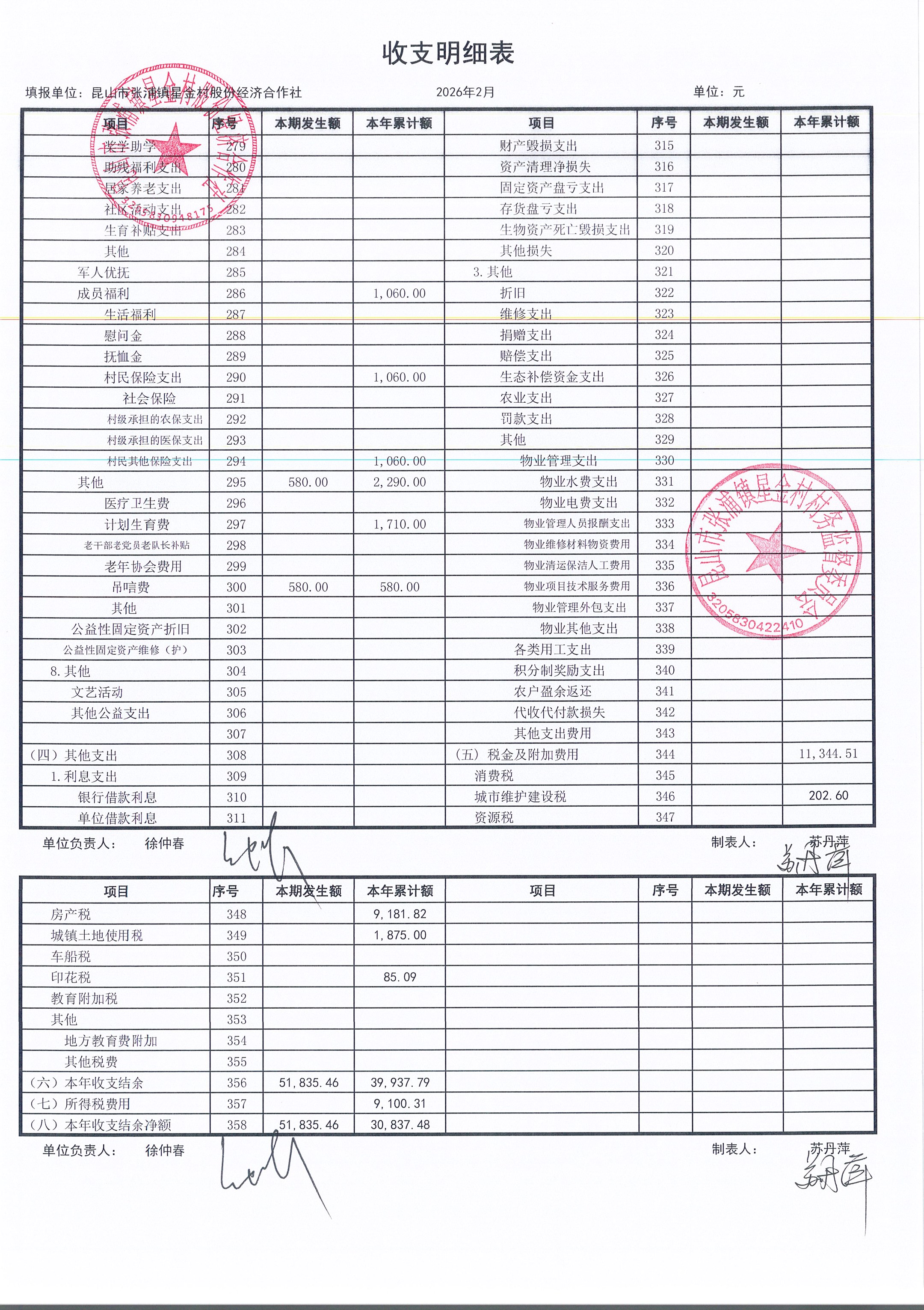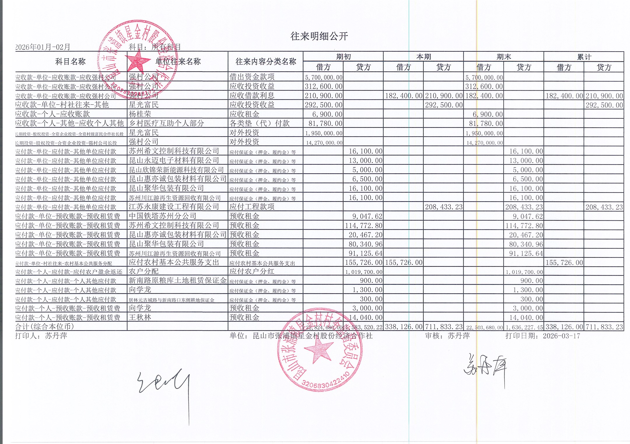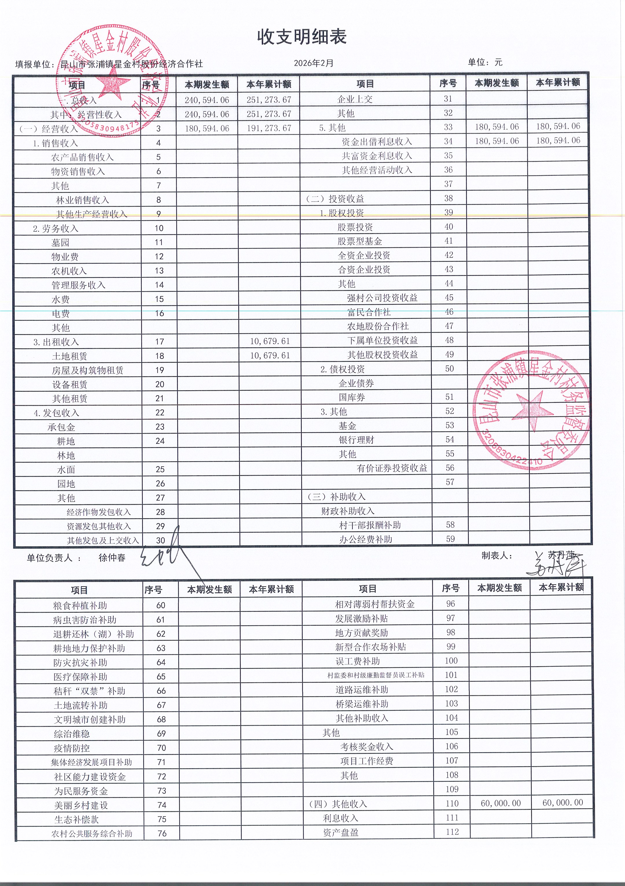星金村股份经济合作社2026年02月财务公开
