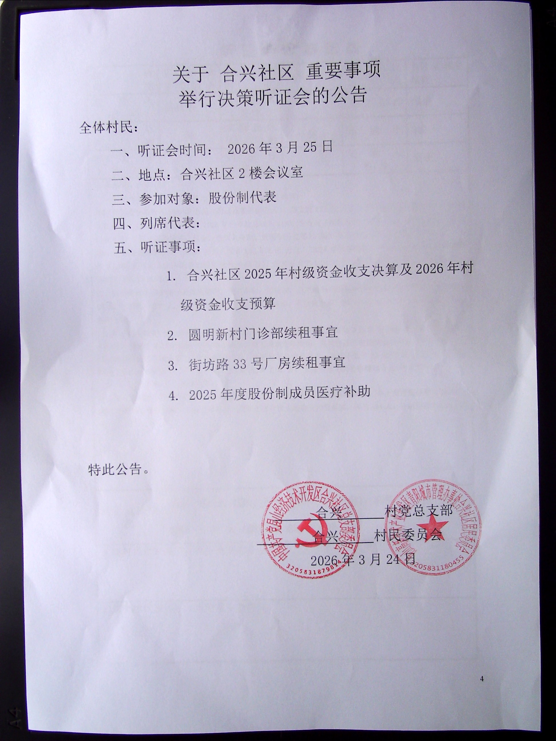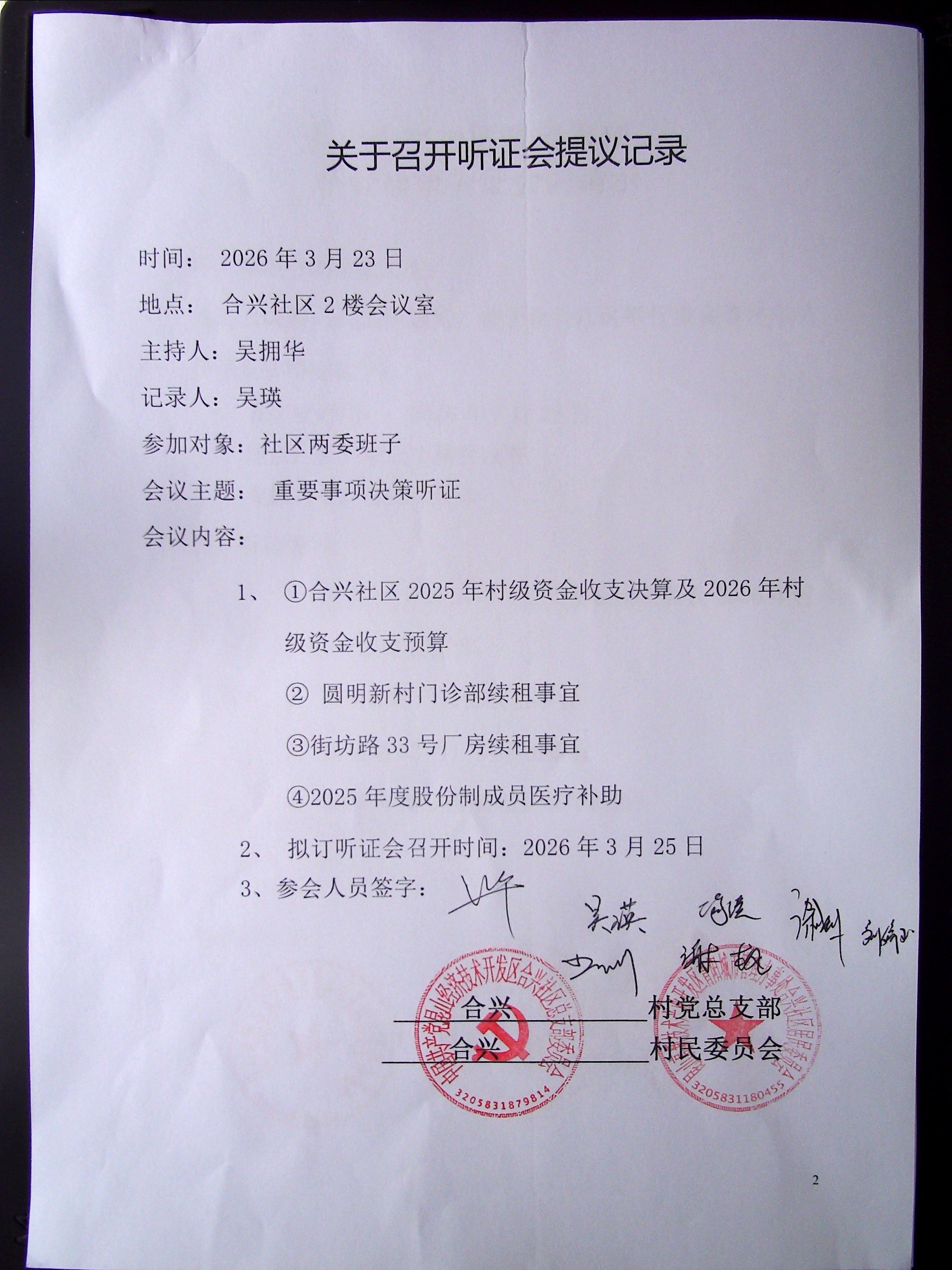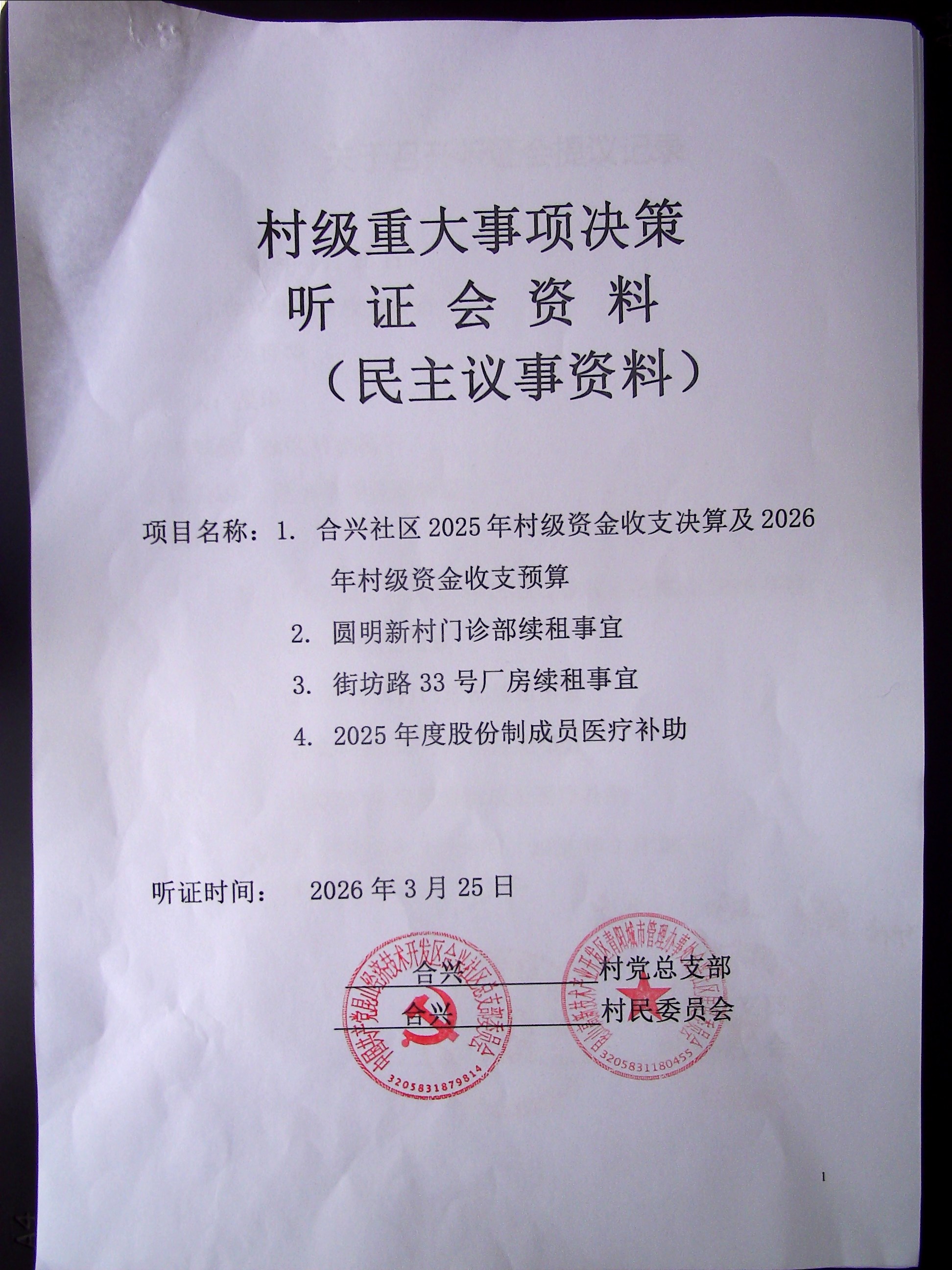 2026.3.25听证会(合兴社区2025年村级资金收支决算及2026年村级资金收支预算、圆明新村门诊部续租事宜、街坊路33号厂房续租事宜、2025年度股份制成员医疗补助)