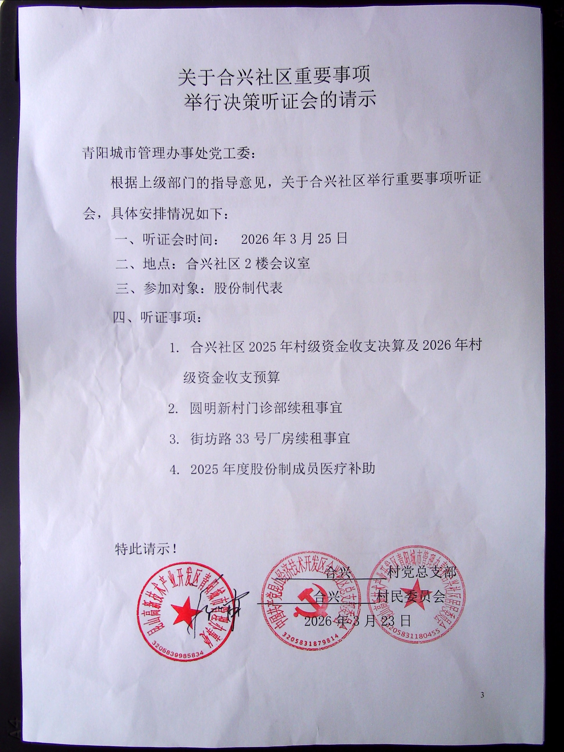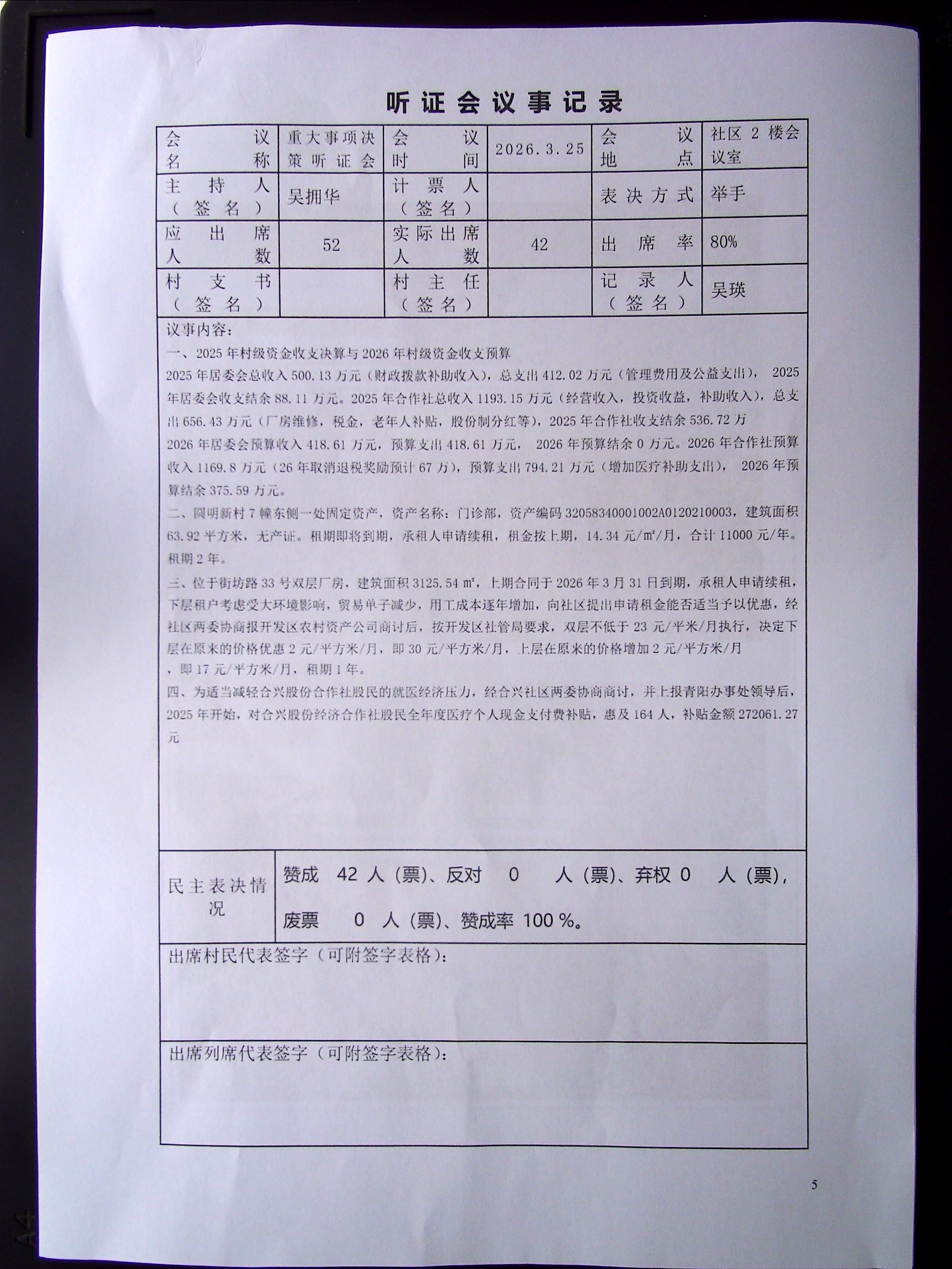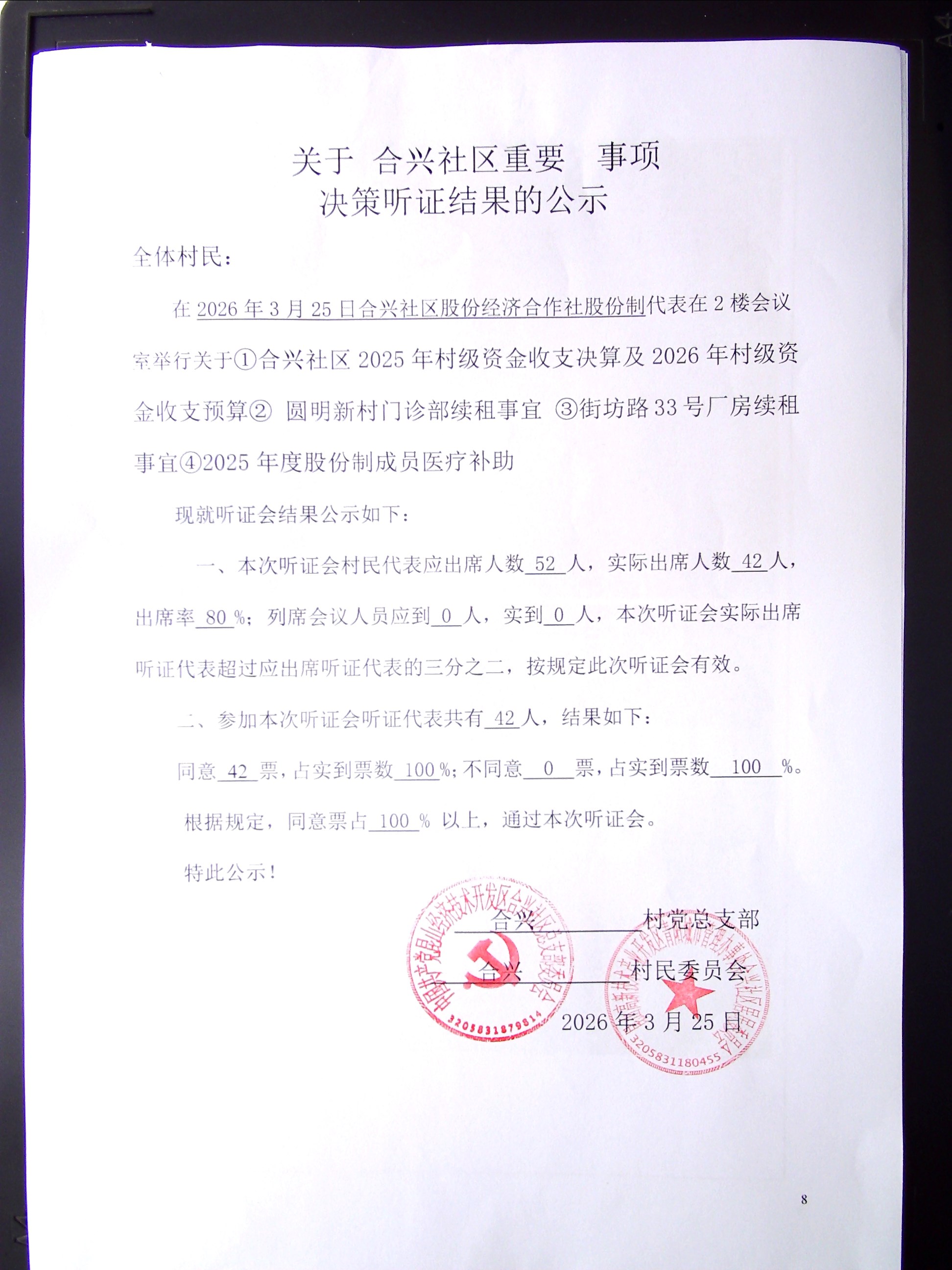 2026.3.25听证会(合兴社区2025年村级资金收支决算及2026年村级资金收支预算、圆明新村门诊部续租事宜、街坊路33号厂房续租事宜、2025年度股份制成员医疗补助)