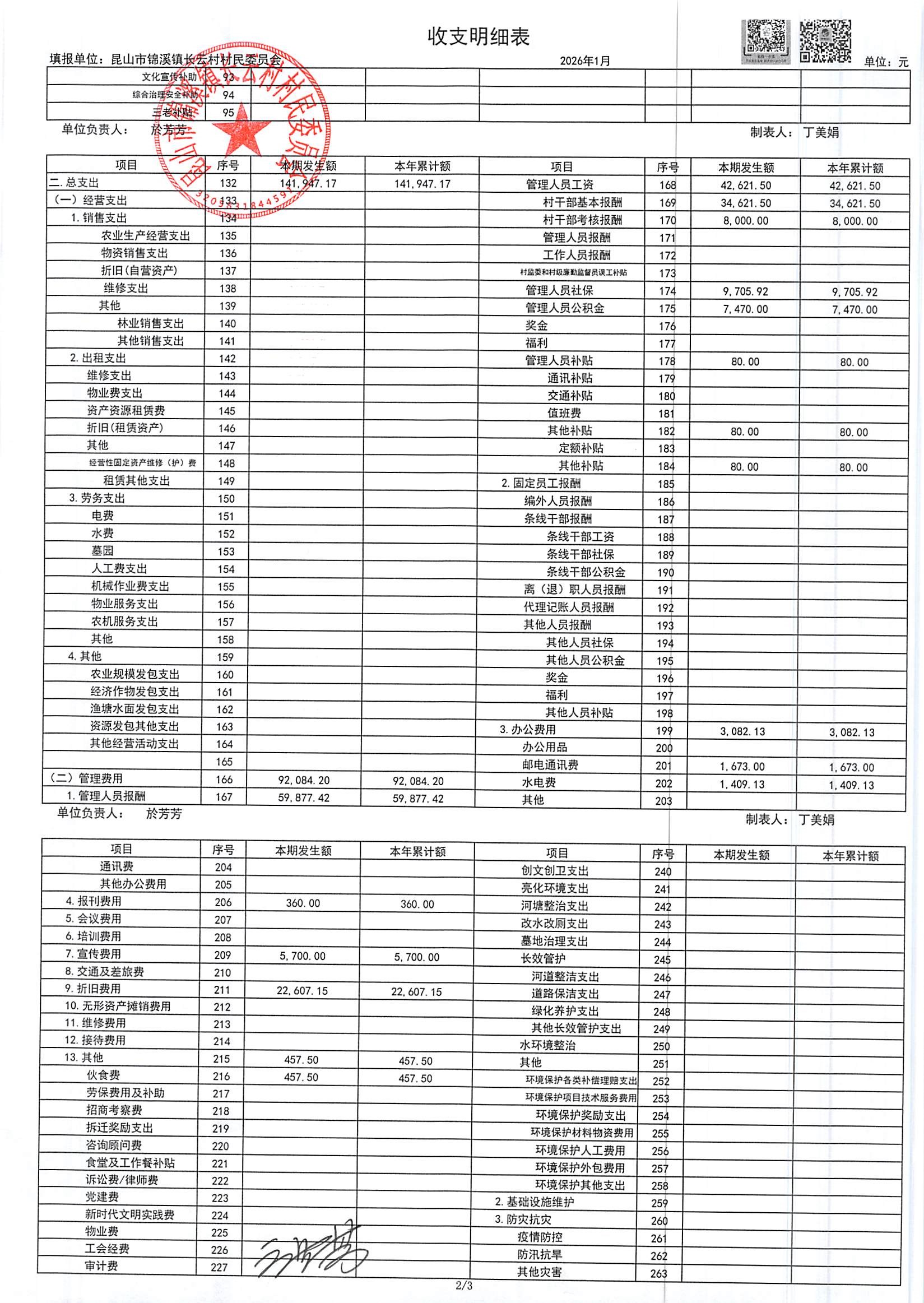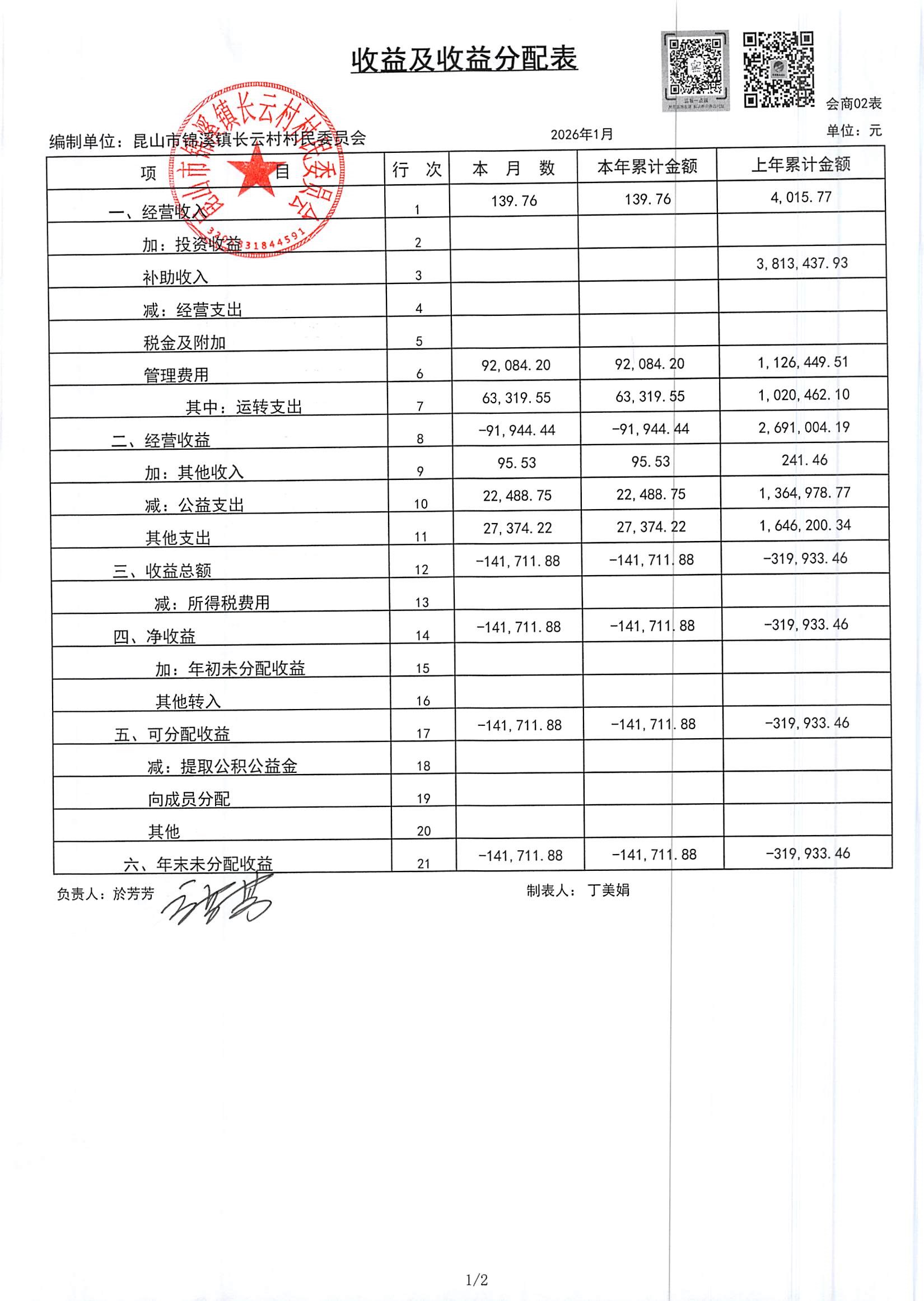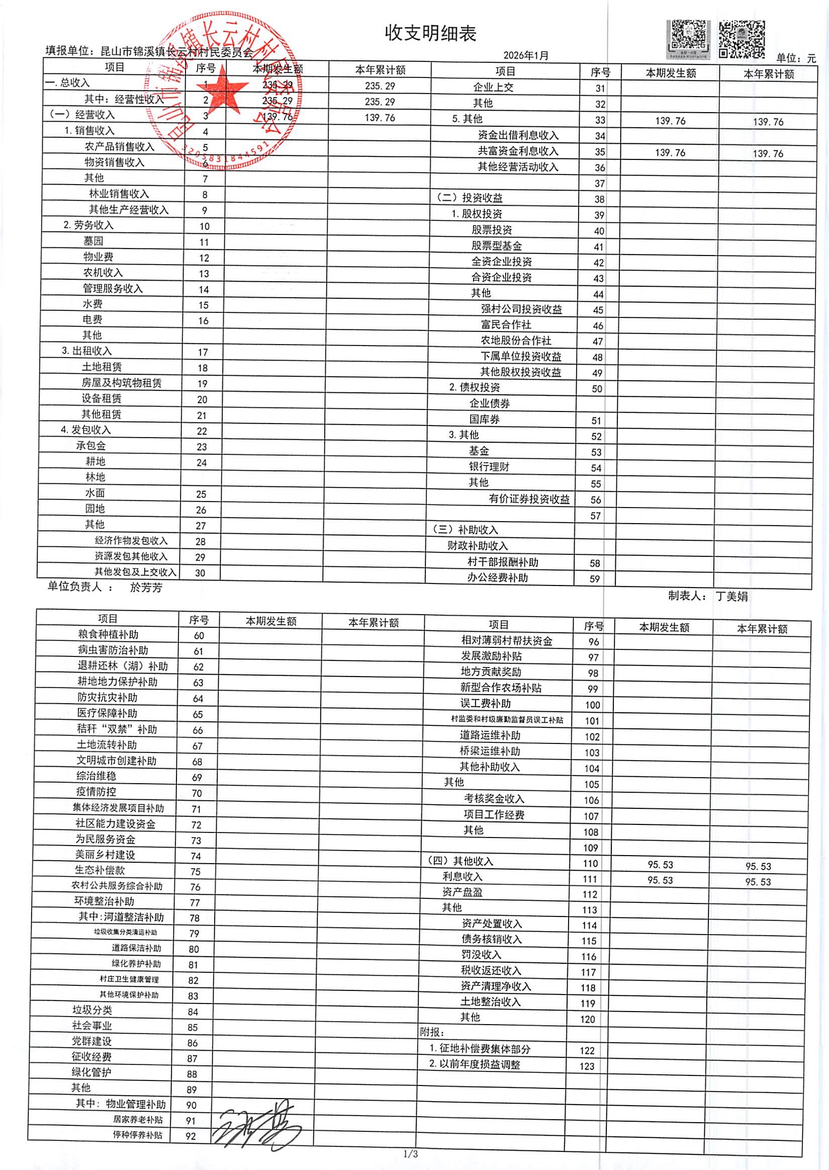 2026年第一季度财务公开定期公开(村委会)(1月份)