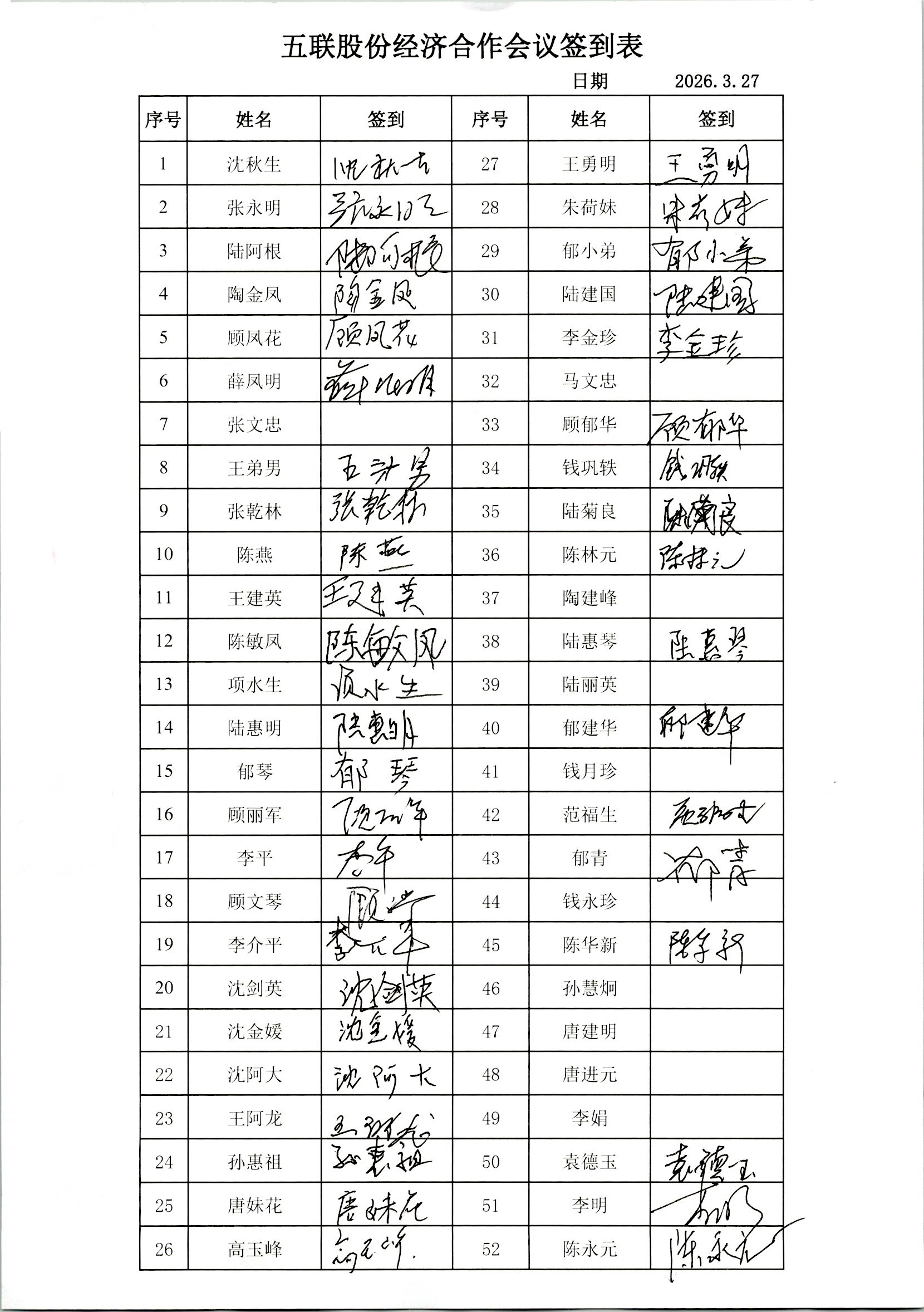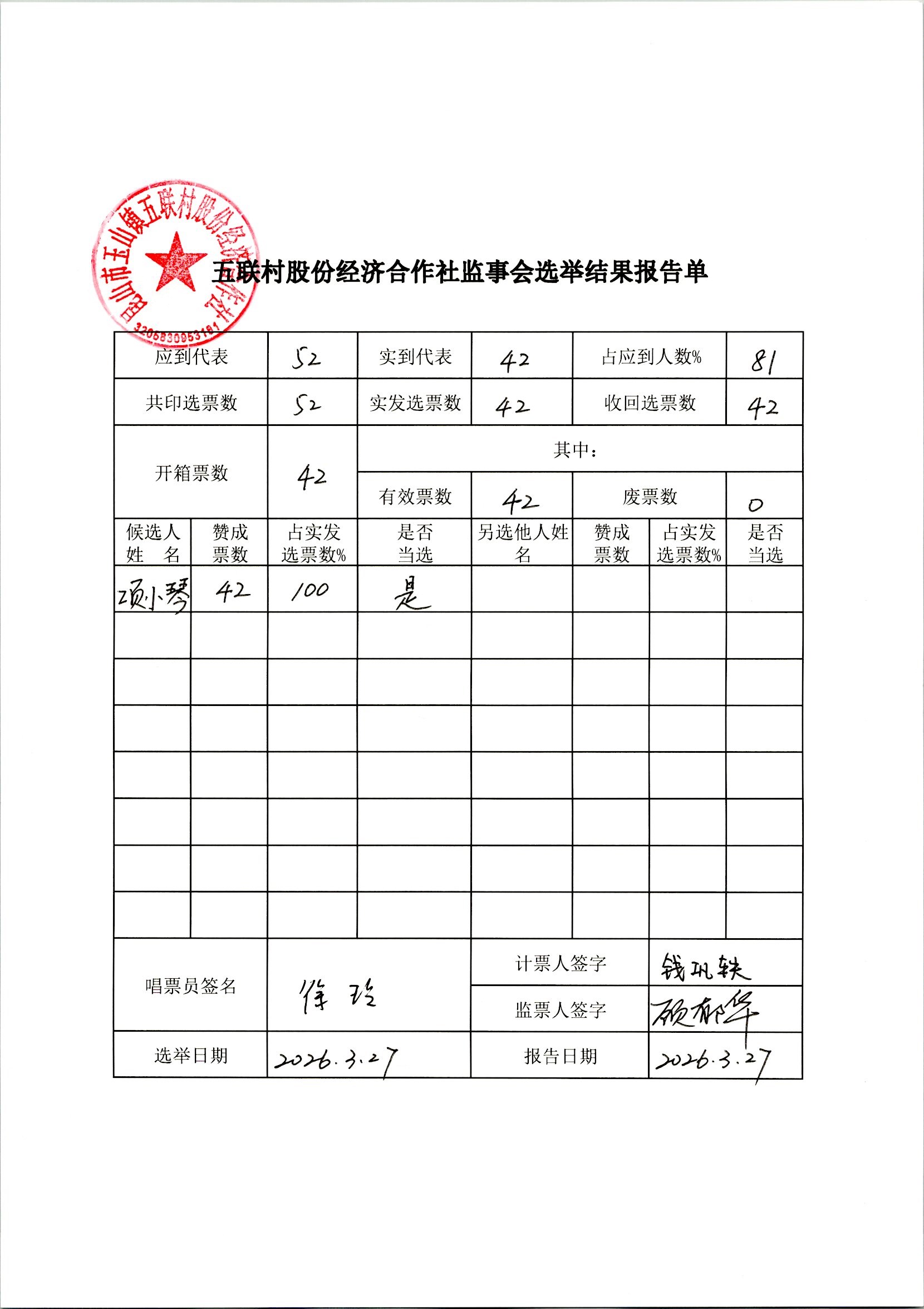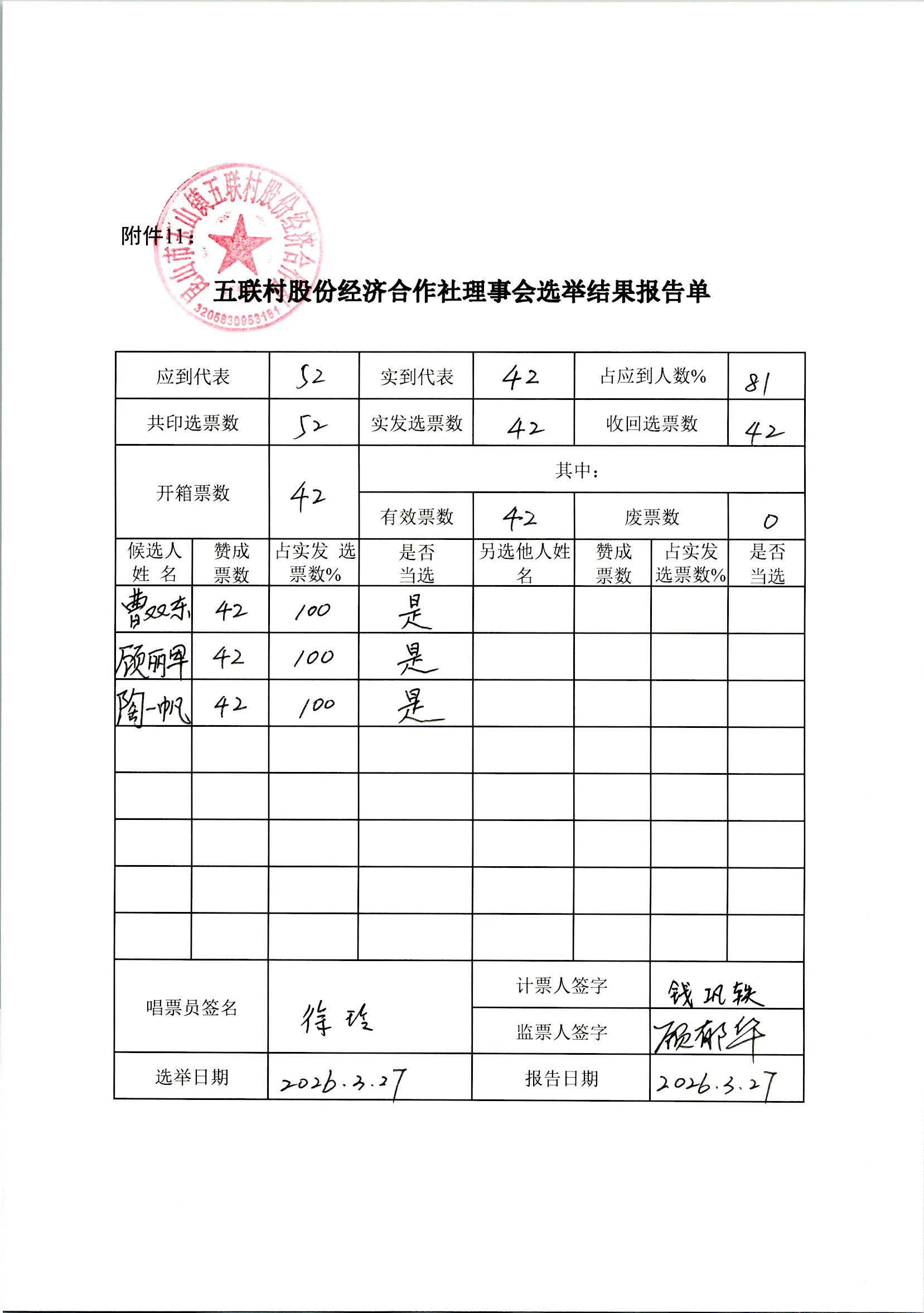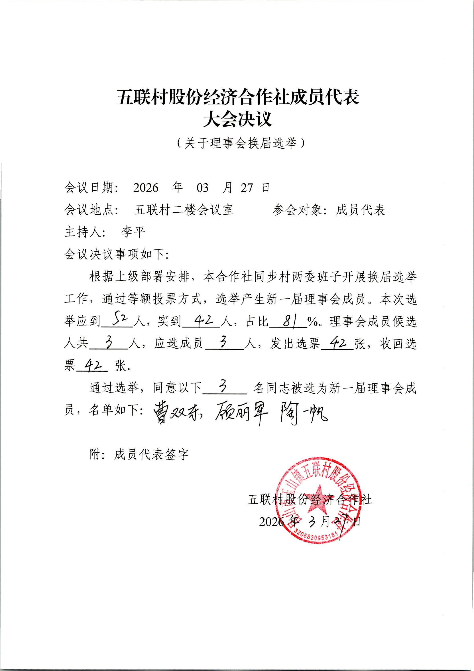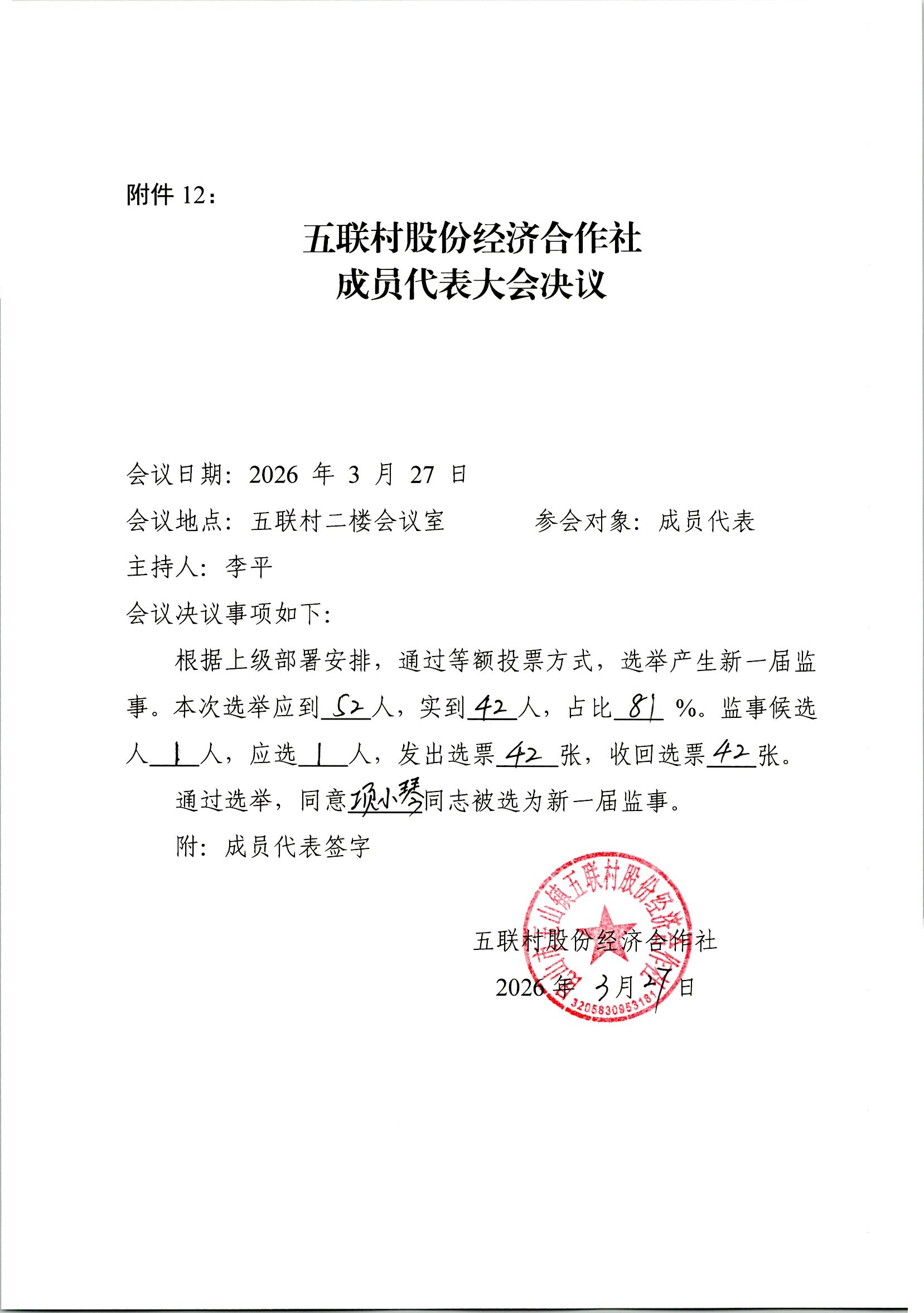 五联村股份经济合作社理事会、监事会决议、报告单公示(理事会、监事会选举)