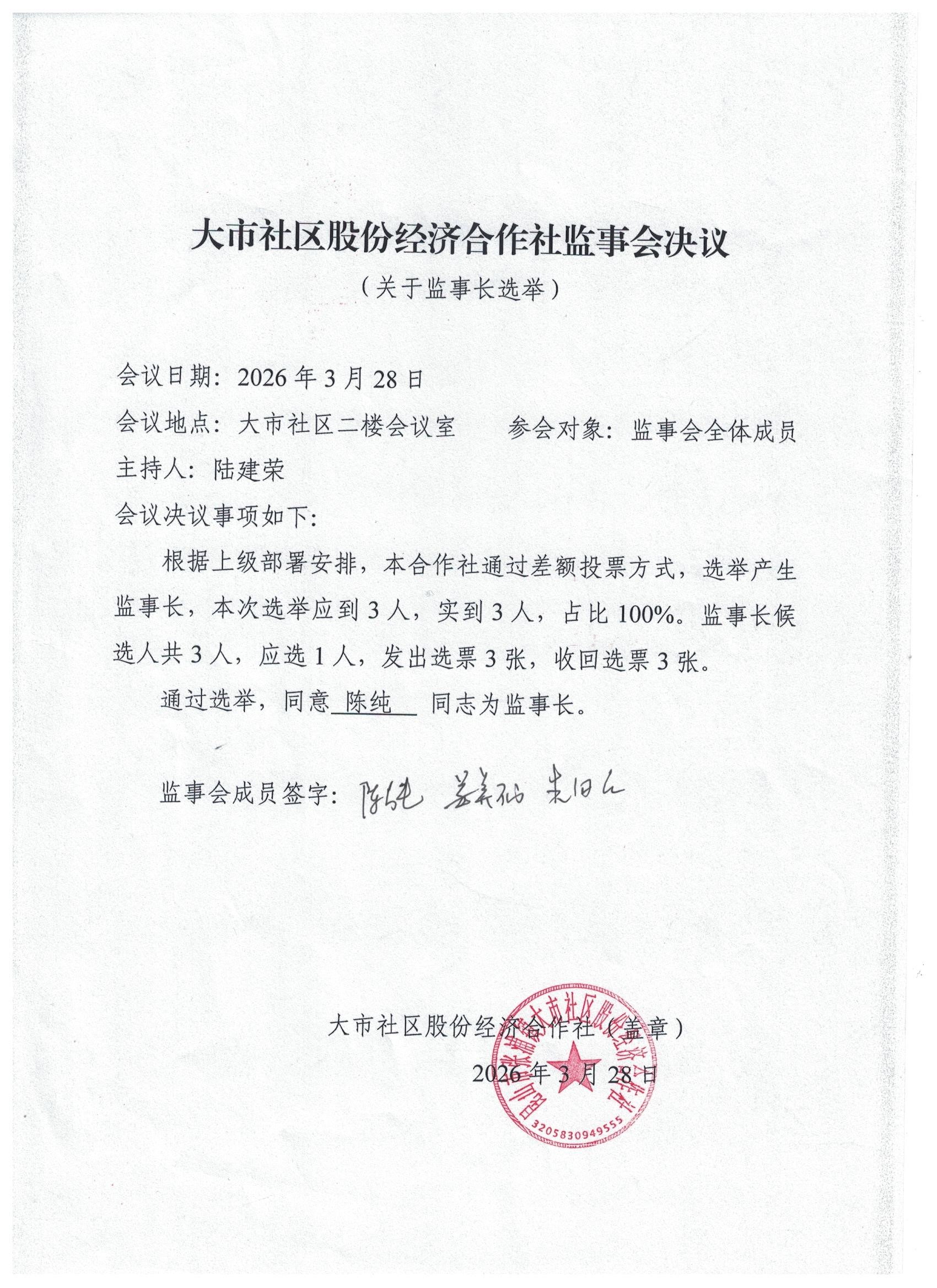 大市社区股份经济合作社换届选举监事会决议