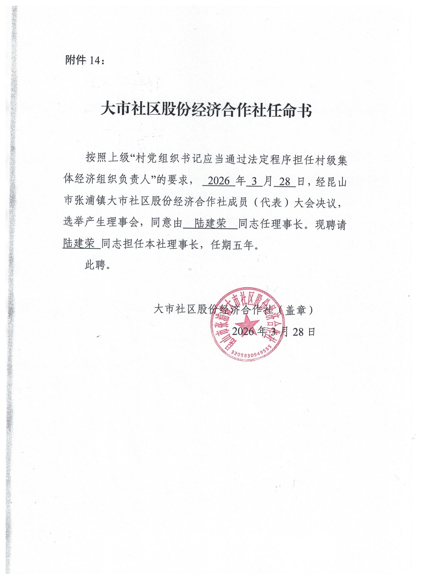 大市社区股份经济合作社换届选举任命书(外村书记)