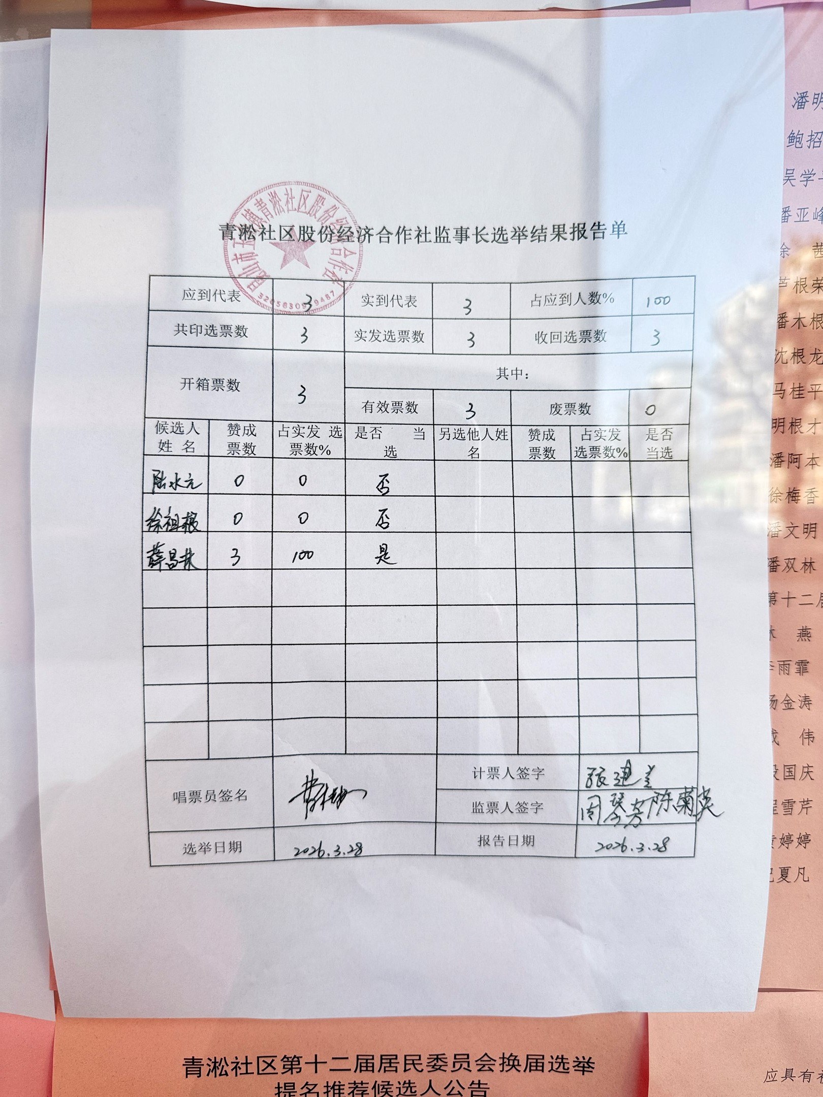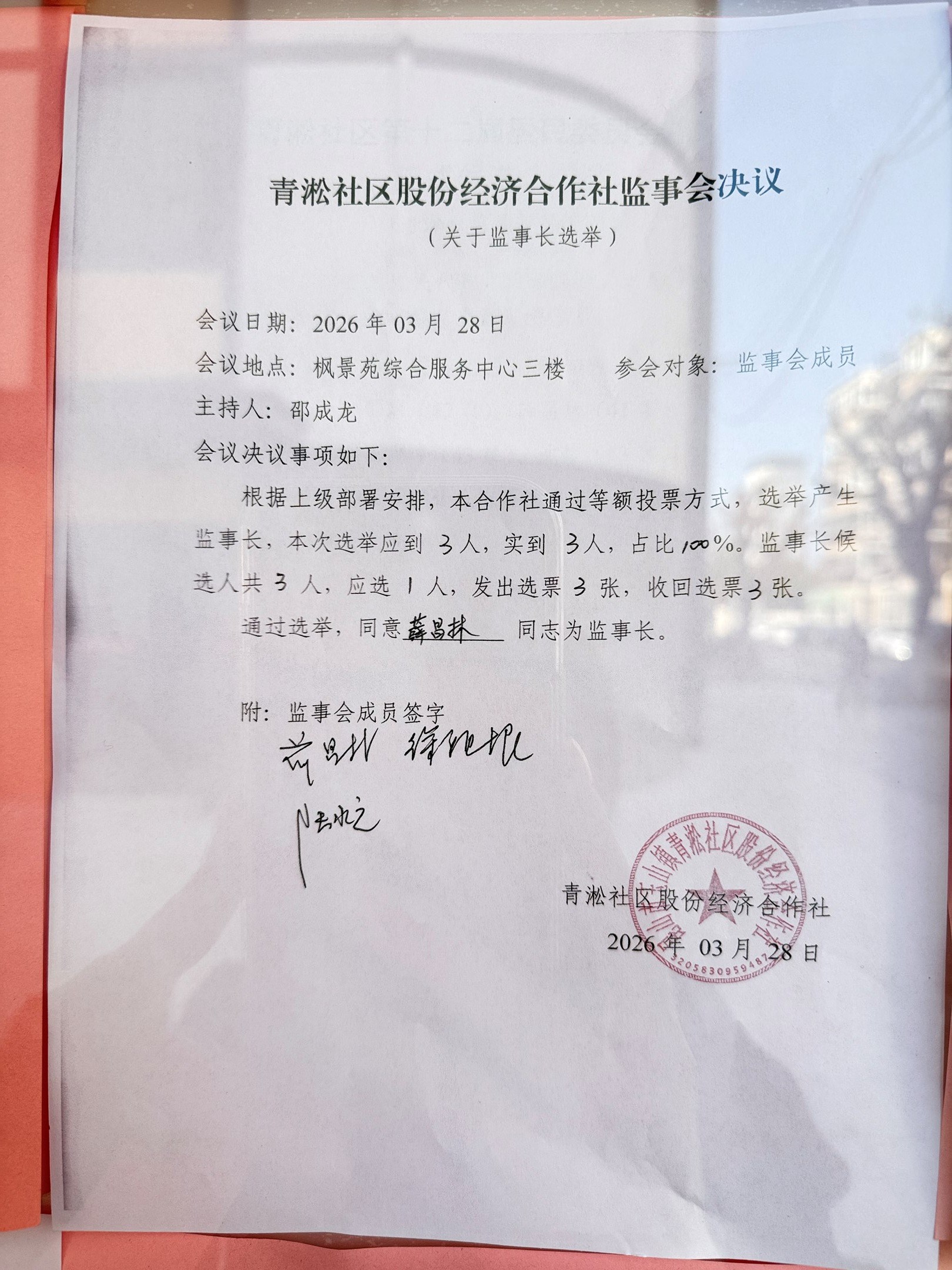青淞社区股份经济合作社监事会决议及结果报告单(关于监事长选举)