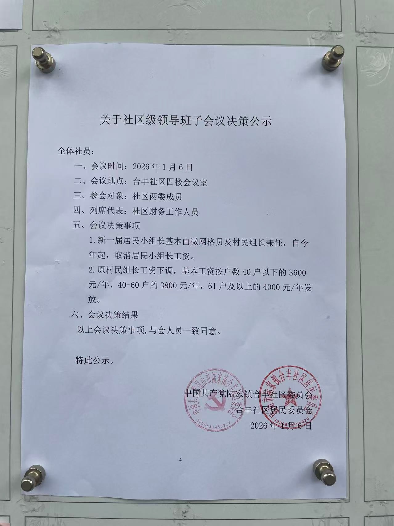 关于社区级领导班子会议决策公示(居民组长工资取消等)