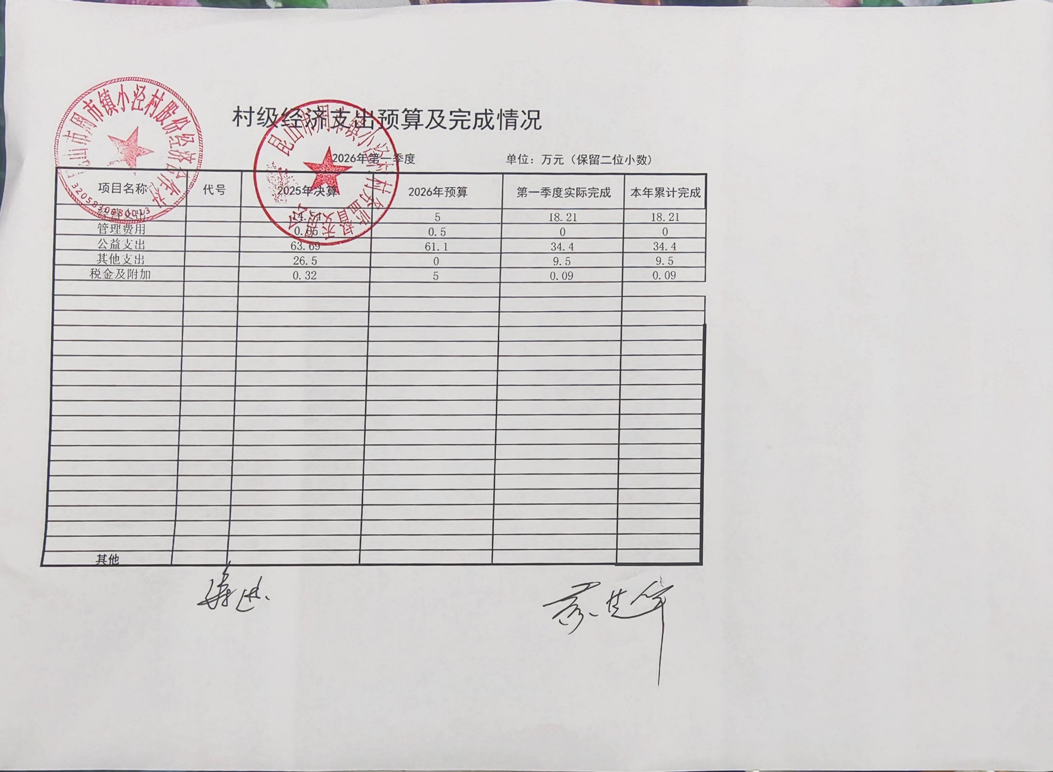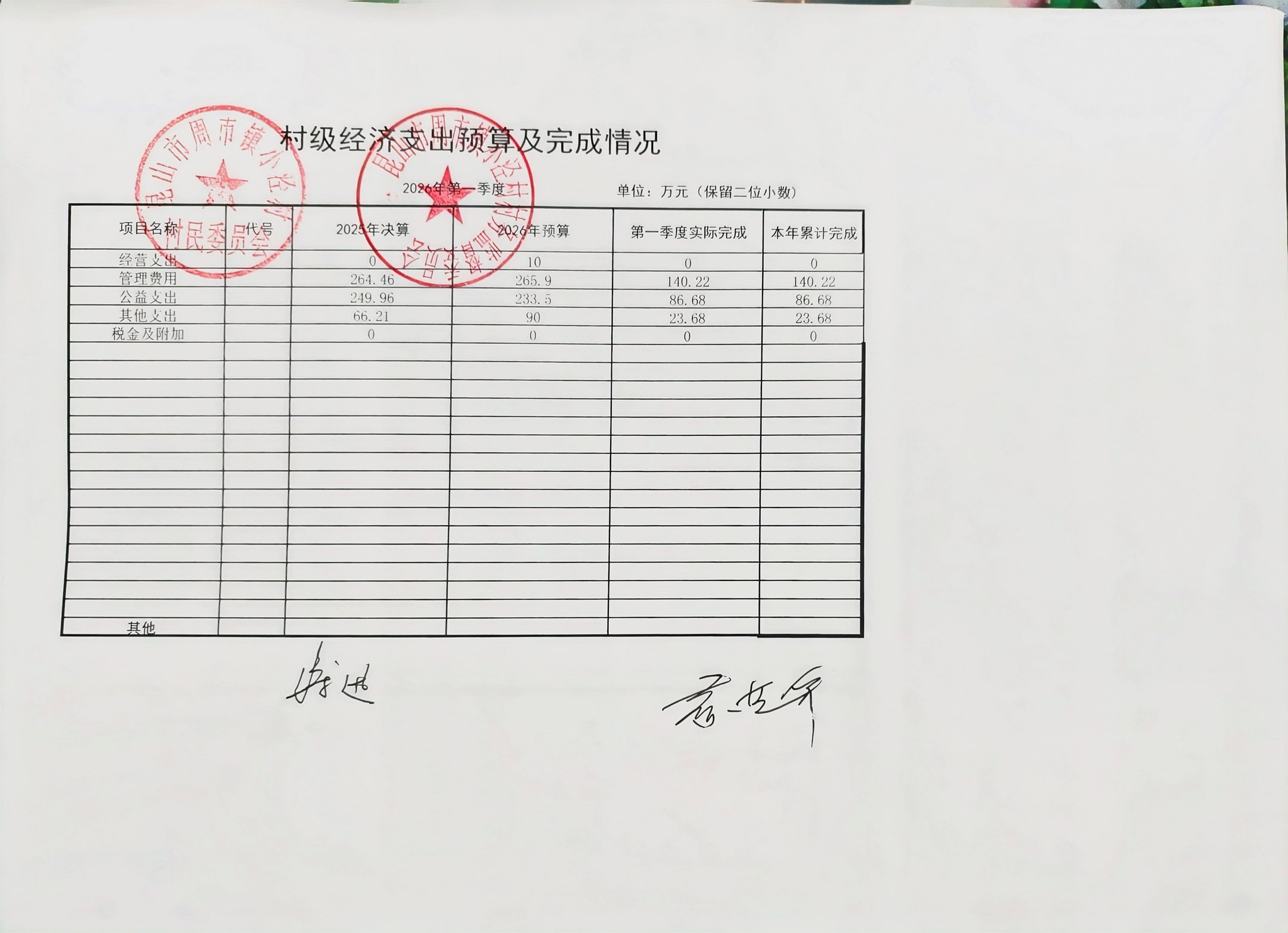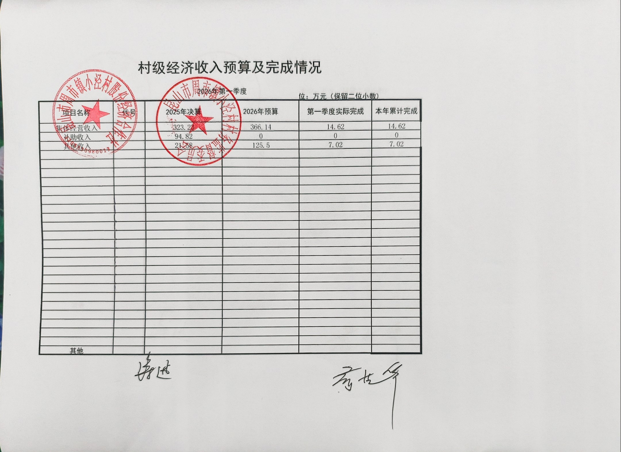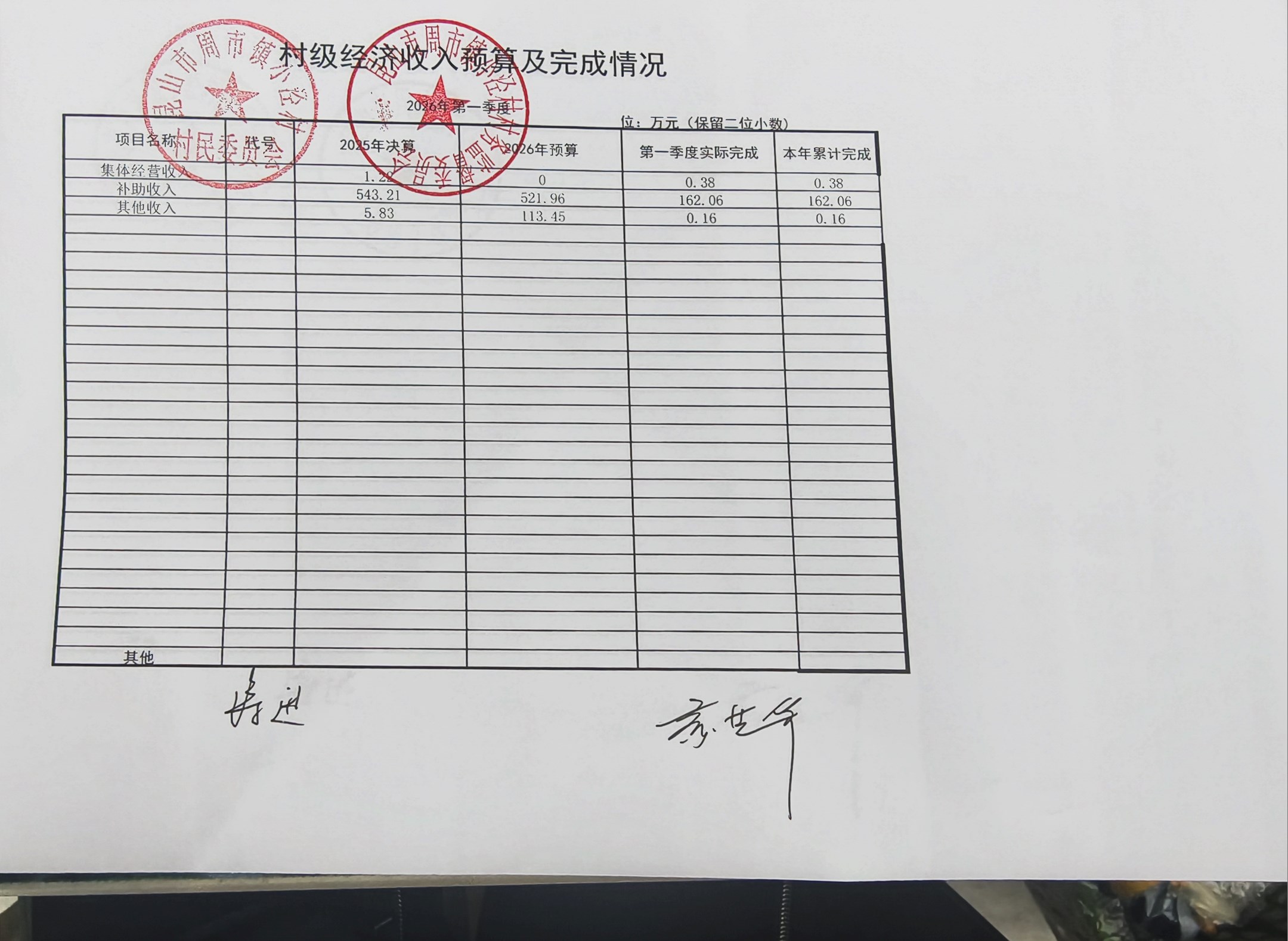 小泾村2026年第一季度财务公开