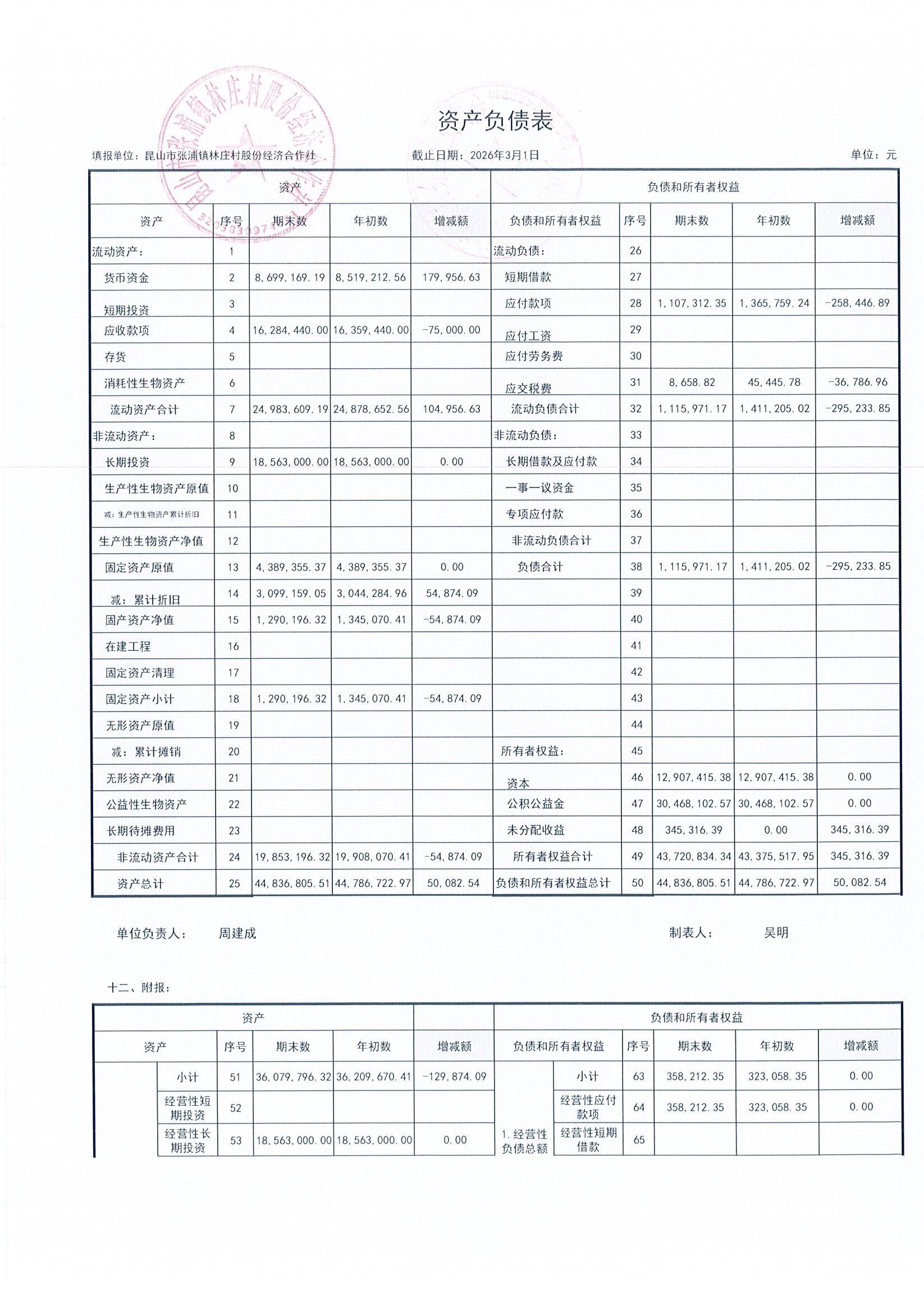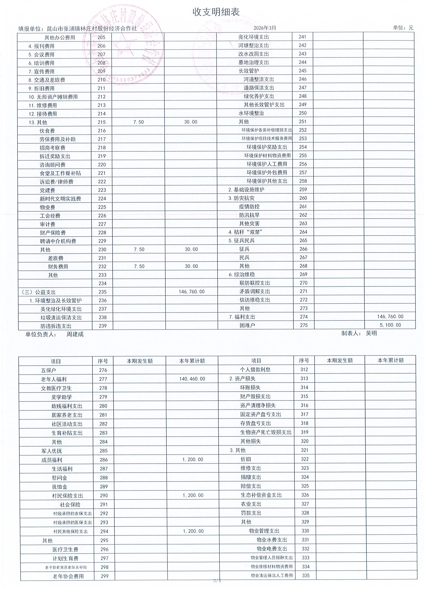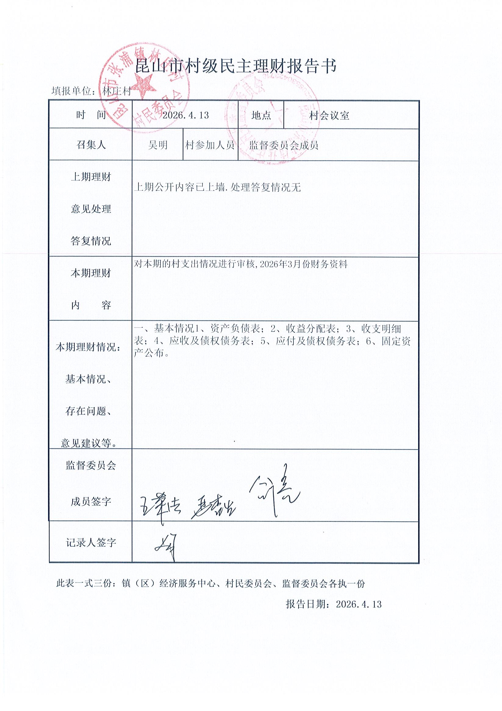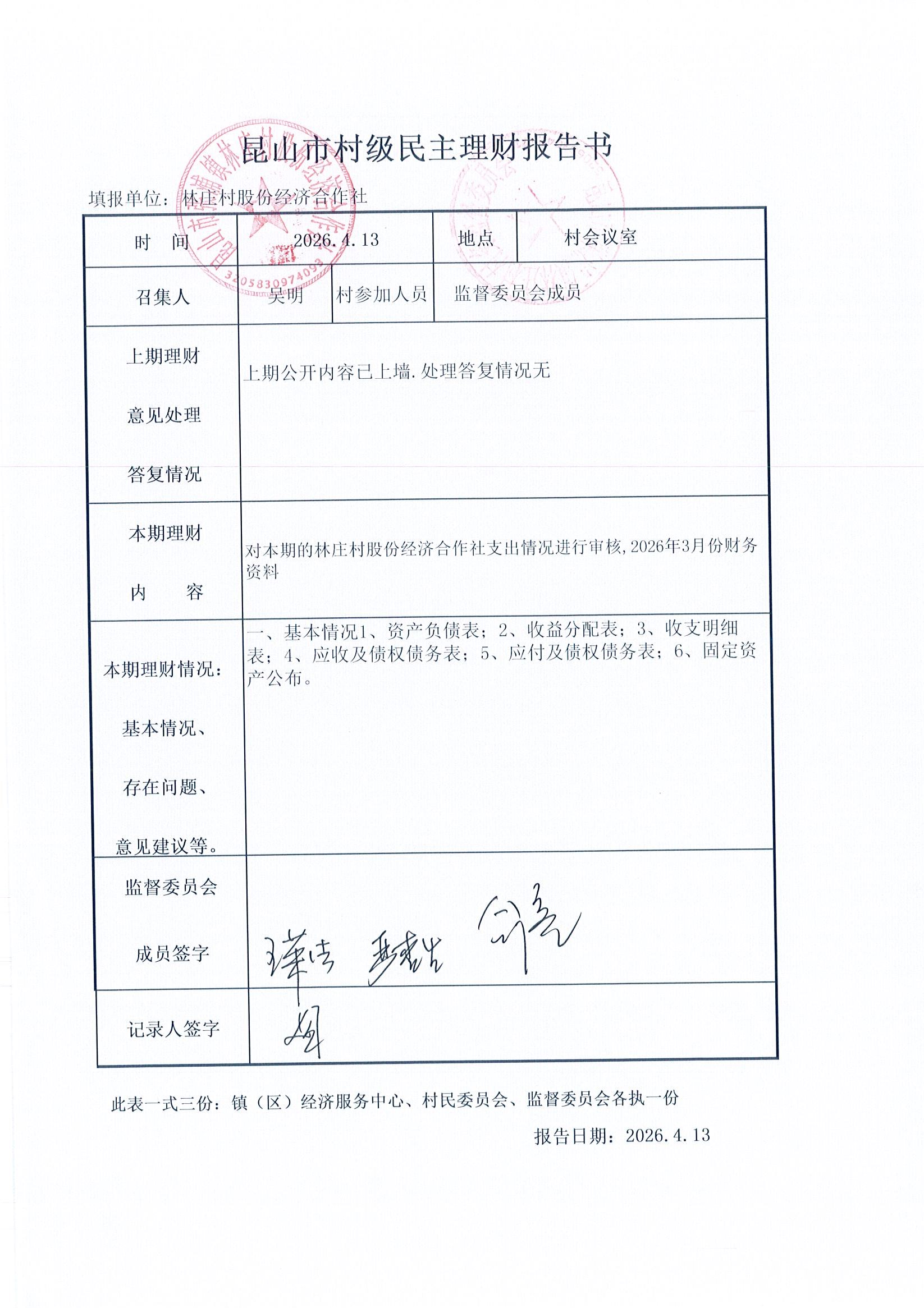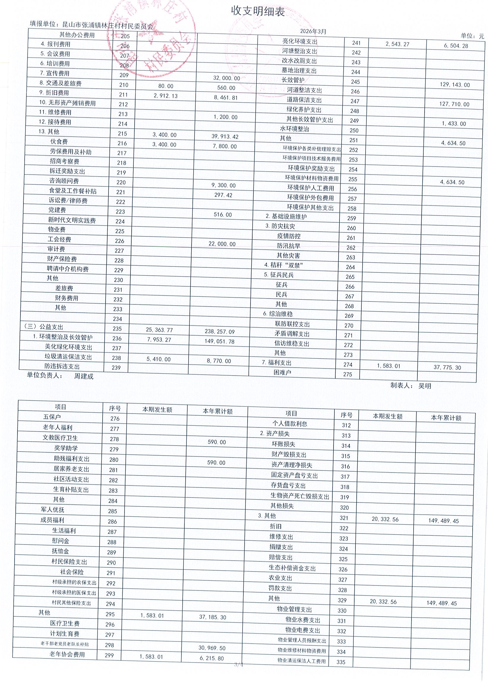 2026年林庄村及股份经济合作社3月财务公开