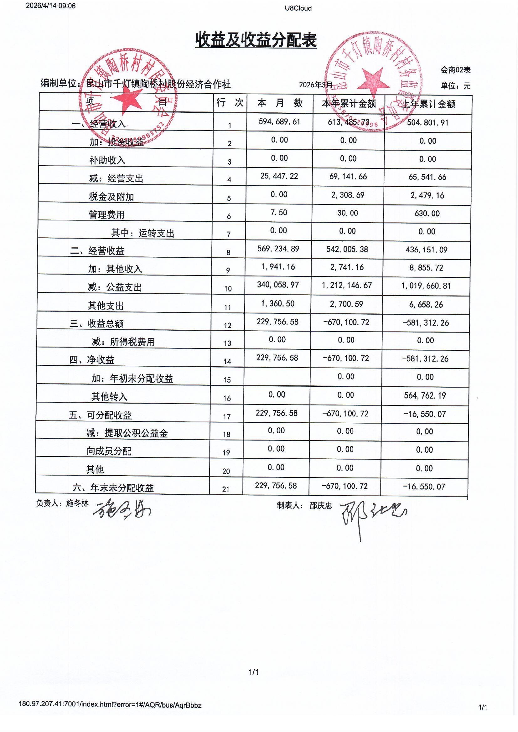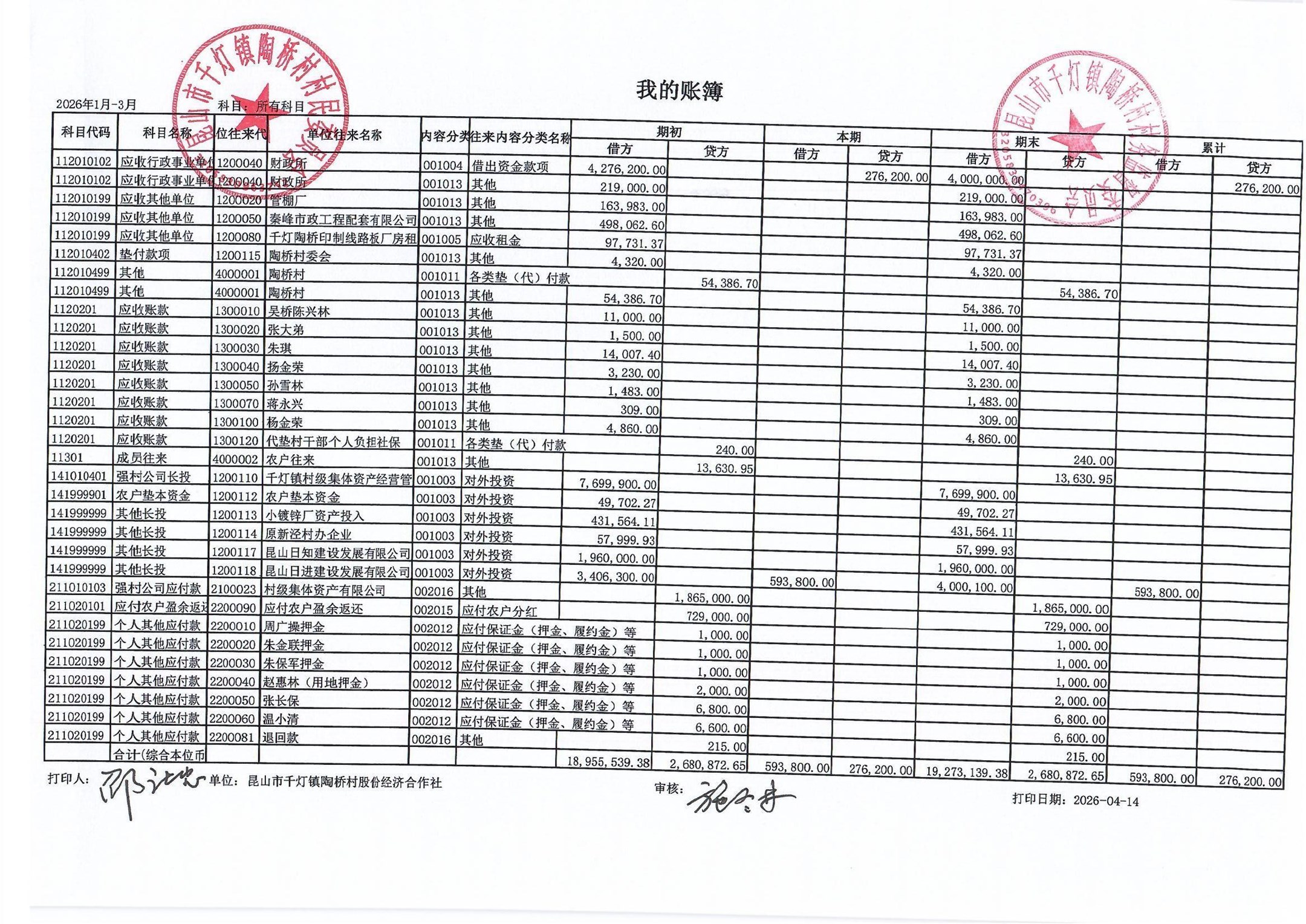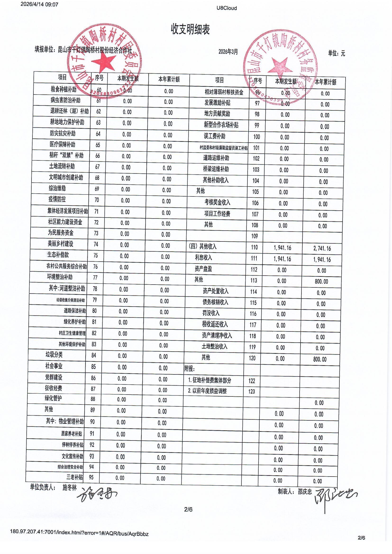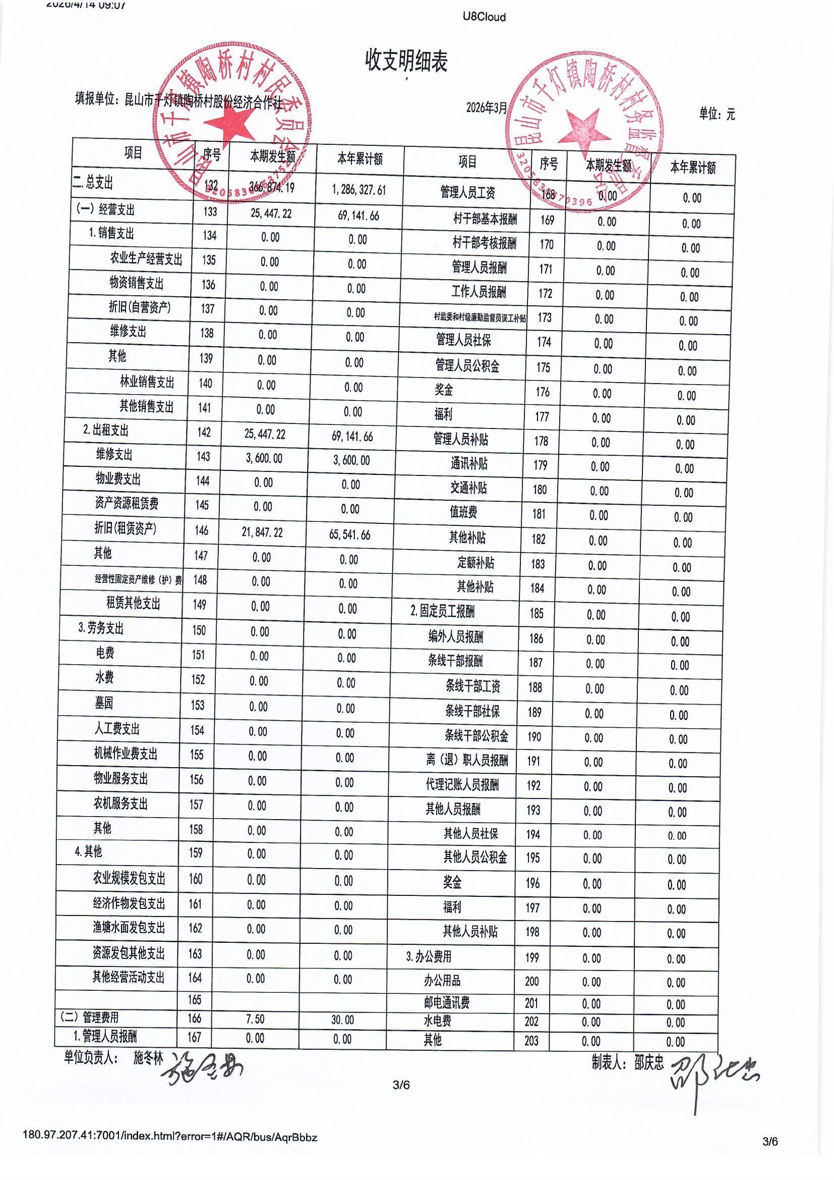 陶桥村股份经济合作社2026年3月财务公开内容: