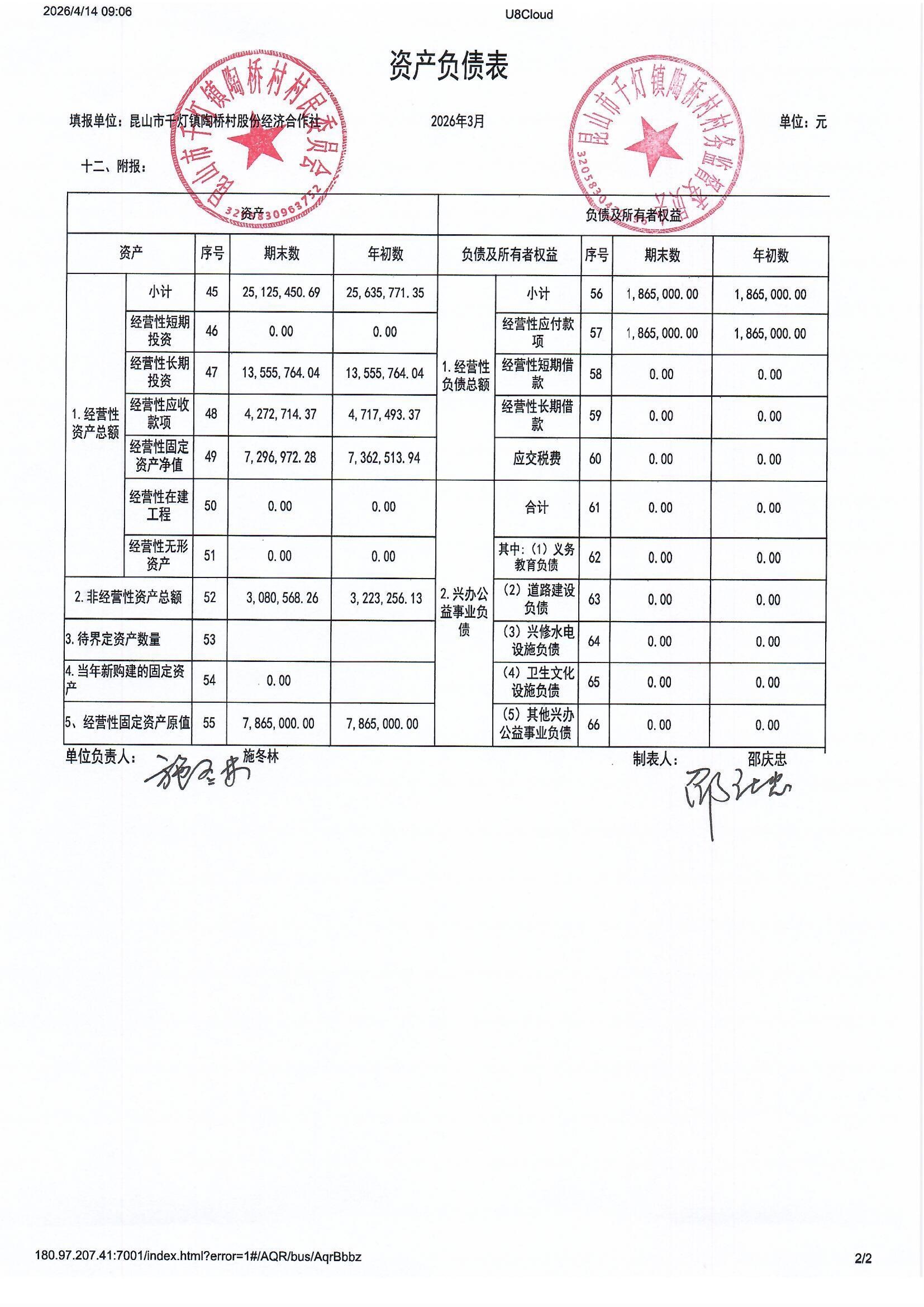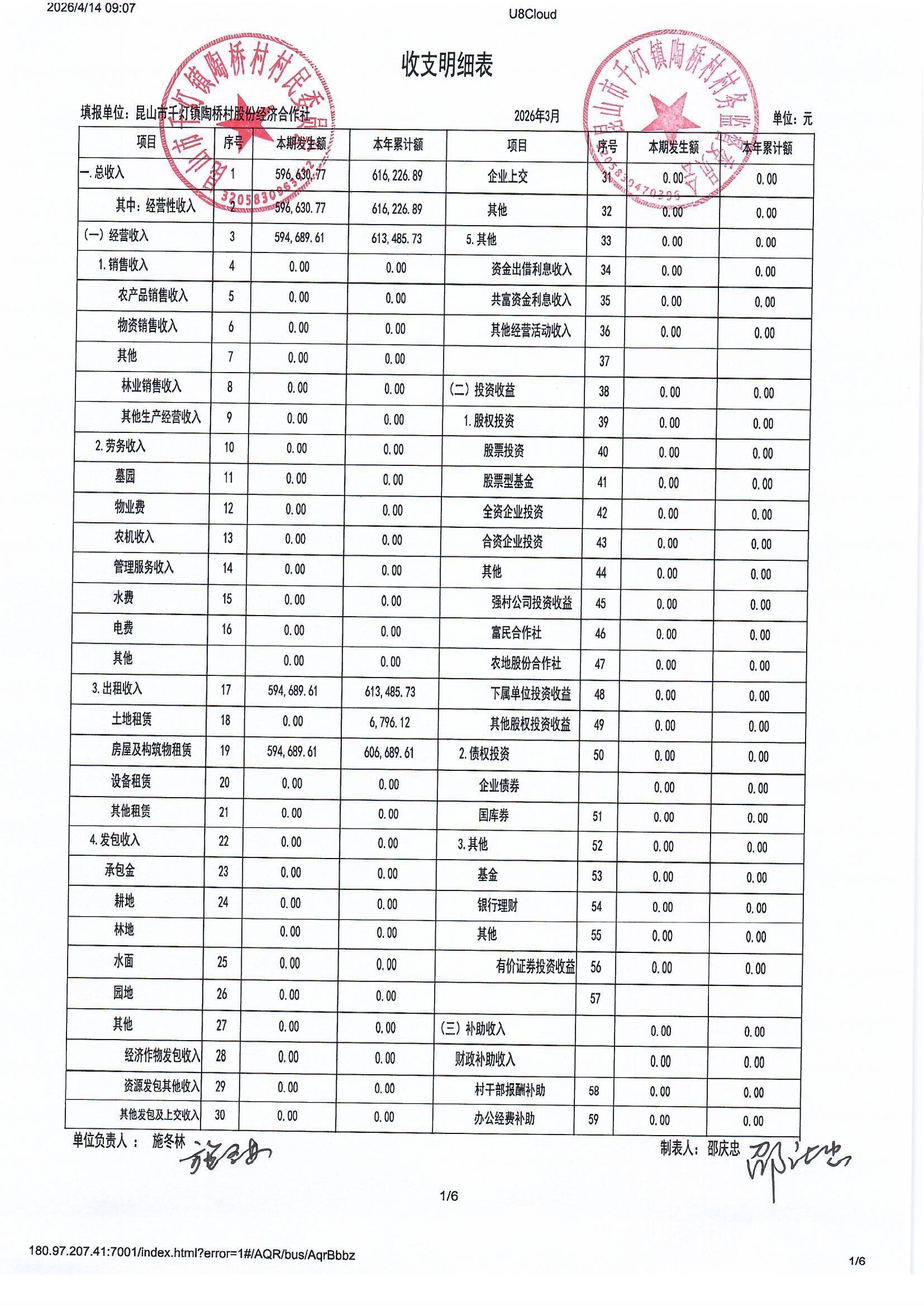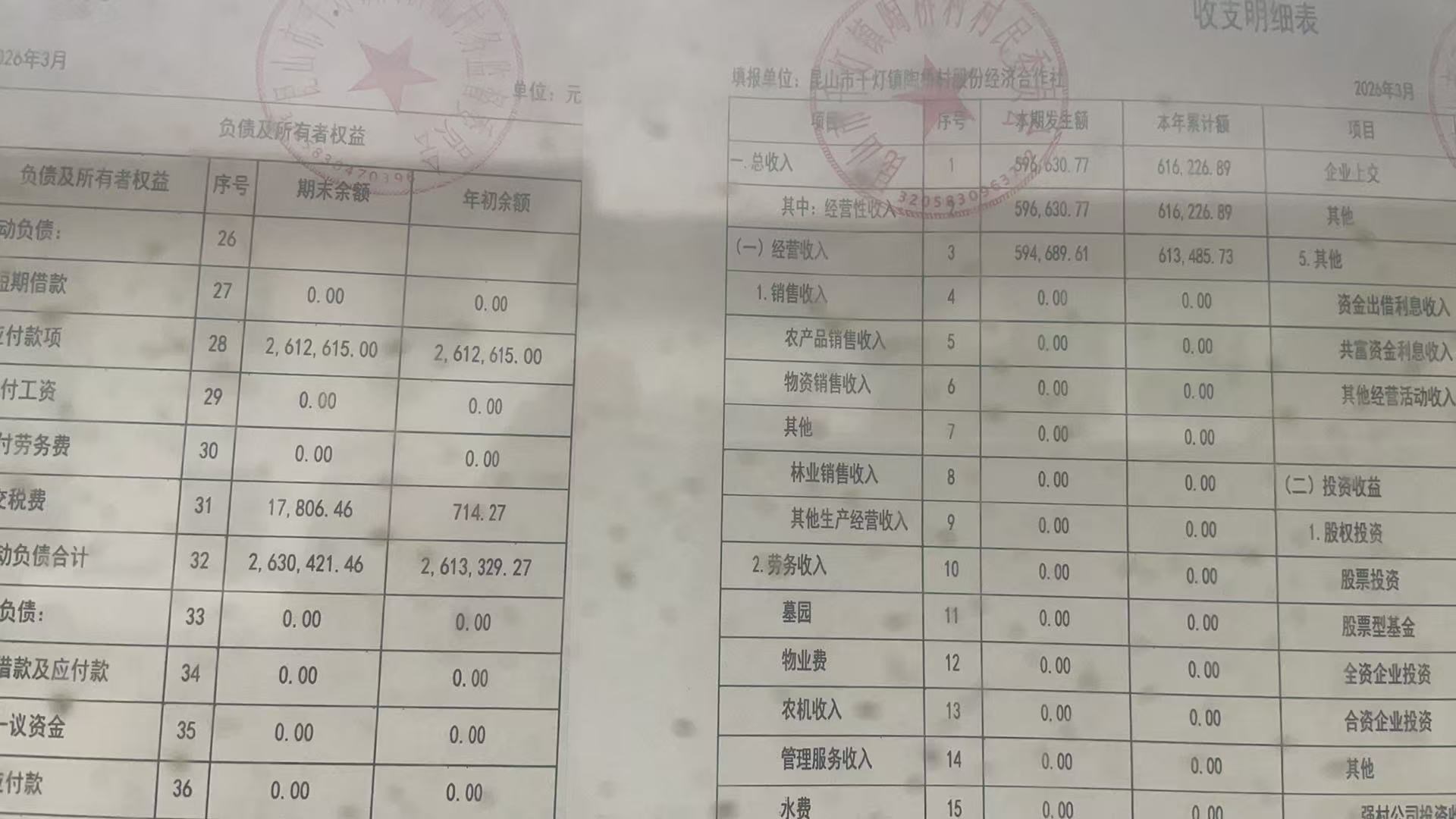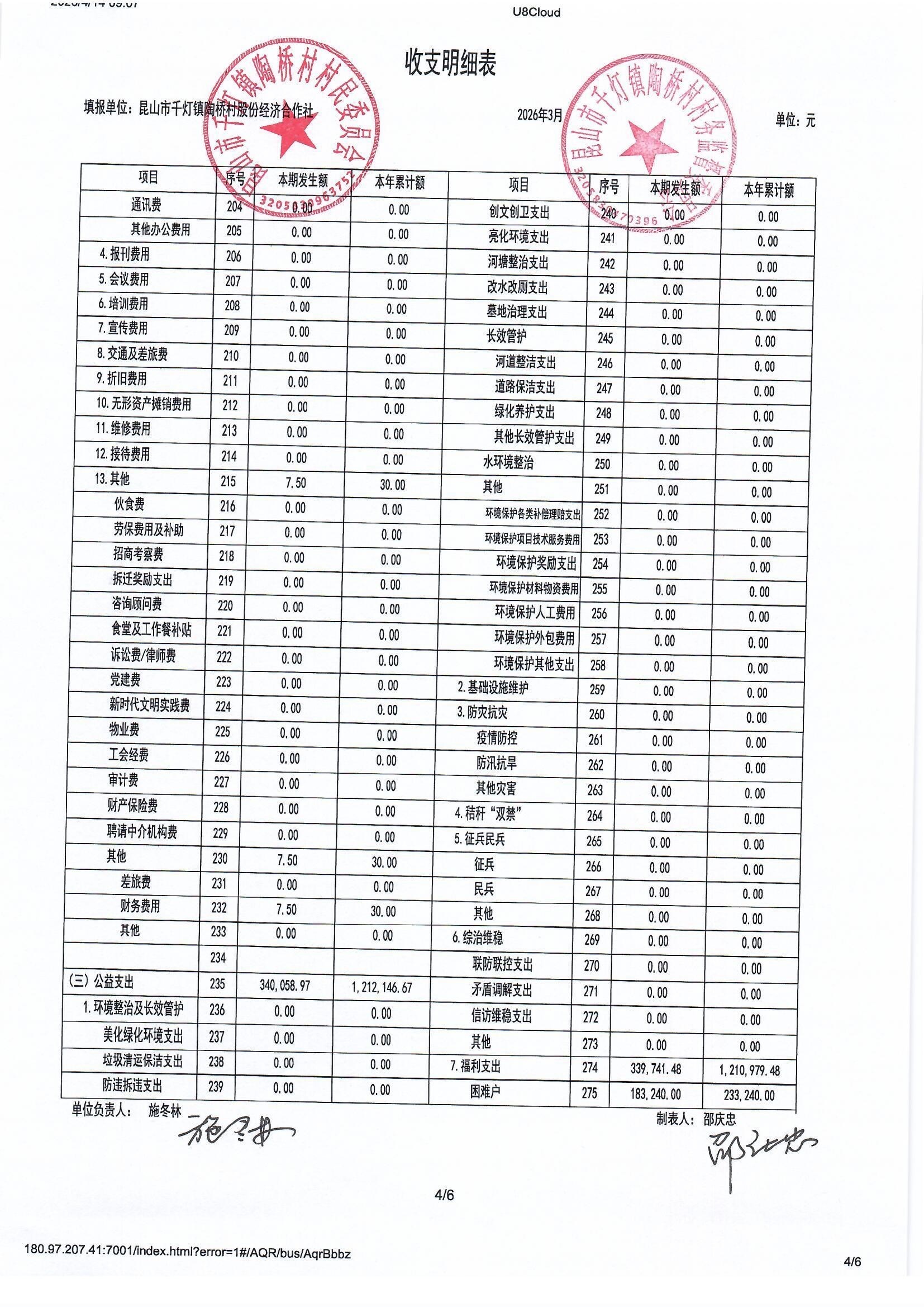 陶桥村股份经济合作社2026年3月财务公开内容:
