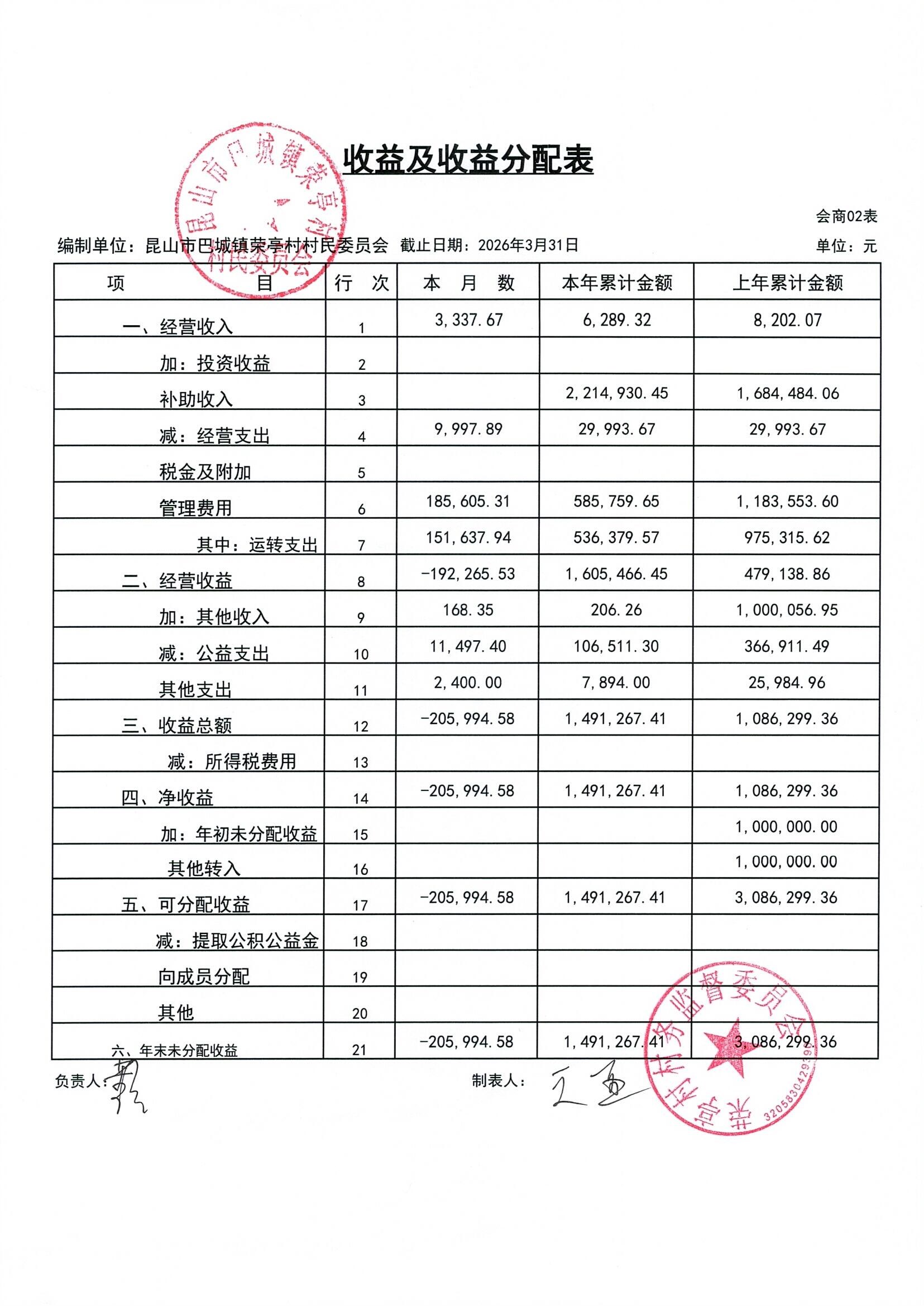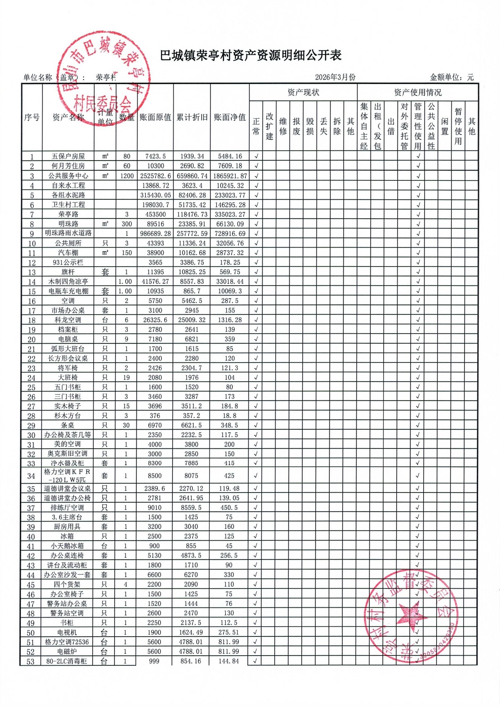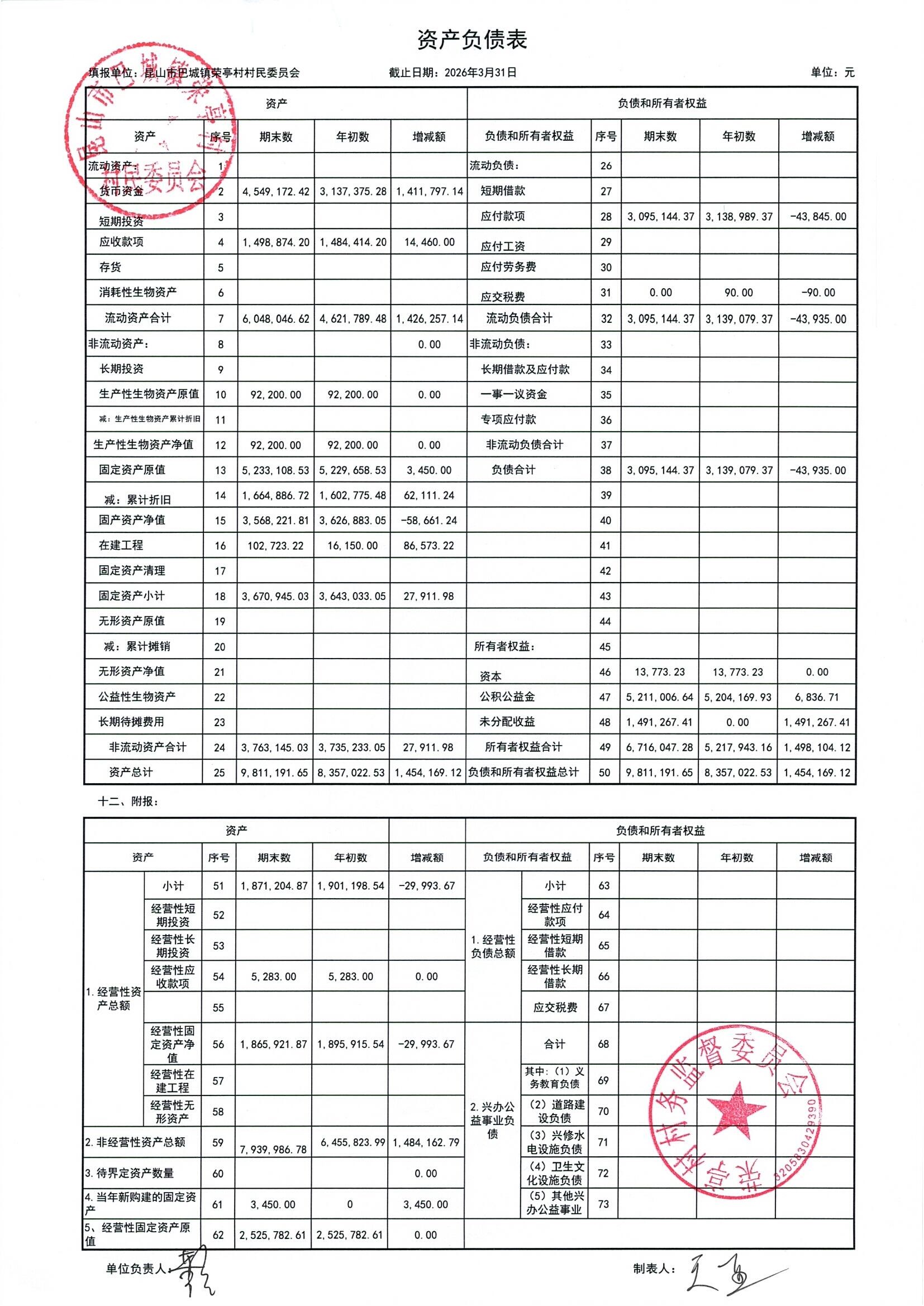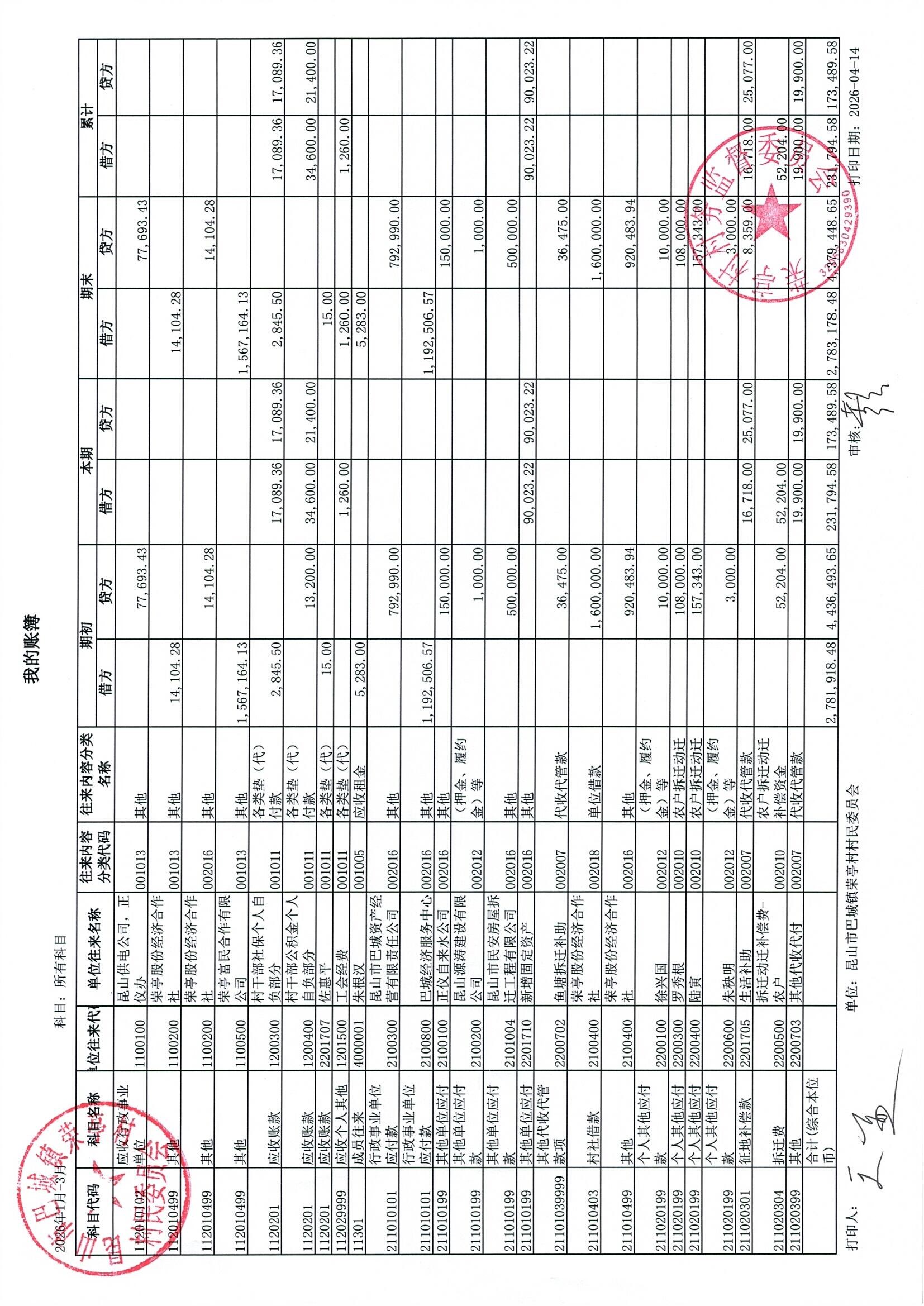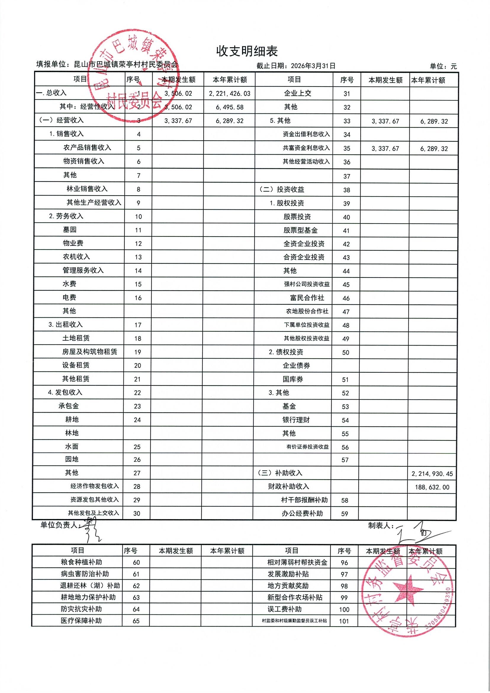 荣亭村2026年3月份财务公开
