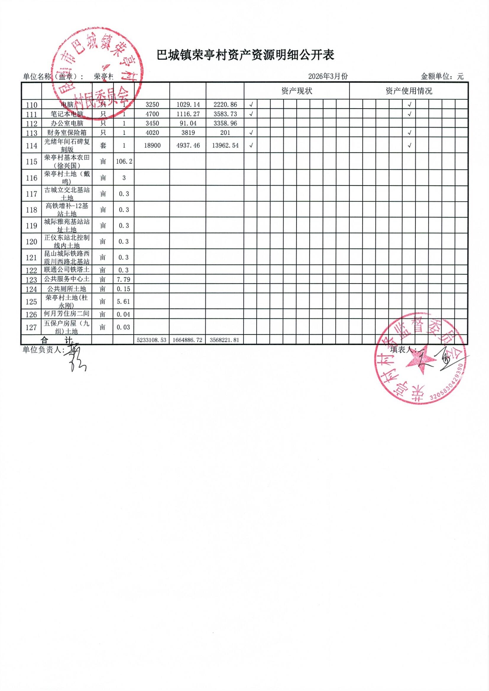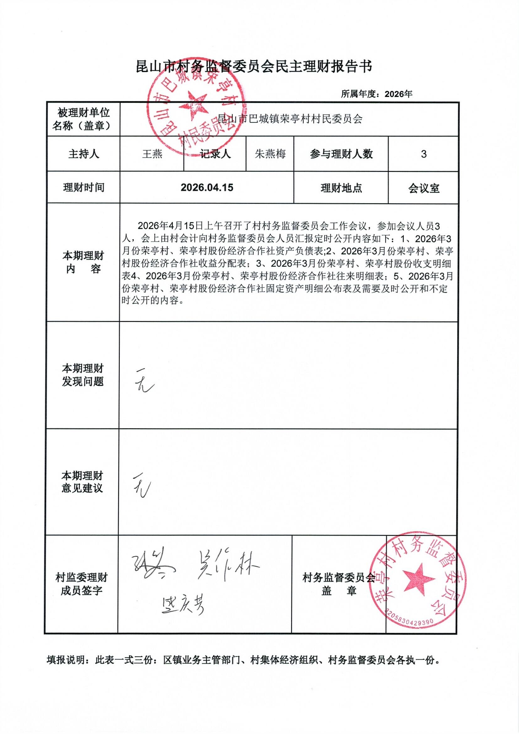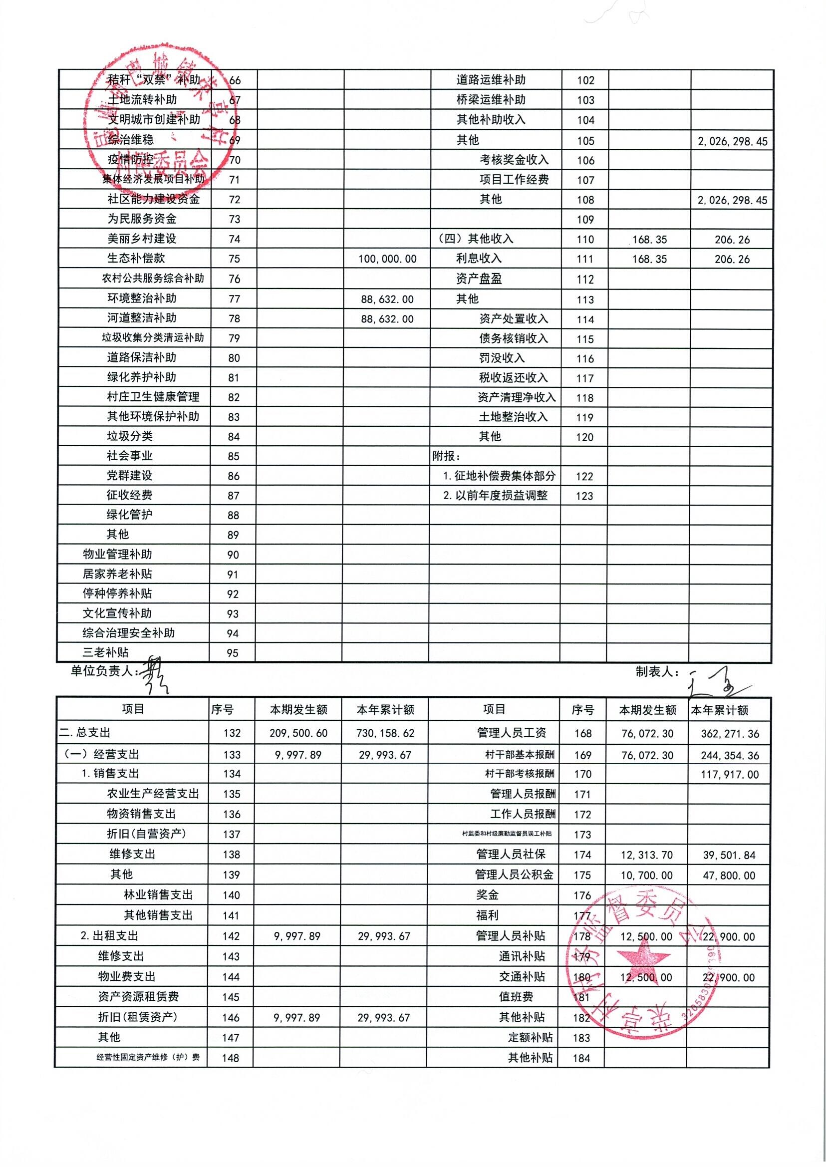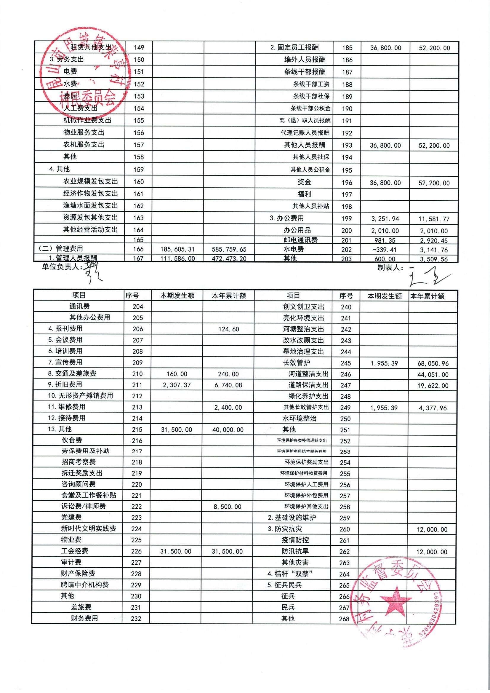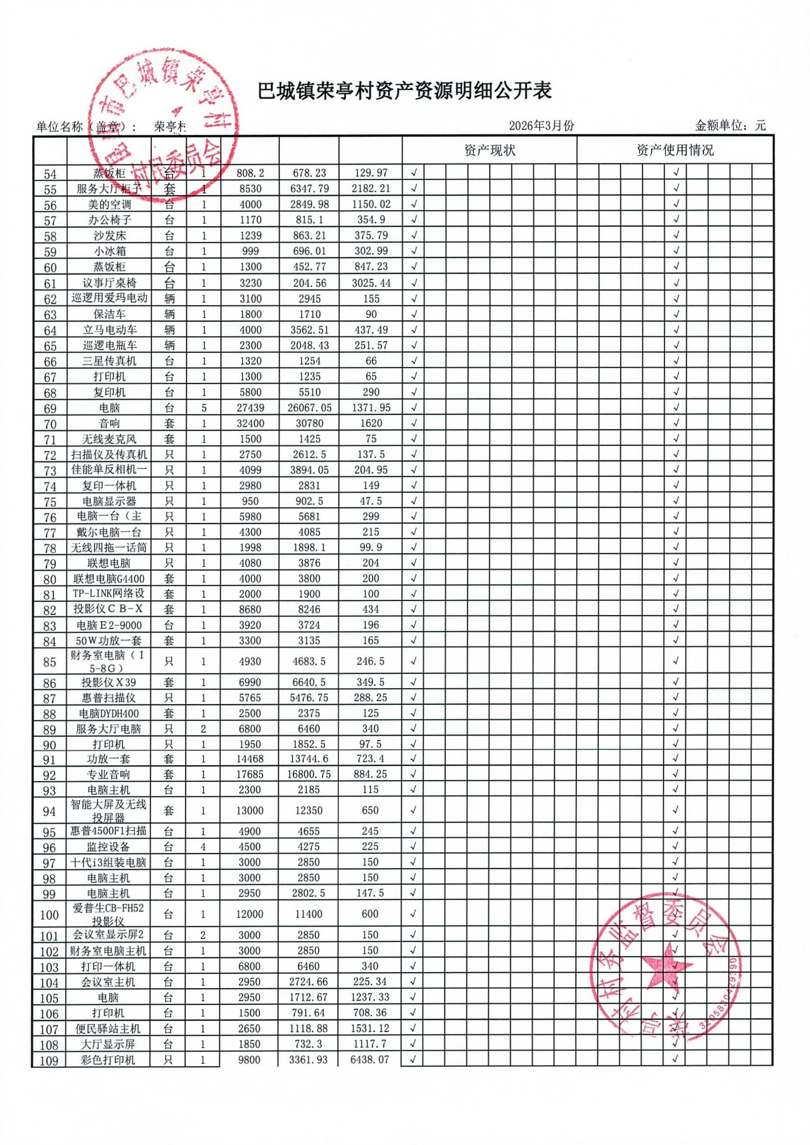 荣亭村2026年3月份财务公开