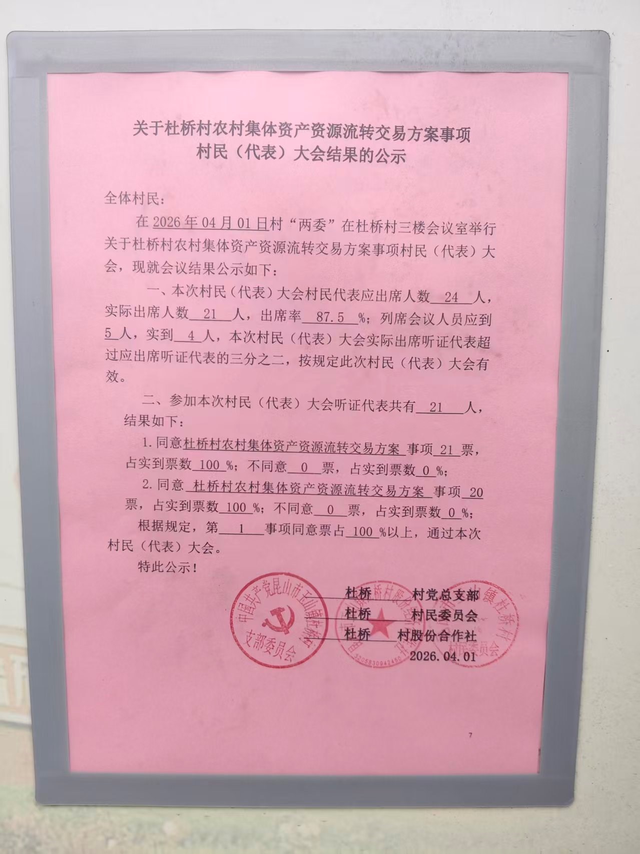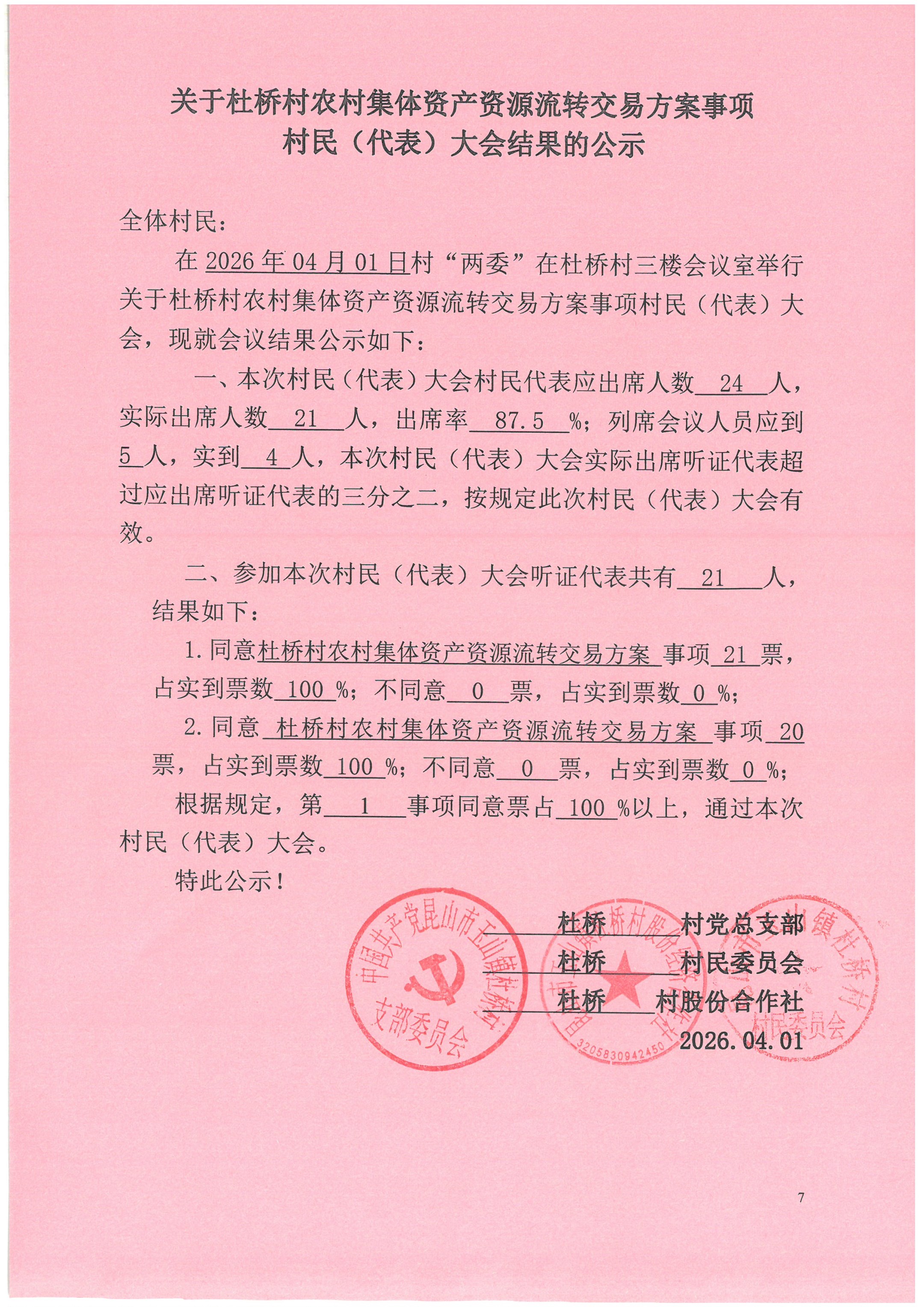 关于杜桥村农村集体资产资源流转交易方案决策听证结果的公示