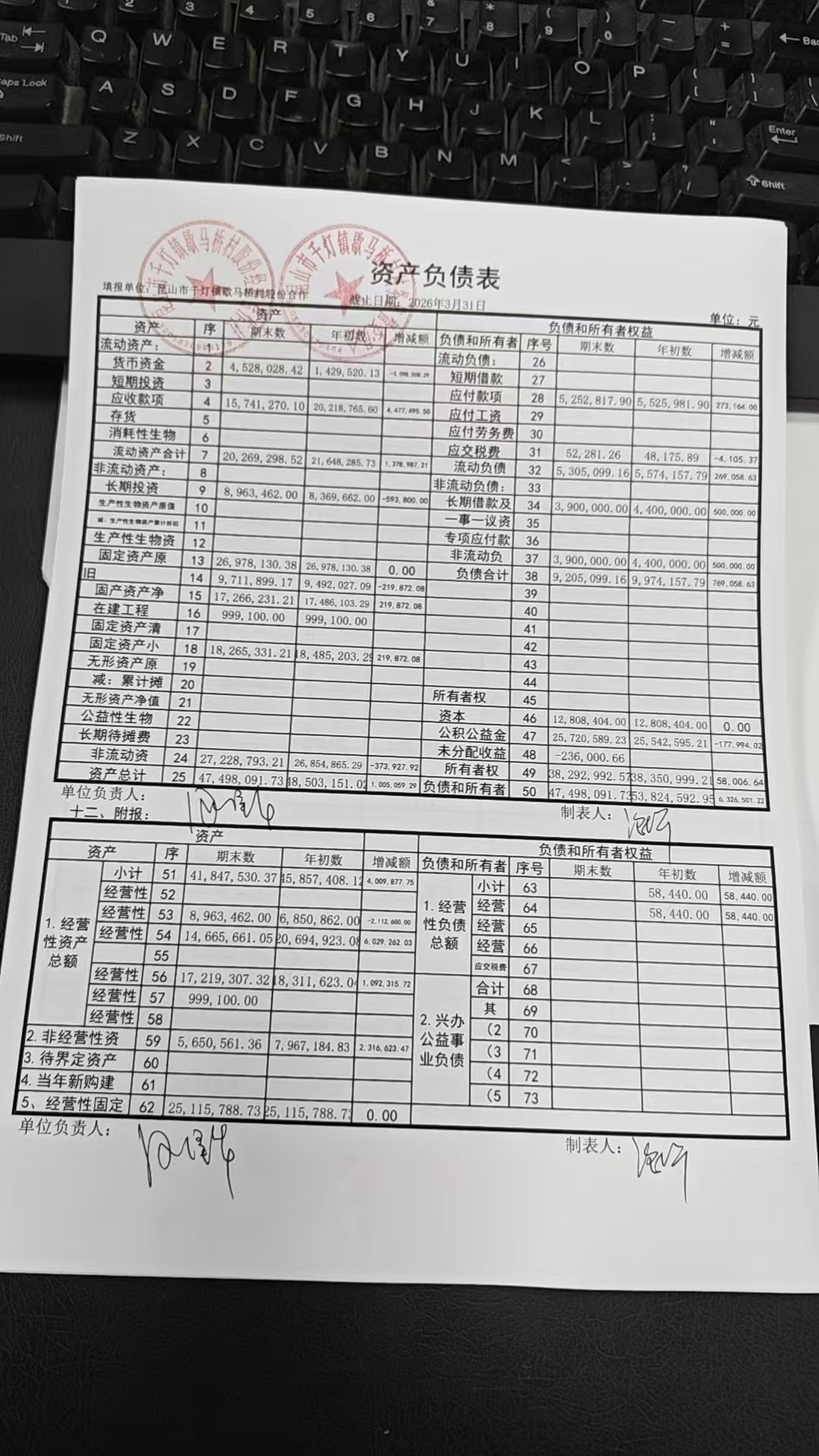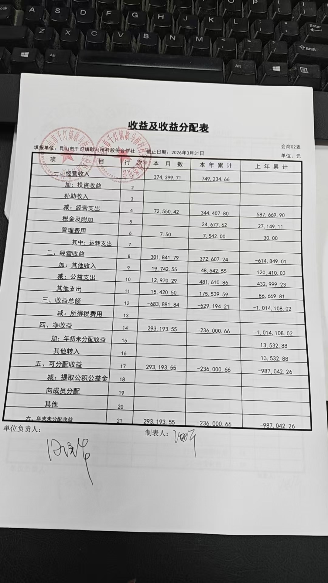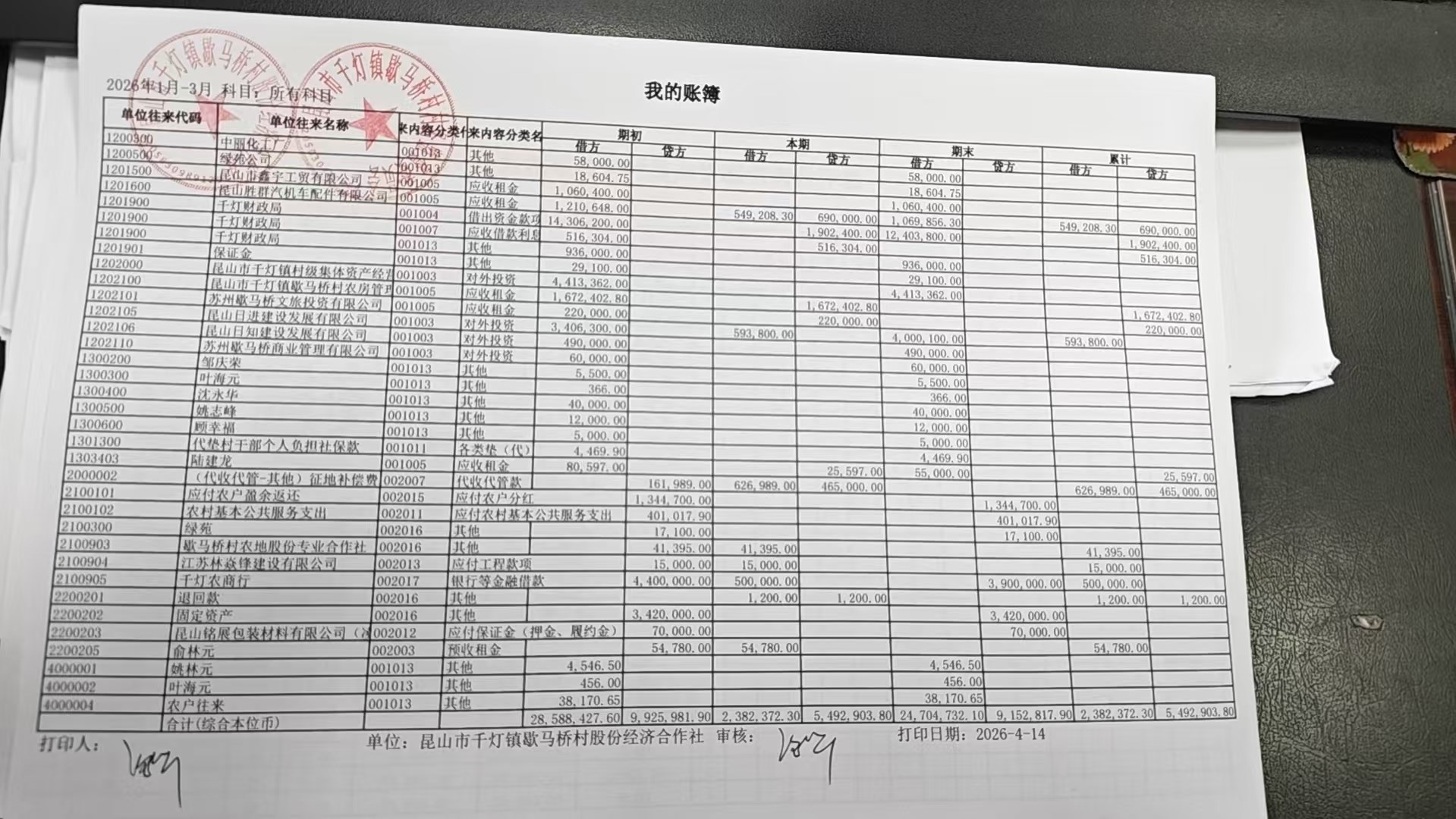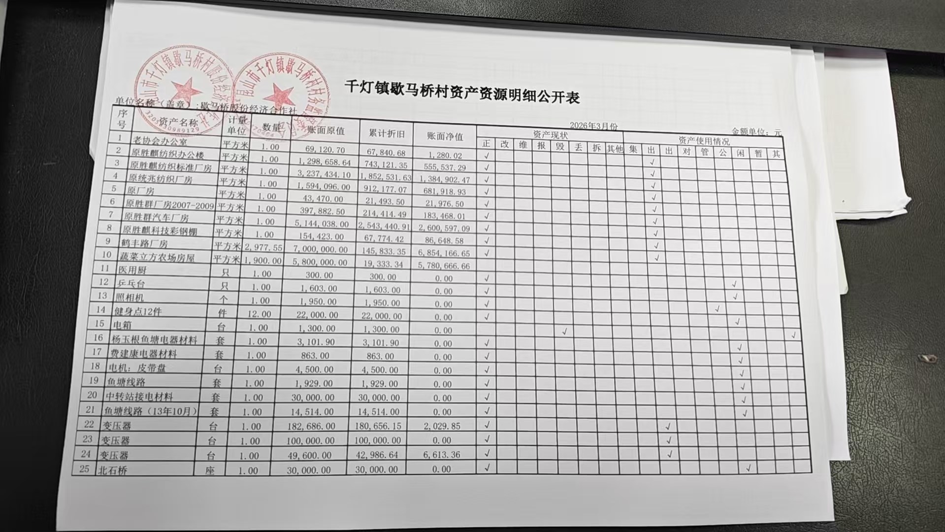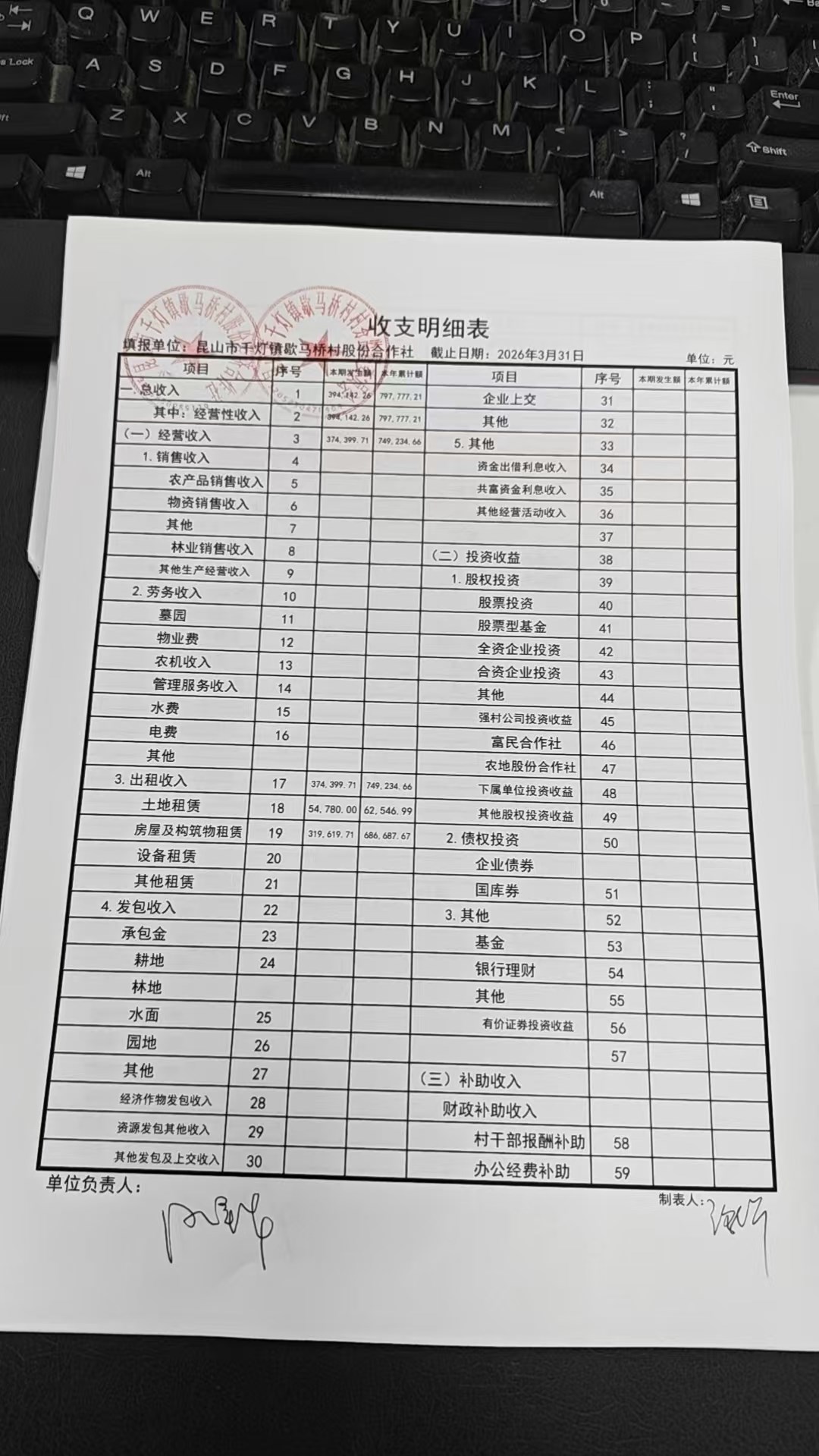 2026年3月份歇马桥村股份经济合作社财务公开