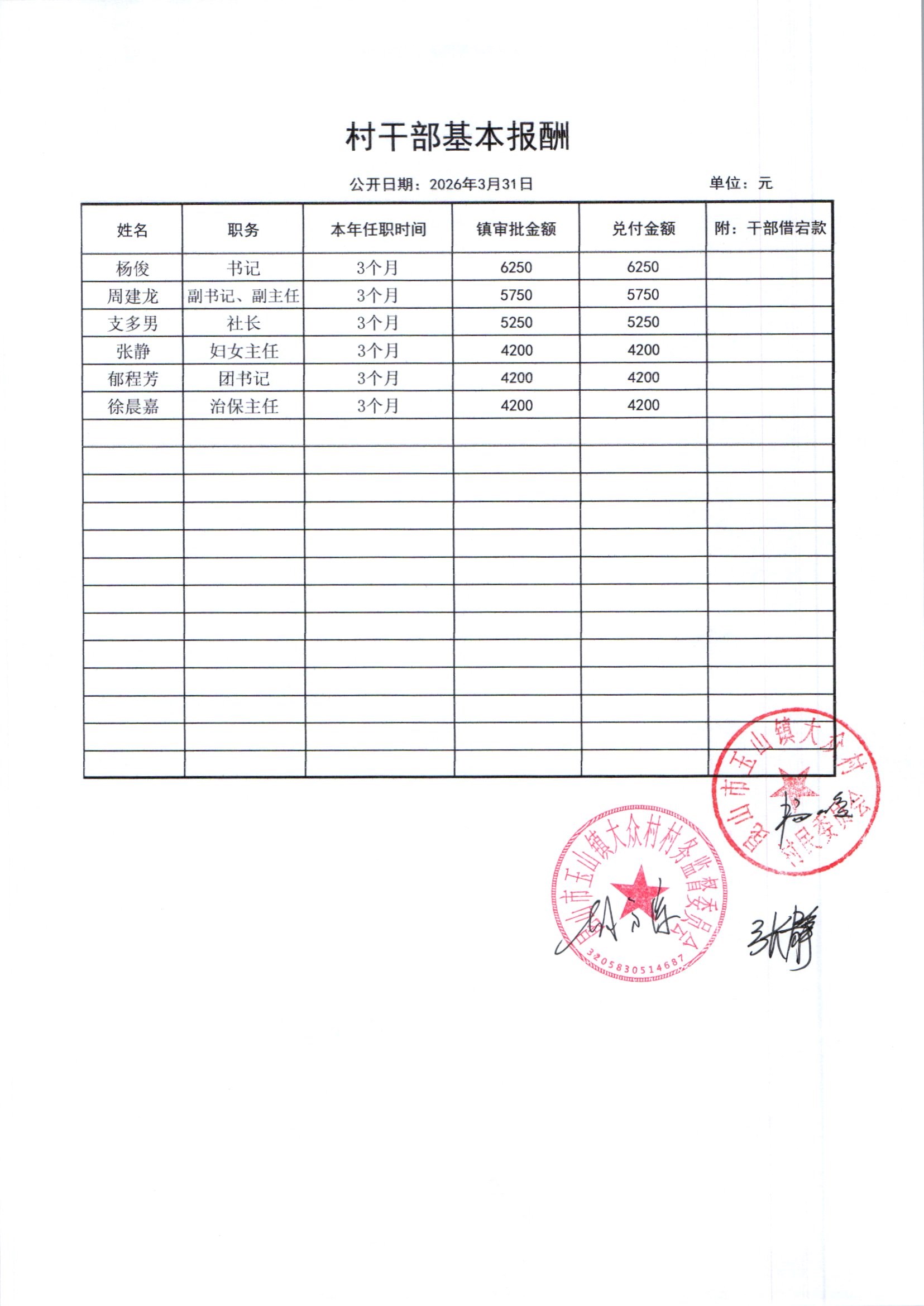 大众村2026年3月份村干部基本报酬公开
